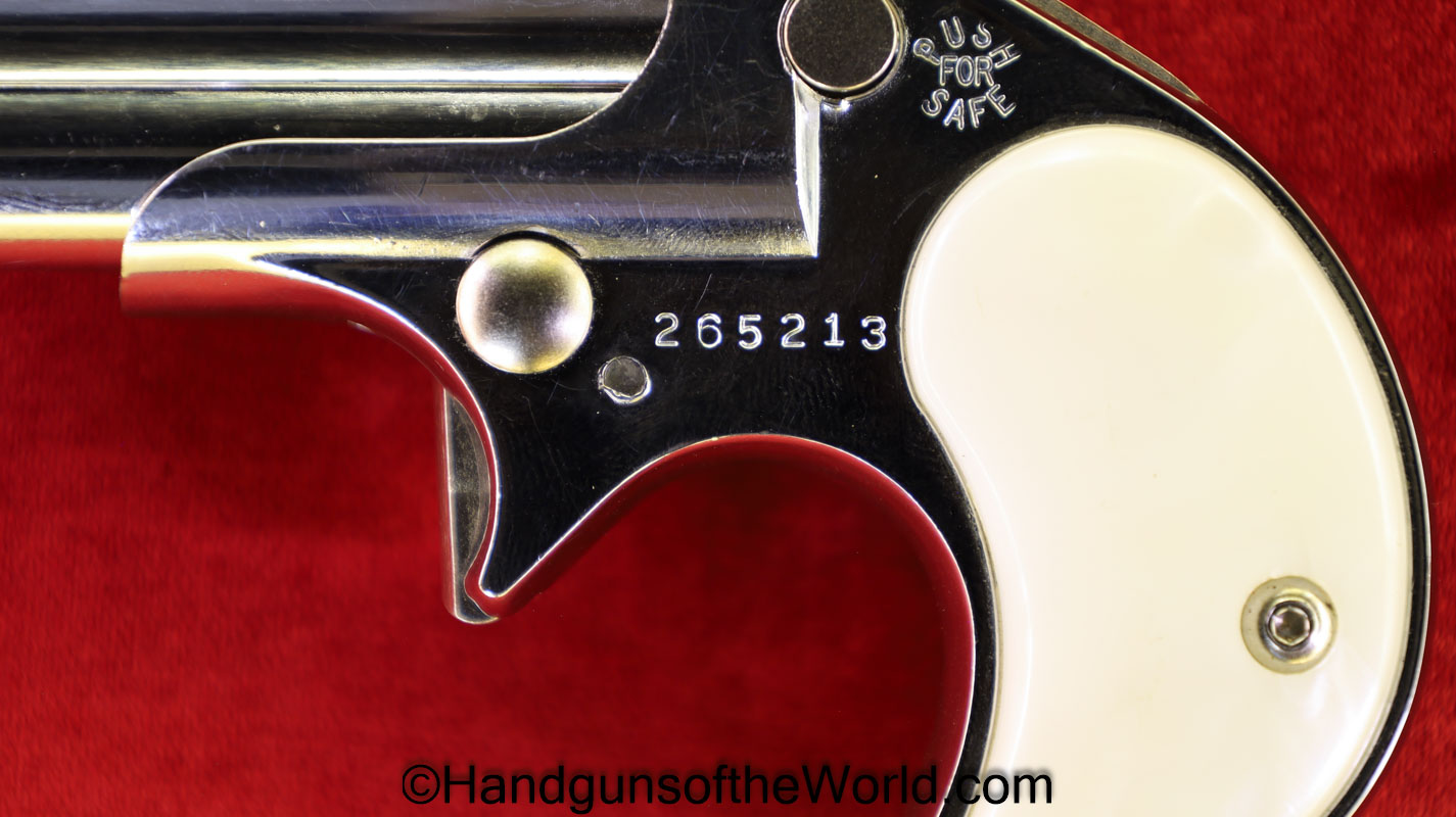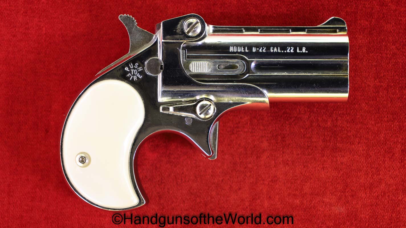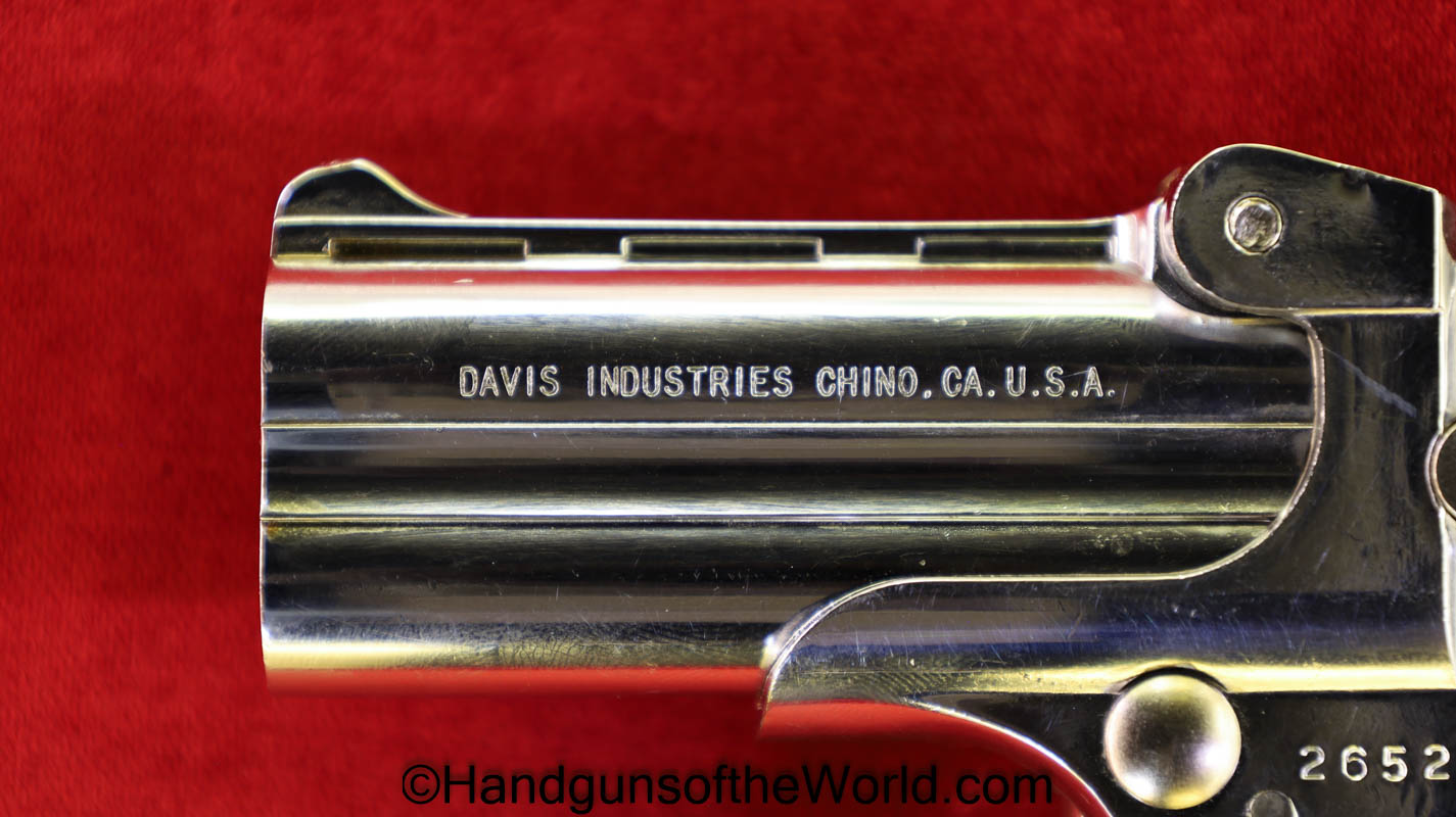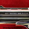Davis D-22 Over & Under derringer, .22lr. This has 2 1/2″ barrels and off-white plastic grips. this has 99+% factory nickel and the bores are VG+.
