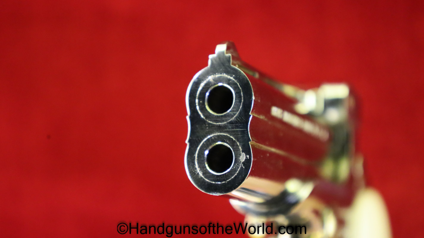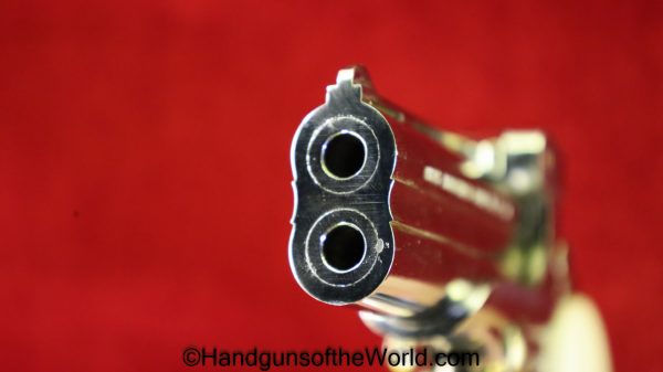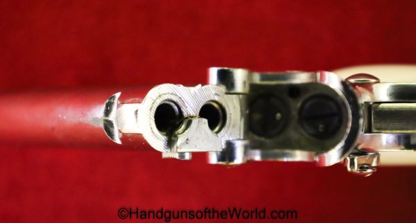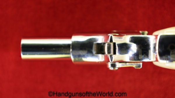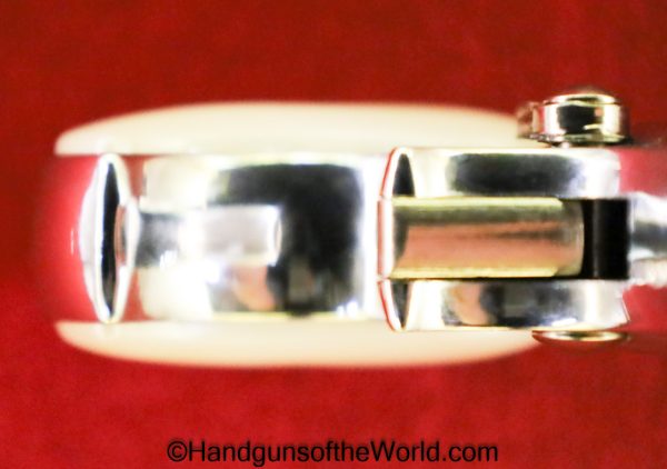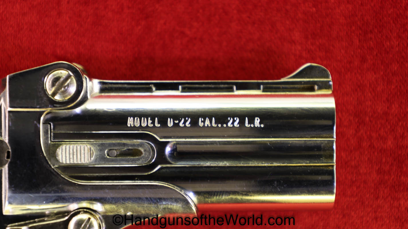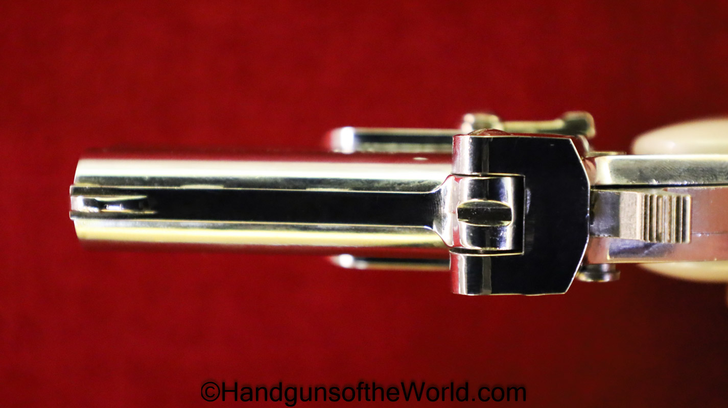 Davis D-22 Over & Under derringer, .22lr. This has 2 1/2″ barrels and off-white plastic grips. this has 99+% factory nickel and the bores are VG+.