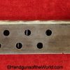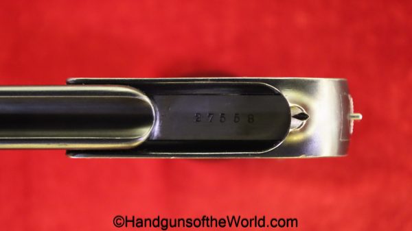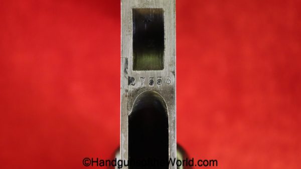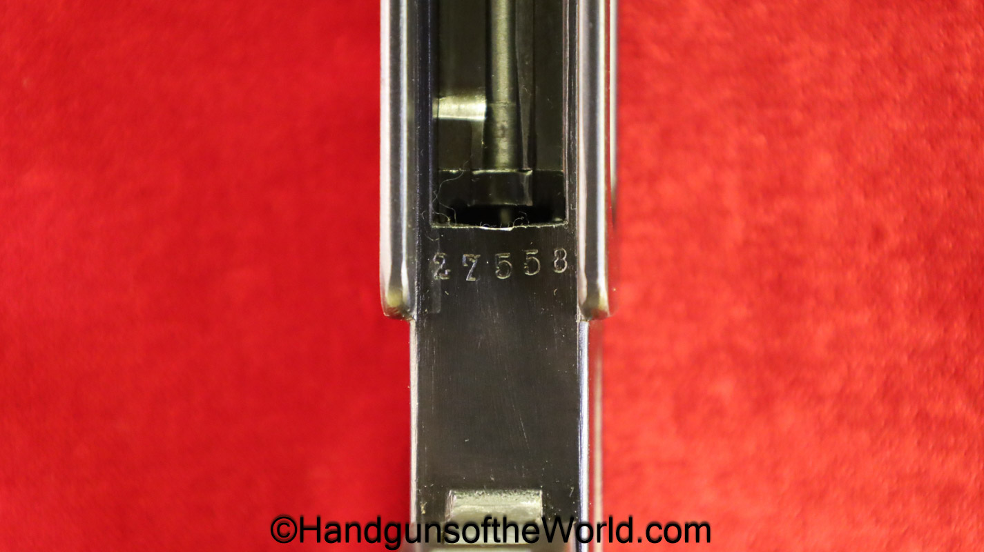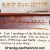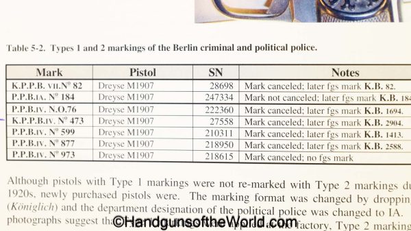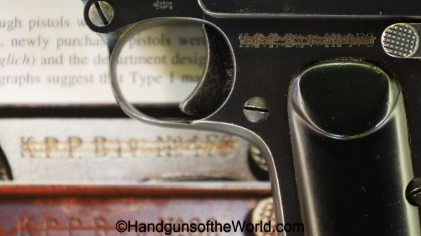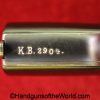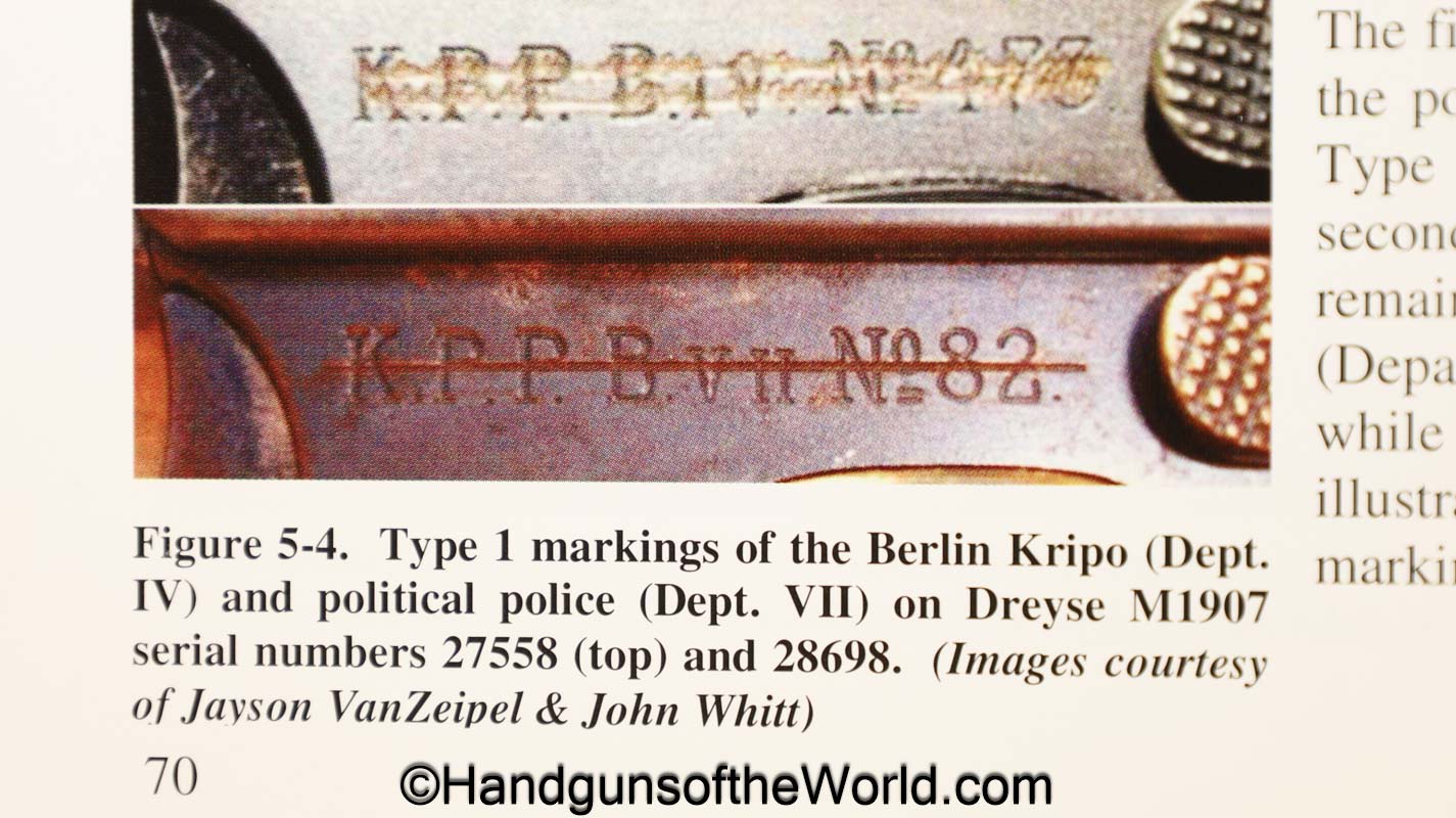 Dreyse 1907, 7.65mm. This is marked KPPB IV No473-lined out on the left side of the frame and is again marked KB 2904 on the front strap=Krimminal Berlin. This has arsenal replaced smooth hard rubber grips without any logo. The blue rates about 98% and the bore is excellent. This exact marking is pictured in History Writ in Steel Book page 70.