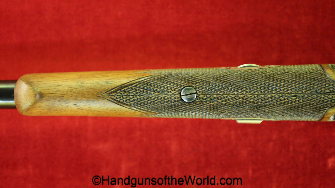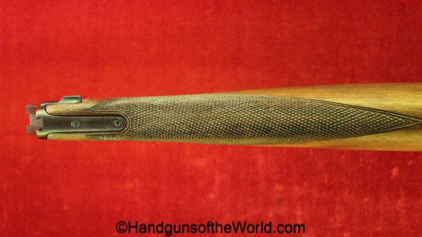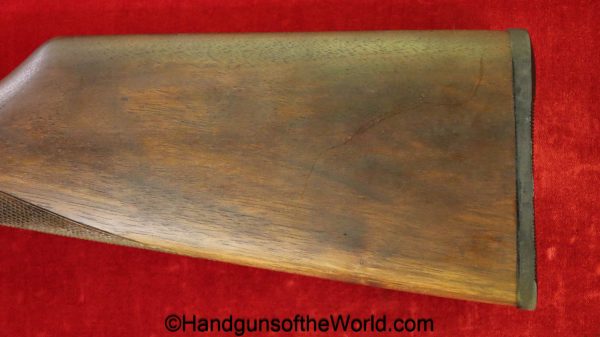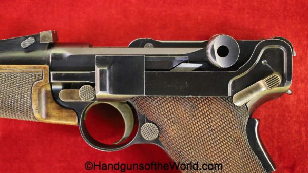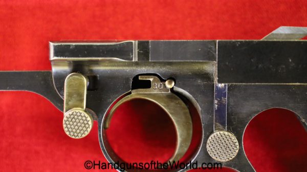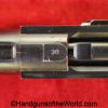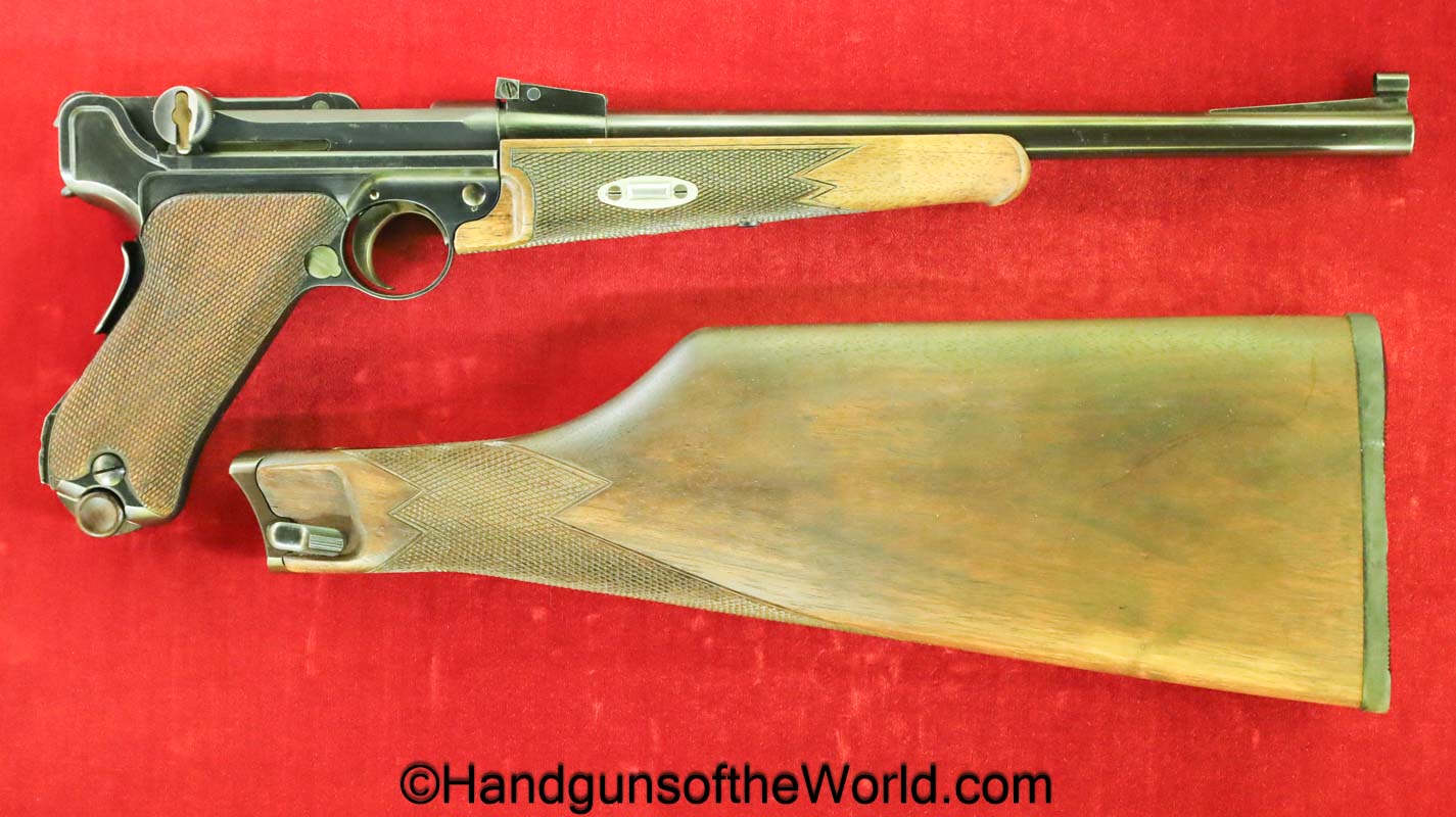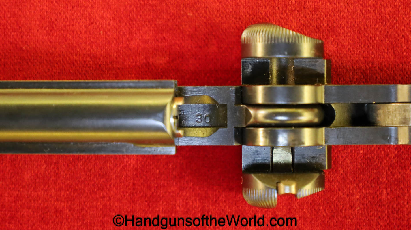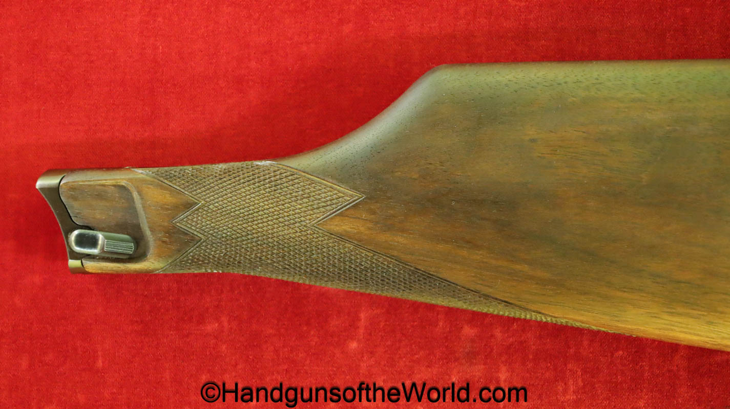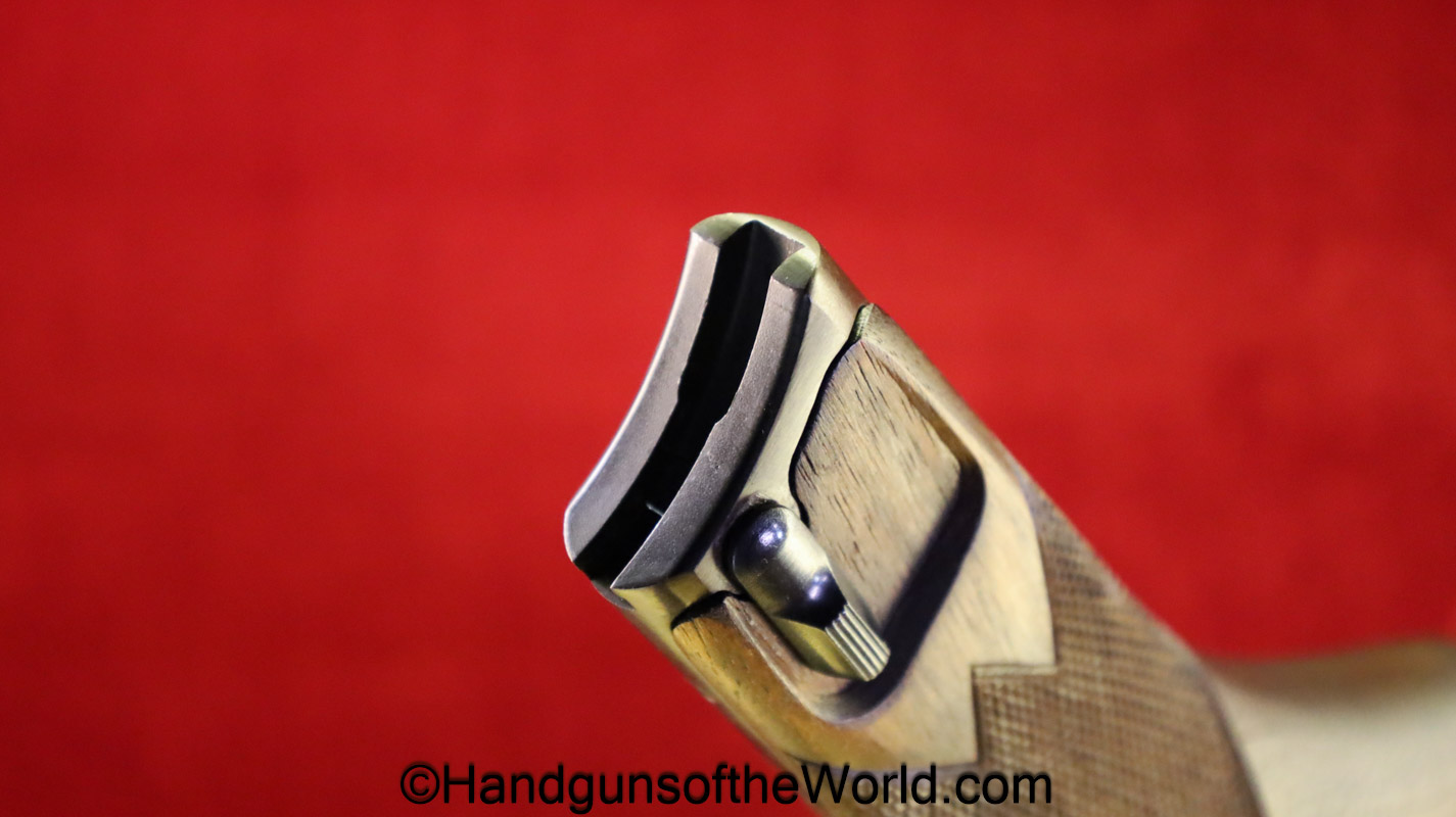DWM 1902 Old model Carbine. 7.65 Parabellum (30 caliber). This has an 11 7/8″ barrel, and has all matching numbers with the grip safety renumbered to match. The wooden forearms shows a screw, and has been sanded/repaired. This has 99% of an old refinish and the bore is VG++. A proper style, non factory wooden shoulder stock completes this set.
