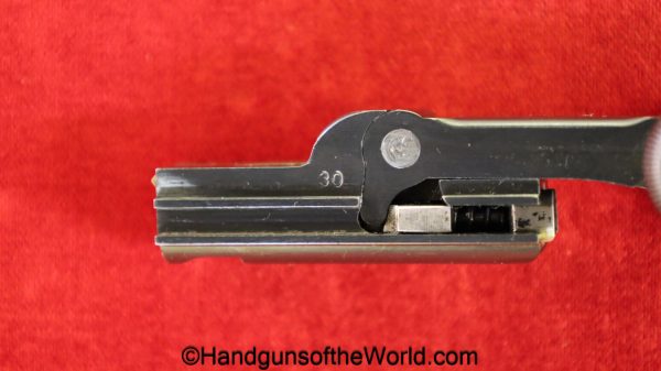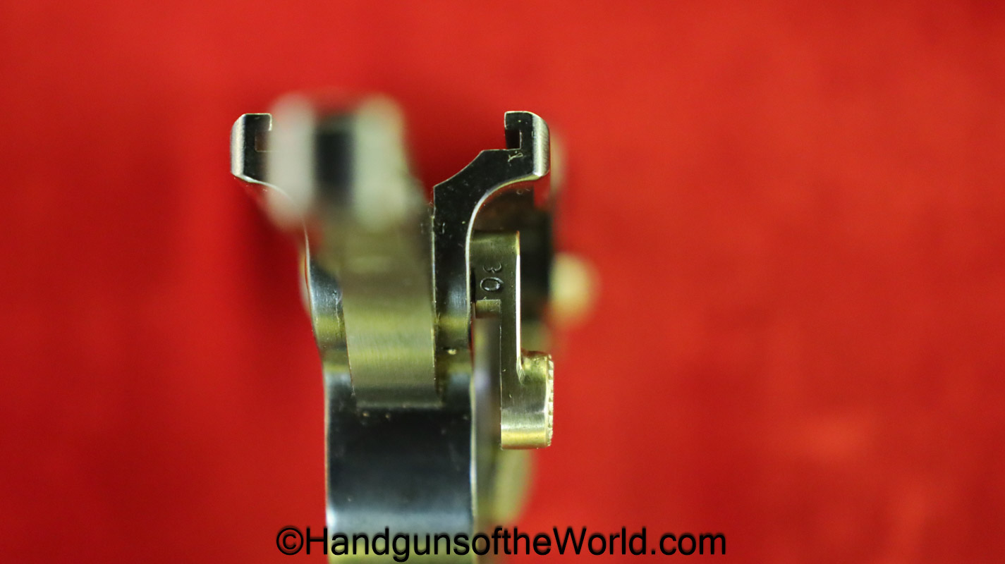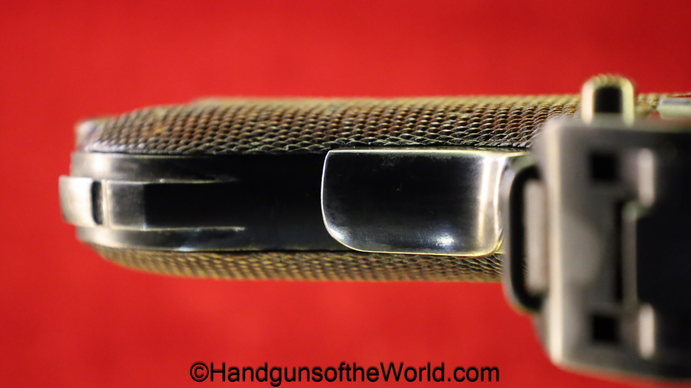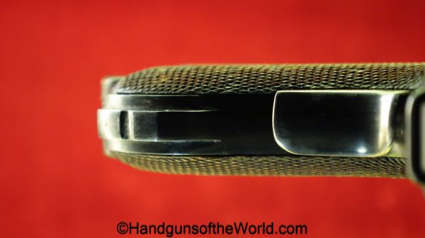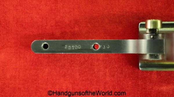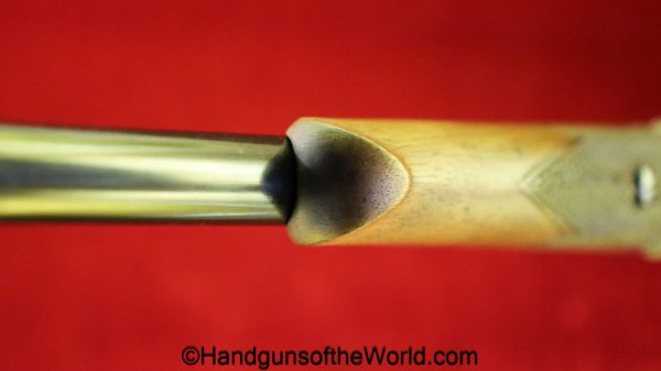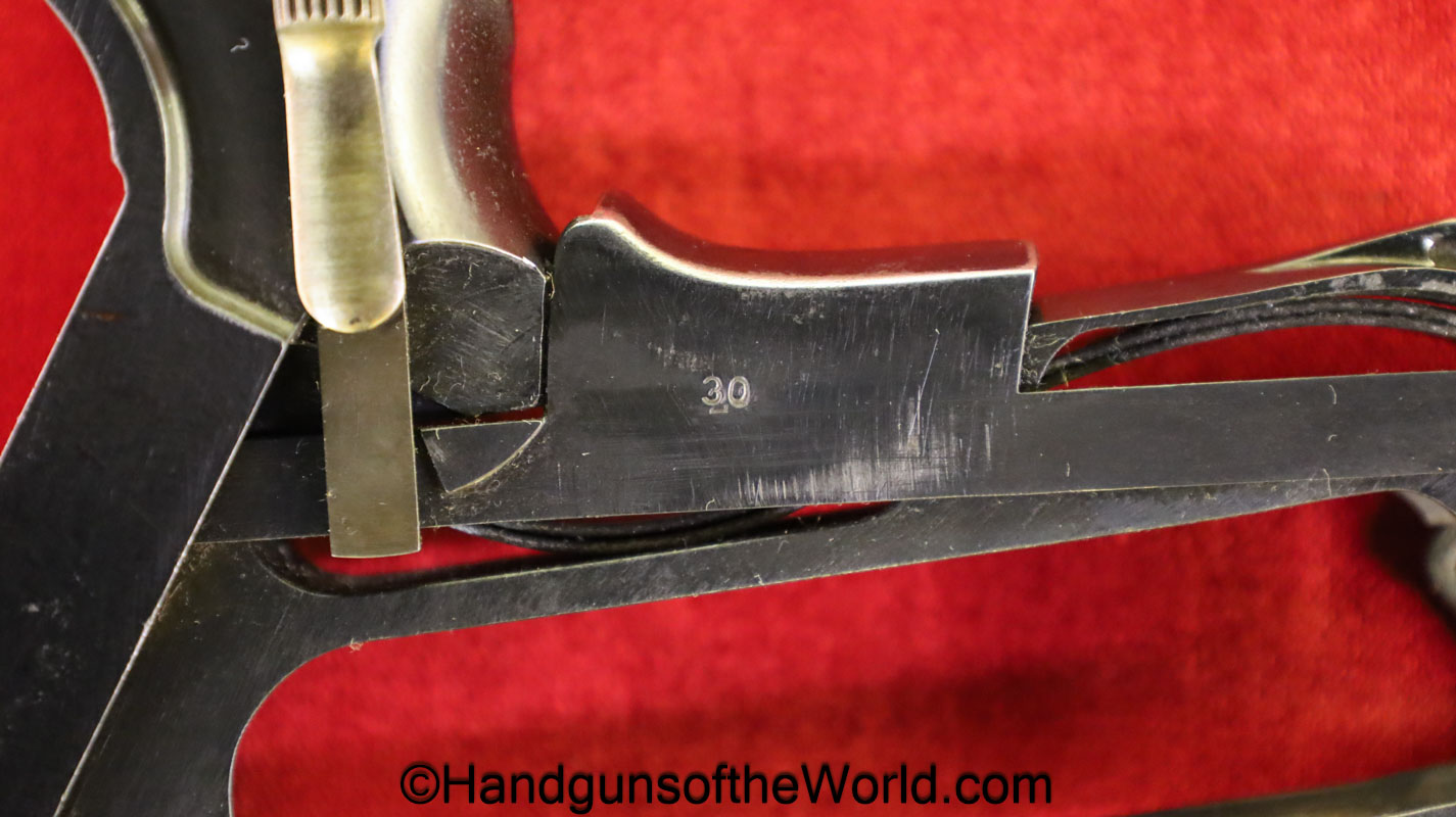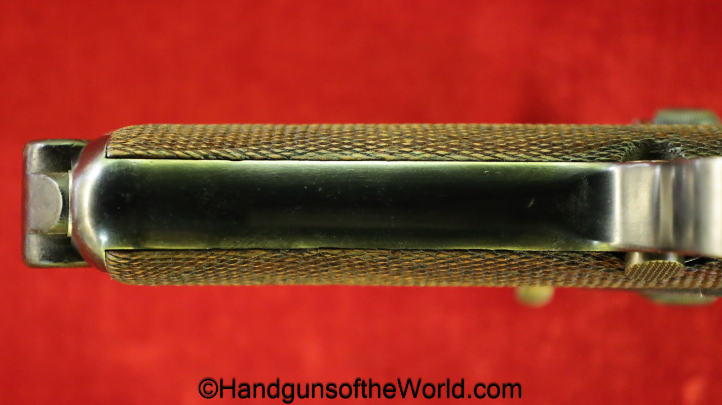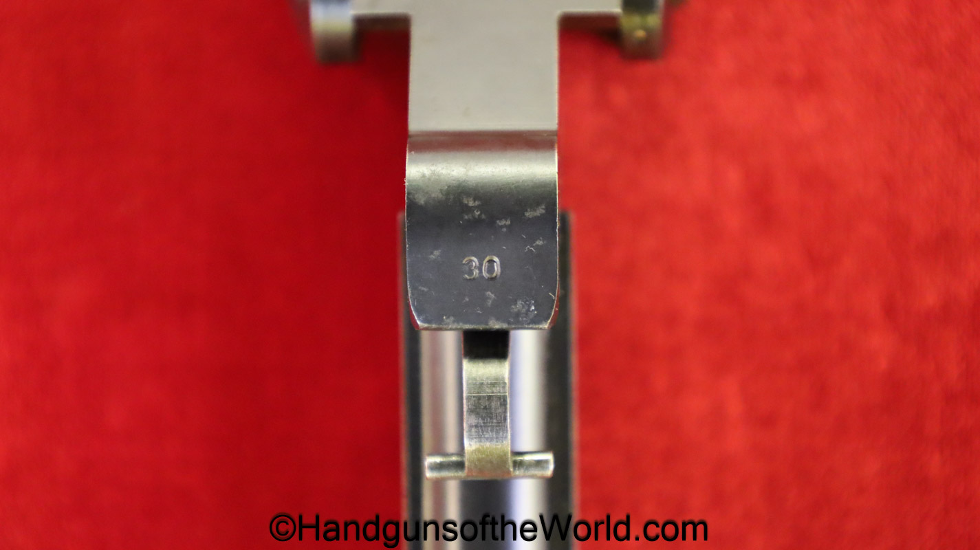 DWM 1902 Old model Carbine. 7.65 Parabellum (30 caliber). This has an 11 7/8″ barrel, and has all matching numbers with the grip safety renumbered to match. The wooden forearms shows a screw, and has been sanded/repaired. This has 99% of an old refinish and the bore is VG++. A proper style, non factory wooden shoulder stock completes this set.