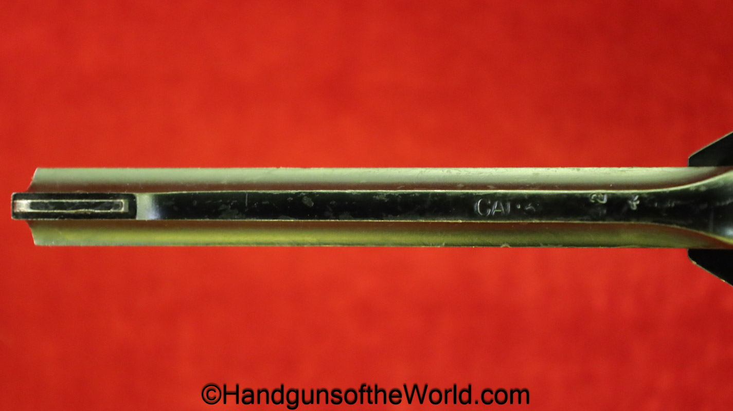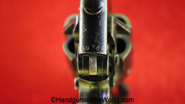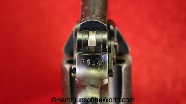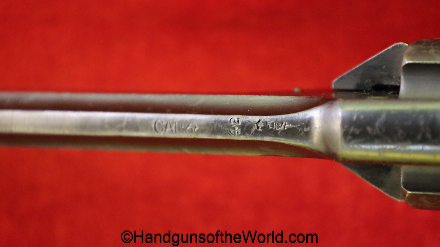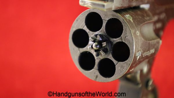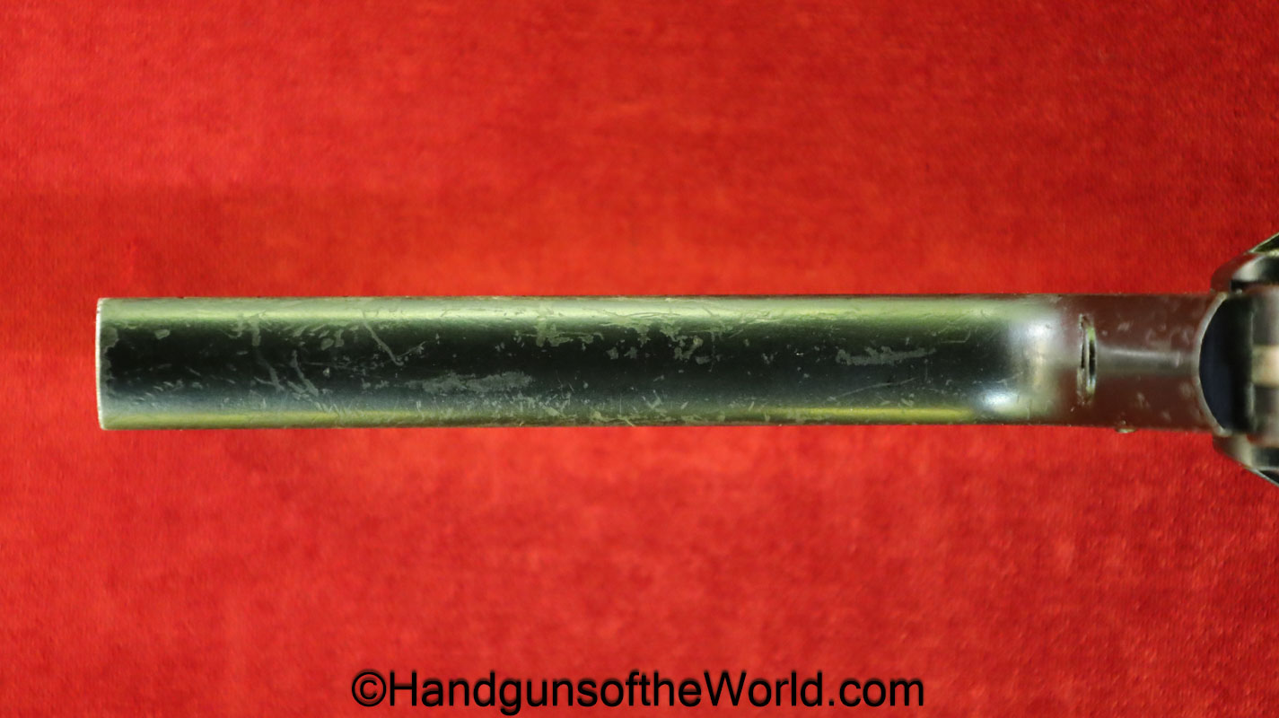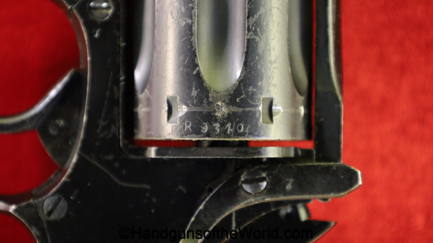 Enfield No2, MKI**, .38 S&W. This Tankers Model has the 6″ barrel and lined black Bakelite grips with bras disc in the right panel. This is WWII dated 1942 on the top of the barrel. This has all matching numbers and no importer markings. This has 99+% of an arsenal black enamel finish and the bore is excellent.