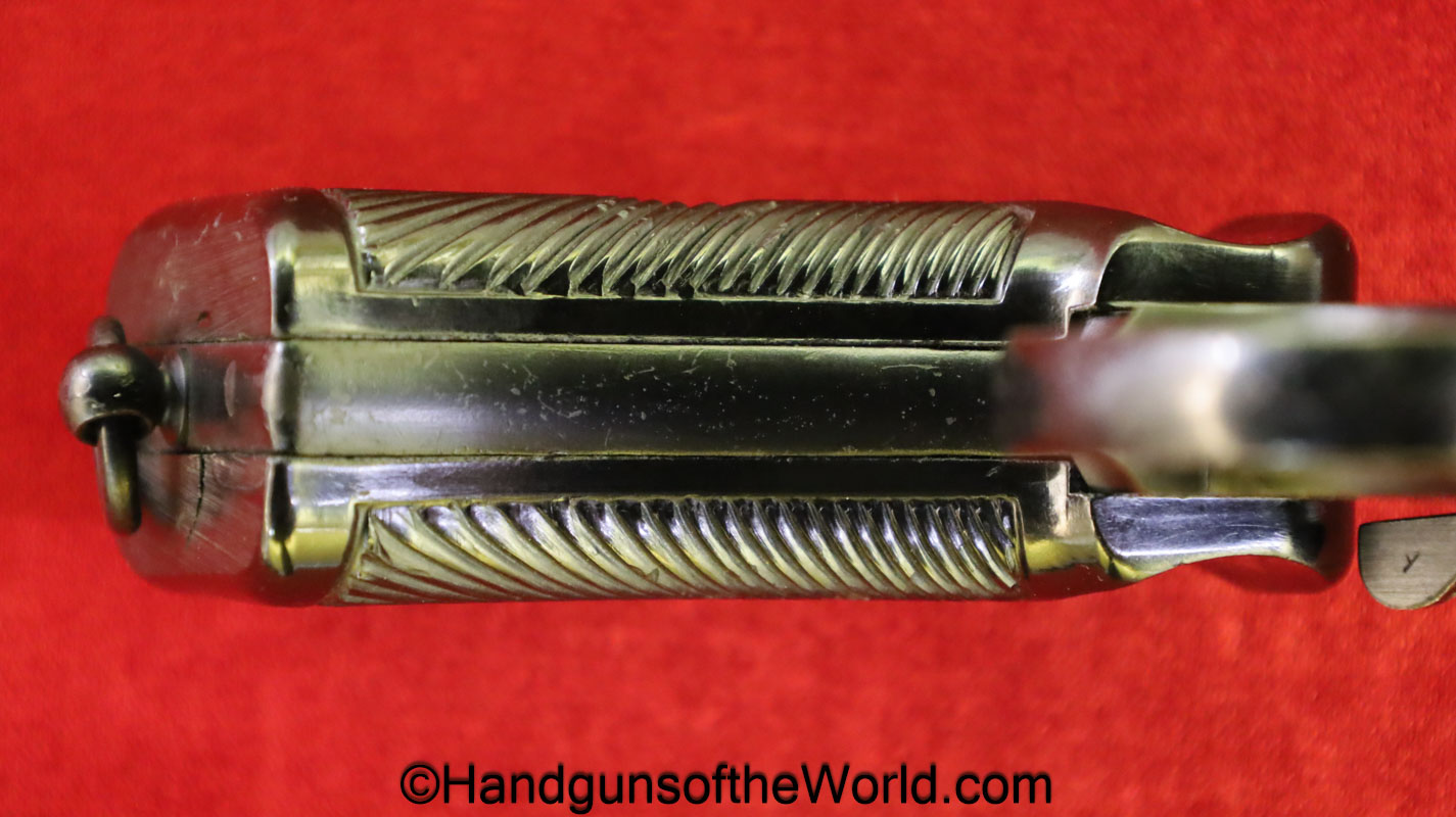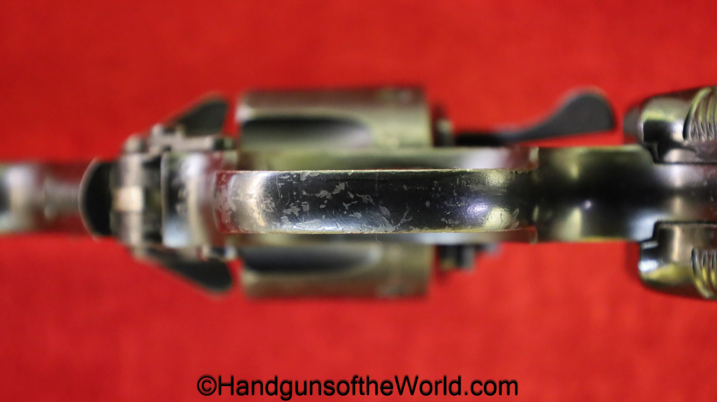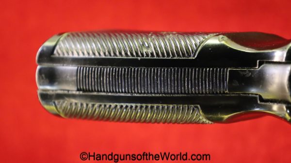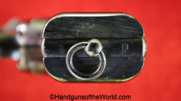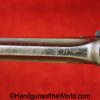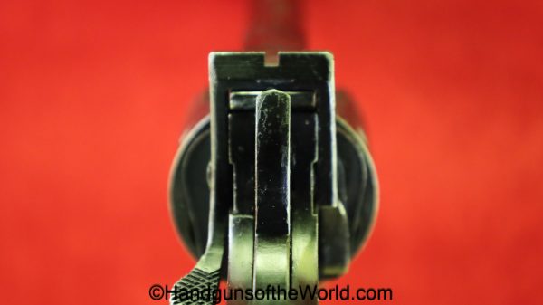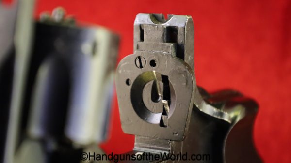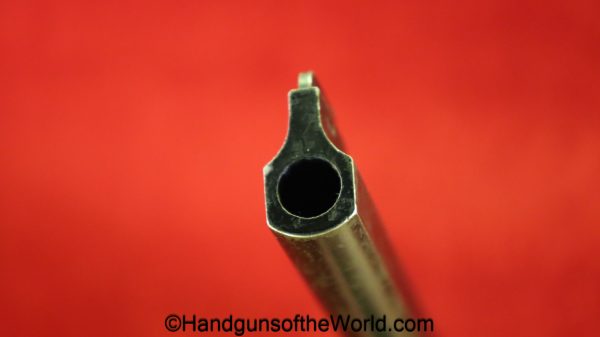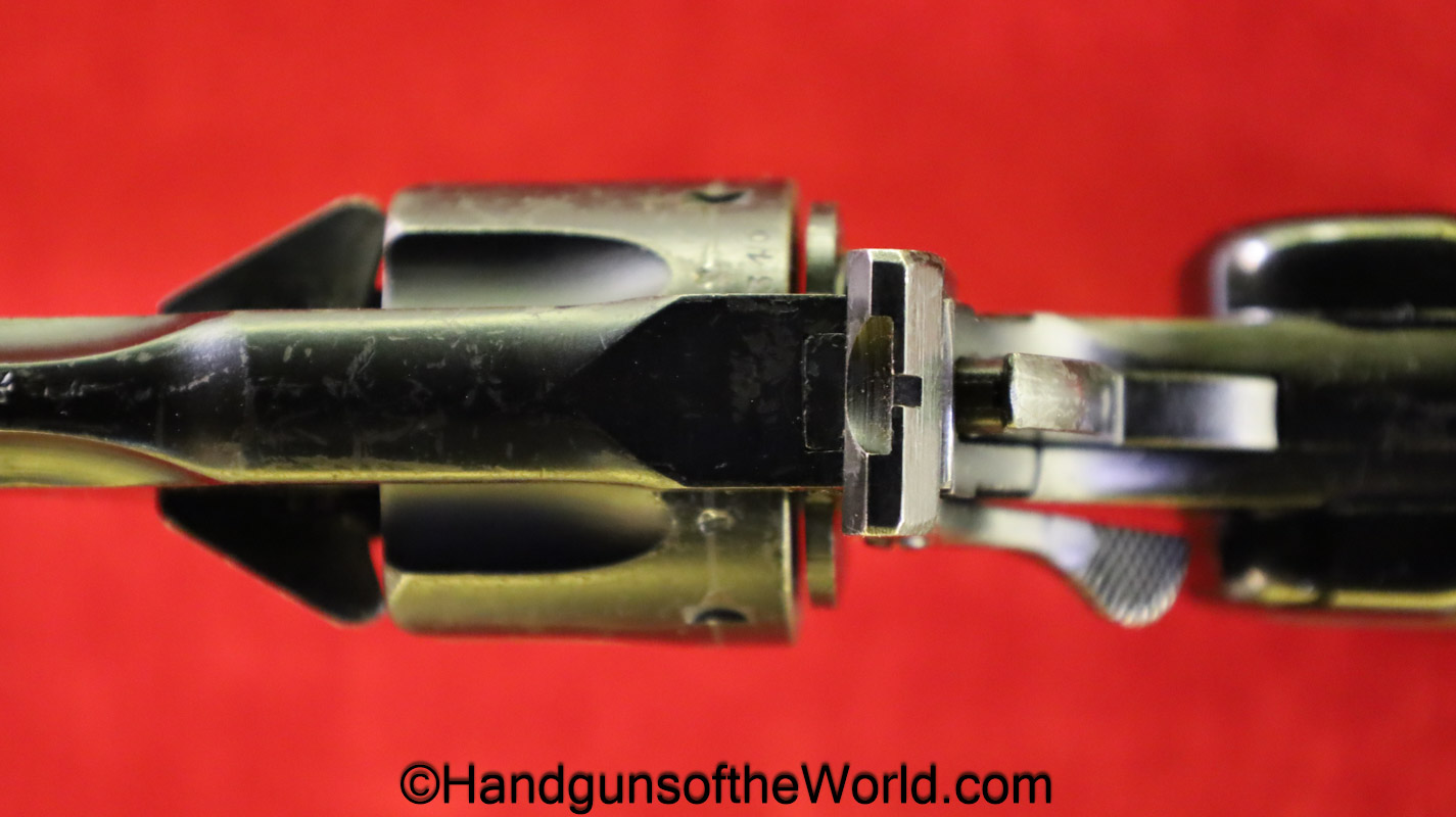 Enfield No2, MKI**, .38 S&W. This Tankers Model has the 6″ barrel and lined black Bakelite grips with bras disc in the right panel. This is WWII dated 1942 on the top of the barrel. This has all matching numbers and no importer markings. This has 99+% of an arsenal black enamel finish and the bore is excellent.