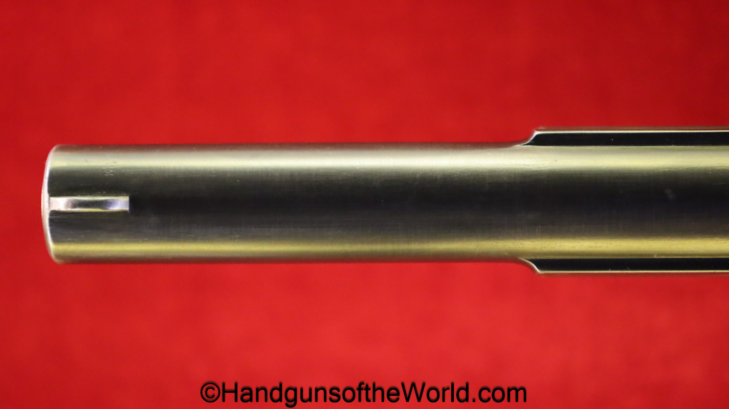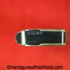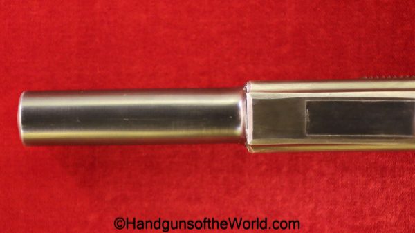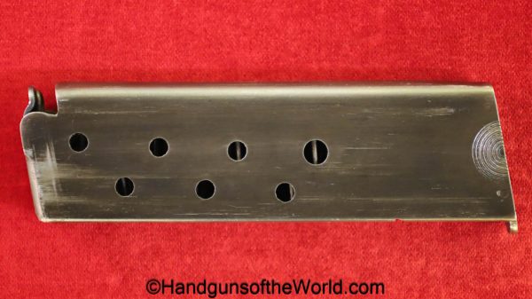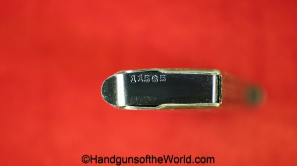 Esperanza y Unceta Campo Giro 1913-16, 9mm. This is Spanish Military proofed on the left rear tang and has the correct checkered walnut grips. This has a matching magazine. This now retains about 90% of a restored blue finish and the bore is VG-VG+.