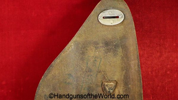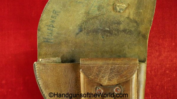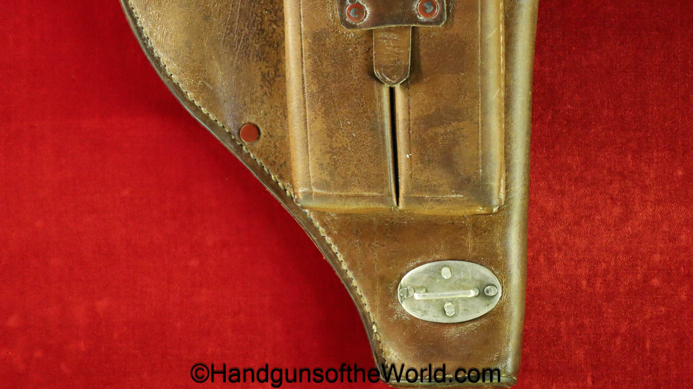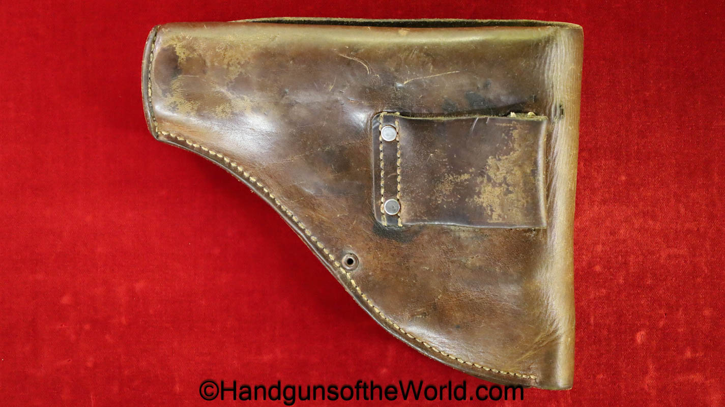 Original Femaru 37M Pistol Holster. This is a Hungarian pattern, brown leather with dual magazine pouches on the front. This has aluminum fittings, and ink stamps inside the lid. Overall VG-VG+.