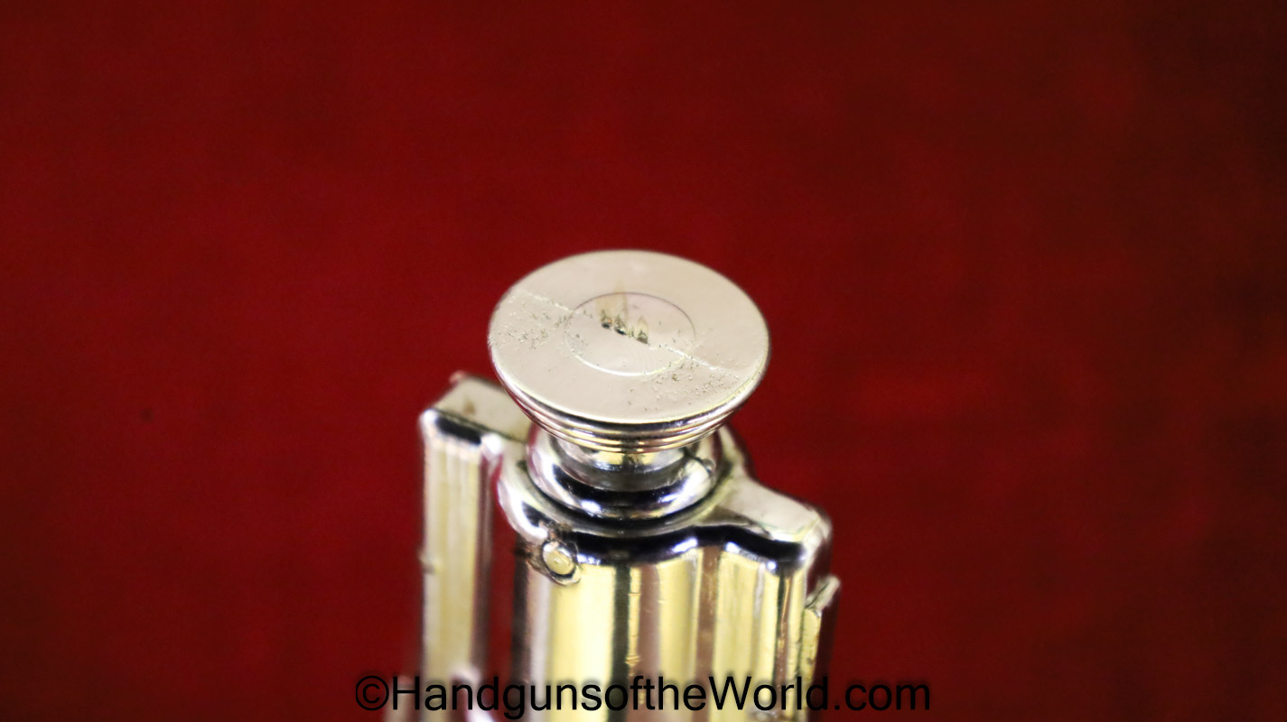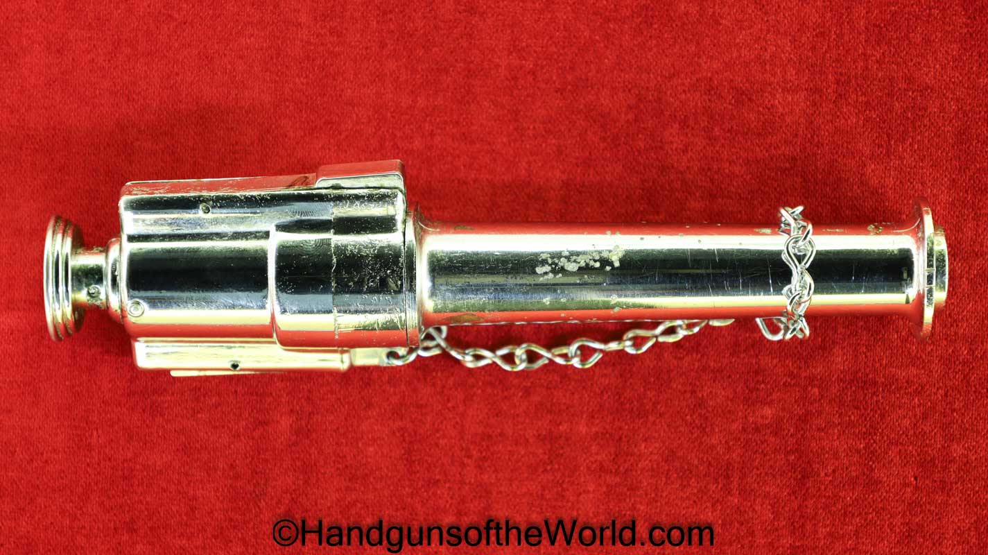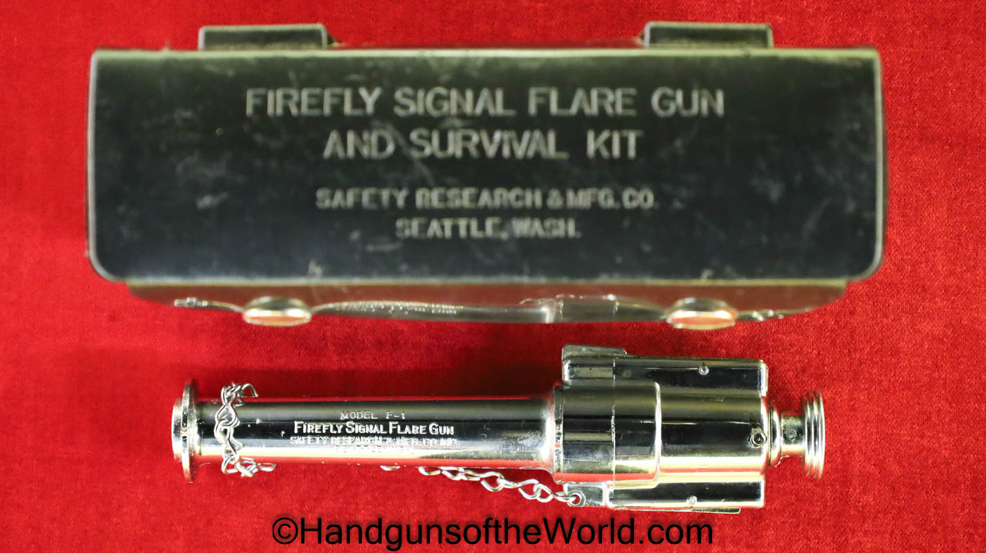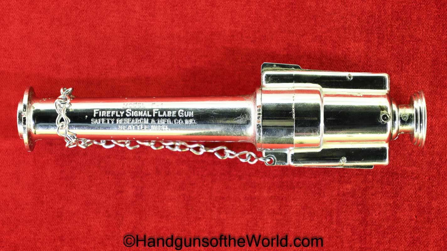 Firefly Signal Flare Gun, Model F-1, .45-70 caliber. This is full chrome and comes with a rubbery black carrying case with 6 red flares. Overall VG-VG+. Non-FFL.