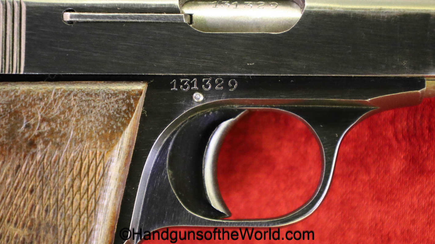 FN 1922 Browning, 7.65mm. This has checkered walnut grips and is WWII German Commercial proofed Eagle N only on the frame and slide. This also has the proper triangle proof on the rear frame. This has all matching numbers, about 95% blue and the bore is excellent.