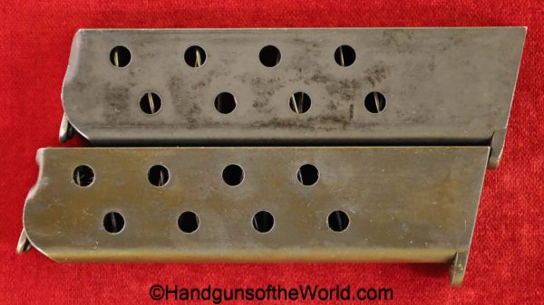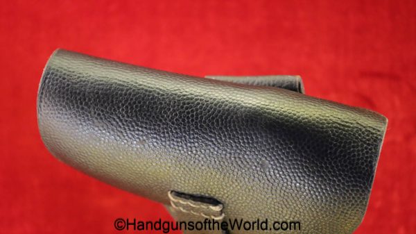 FN Browning 1922, 7.65mm. This is German WWII WaA140 proofed overall and has the late black Bakelite grips with FN Logos. This has all matching numbers with 99% blue and an excellent bore. This full rig includes a black leather pebble grain holster dated 1944 and a spare magazine. This also has its original WWII Capture paper included.