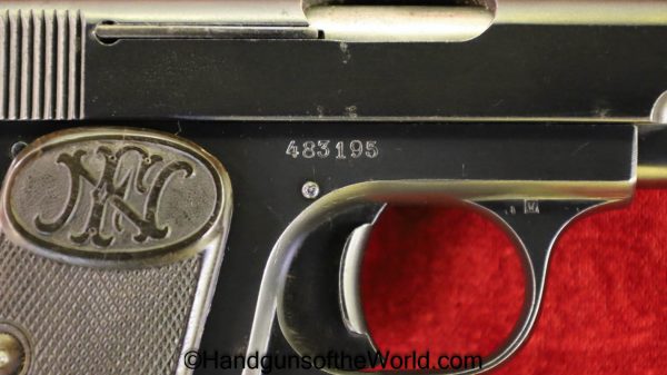 FN 1906 Browning, 6.35mm. This has the correct FN logo horn grips. The frame, slide and barrel have matching numbers. The blue rates about 99% and the bore is excellent.