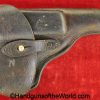 FN Browning 1910, 7.65mm. Built in 1937 with FN logo Horn Grips. This was shipped to Japanese firearms dealer Matsuhara in Osaka. This has all matching numbers with about 95% blue reaming and the bore is excellent. This exact pistol is pictured in FN Browning Pistols-3rd Edition Book by Anthony Vanderlinden page 578. This comes with a period, Japanese pattern brown leather holster, retailer marked Uchiyama-Tokyo, and has a now unobtainable, FN Factory archive letter.