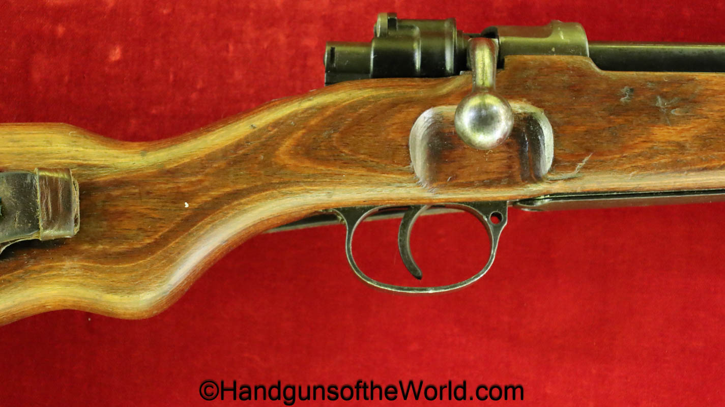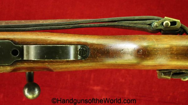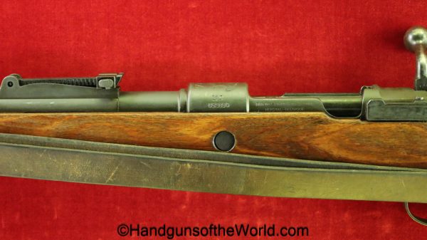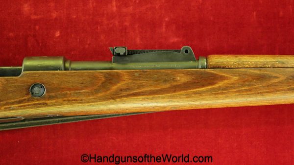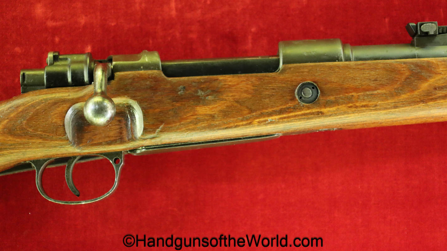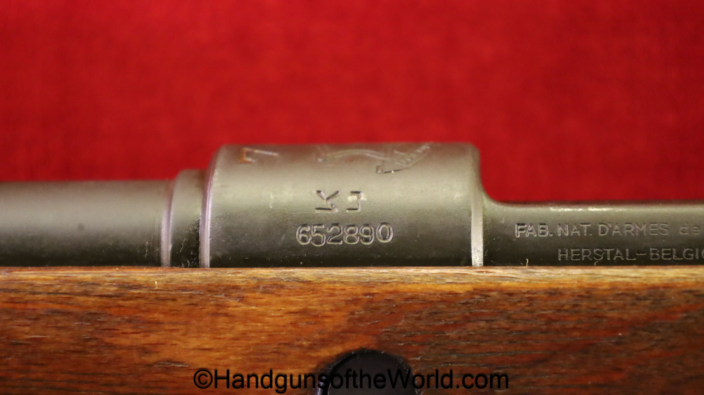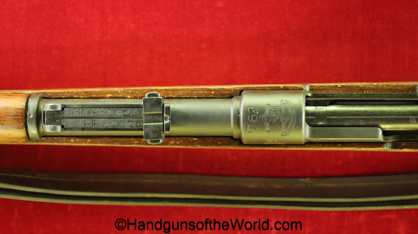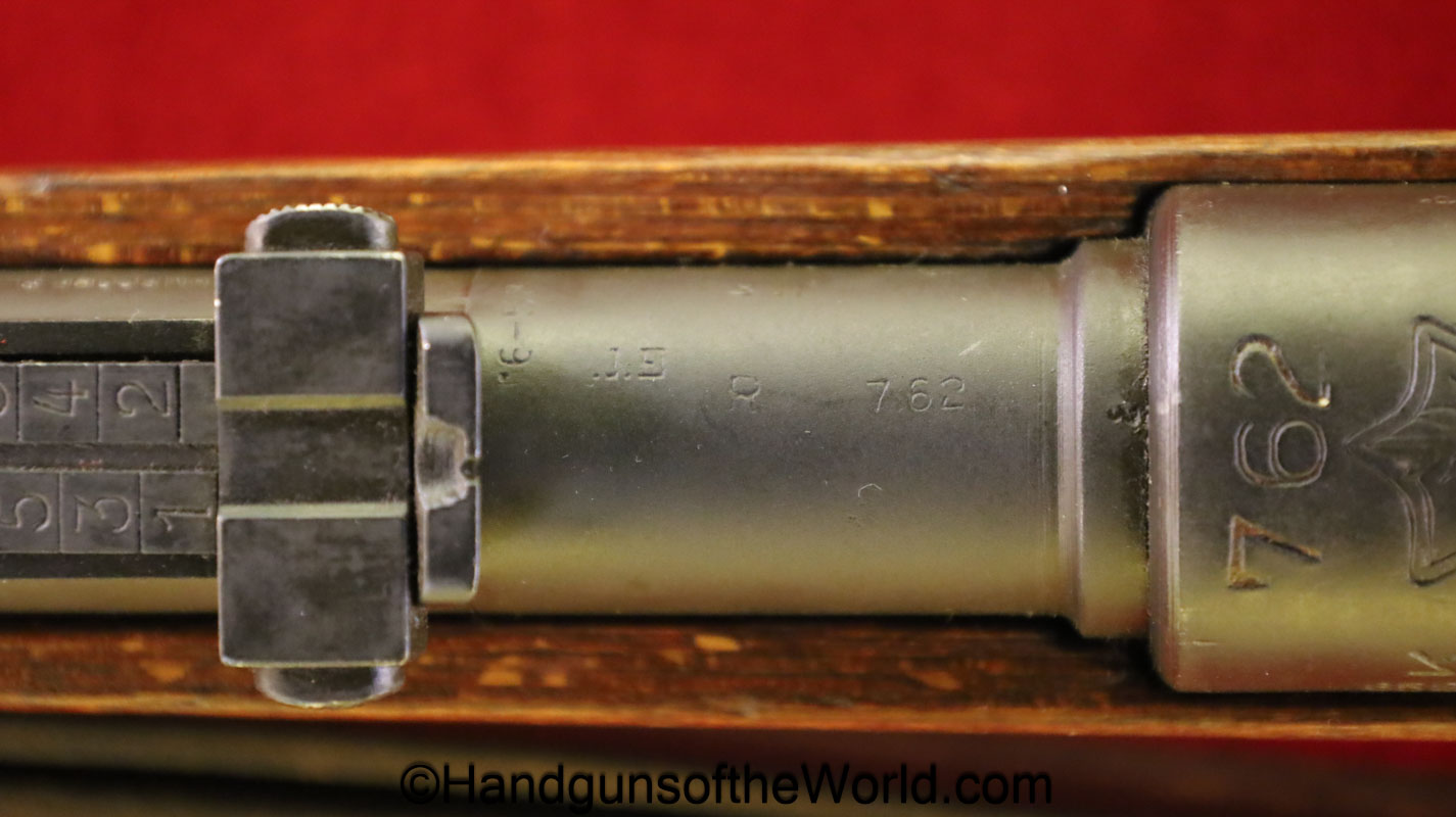 FN Israeli 98K, 7.62mm. This has the Israeli crest on the chamber, and the barrel is dated 6/58. This is post-war assembled and has parts from many different Rifles. The arsenal finish rates about 98% and the bore is excellent. There is an import mark on the receiver. This has a nice wooden stock and comes with a sling and sight hood.