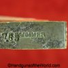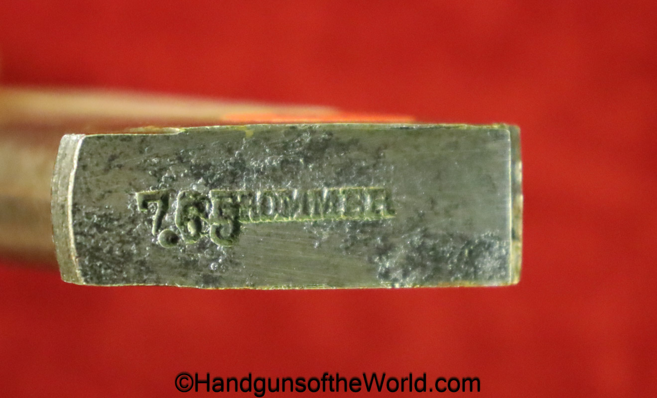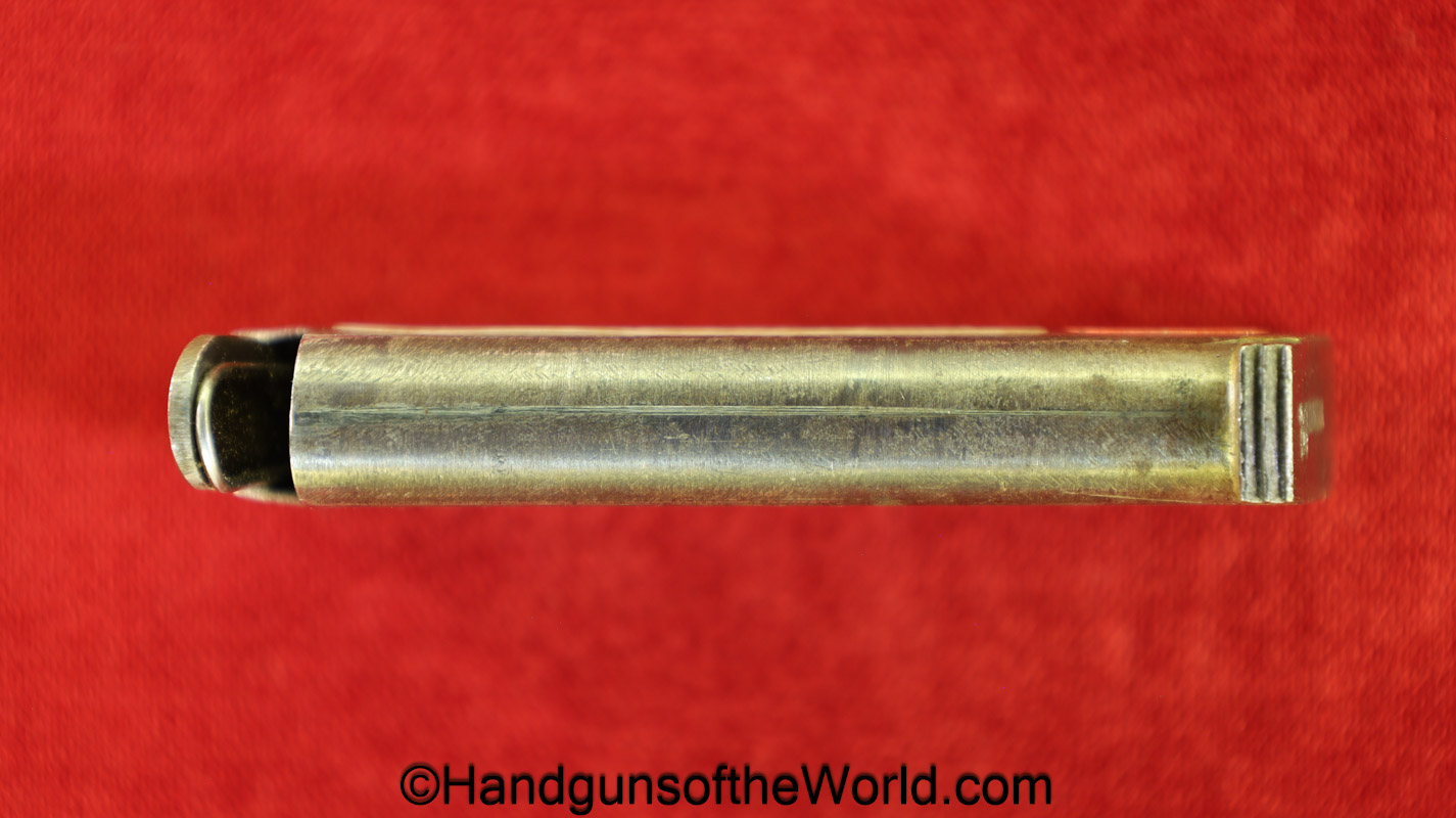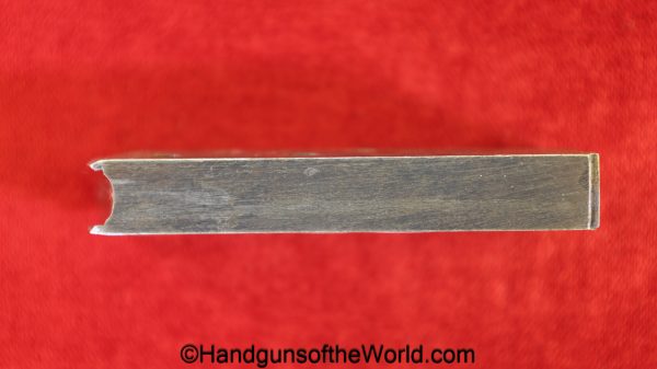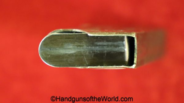 Original Frommer Baby Pistol Magazine. Marked on the base “7.65-Frommer”-7.65 over stamped 9. The base shows a repair. About 60% blue remains.