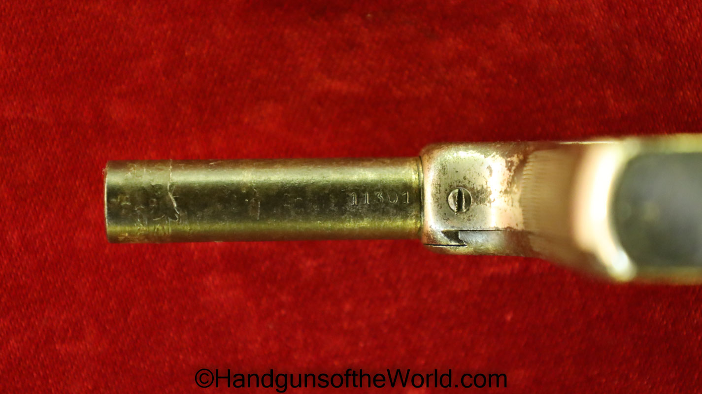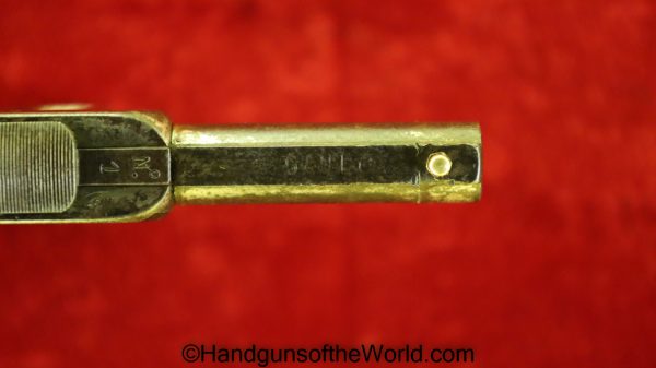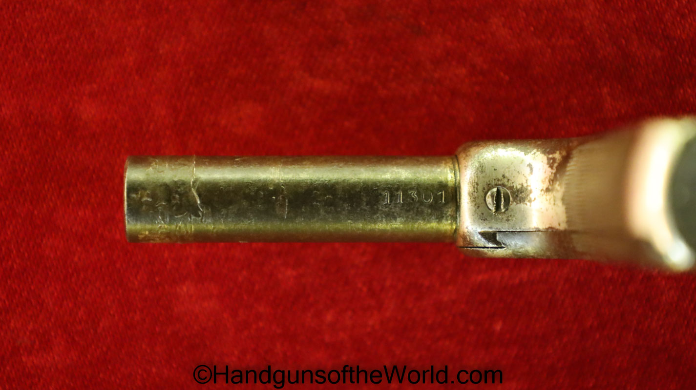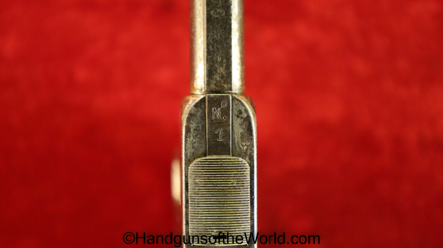 Gaulois No 1, 8mm Palm Pistol. This has the black Bakelite palm grip which shows a chip at the top. This has all matching numbers, about 30% factory nickel and the bore is Poor. Antique.