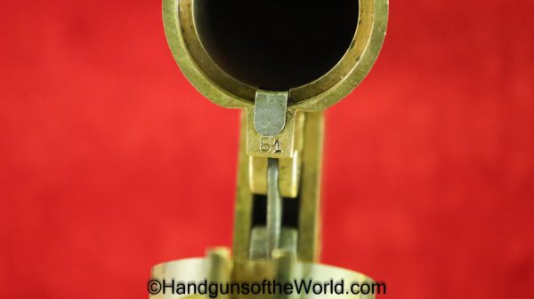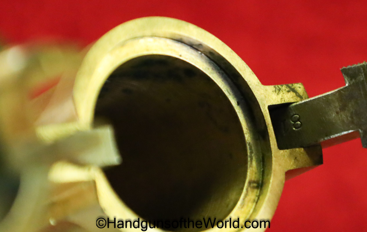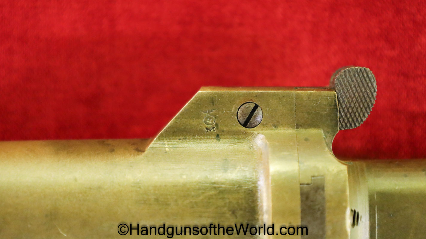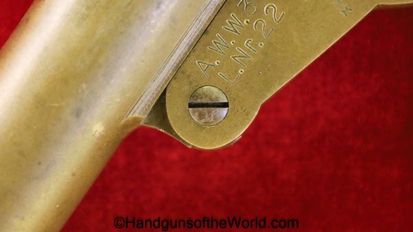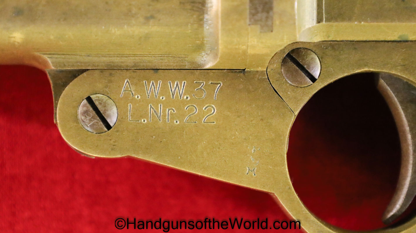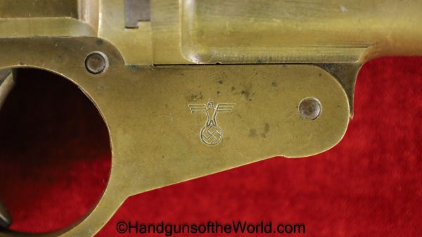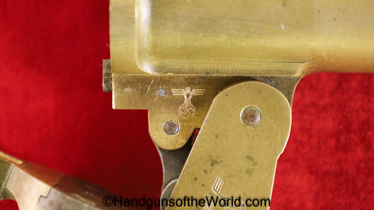 German AWW, 26.5mm Single Barrel Flare Pistol. This is brass with steel fittings and brown Bakelite grips. This is marked AWW 37-L.Nr22 & German Eagle M on the left side of the frame, and a German Eagle M on the right side of the frame. This also has an Eagle M on the top of the barrel. Overall Excellent. Non FFL.