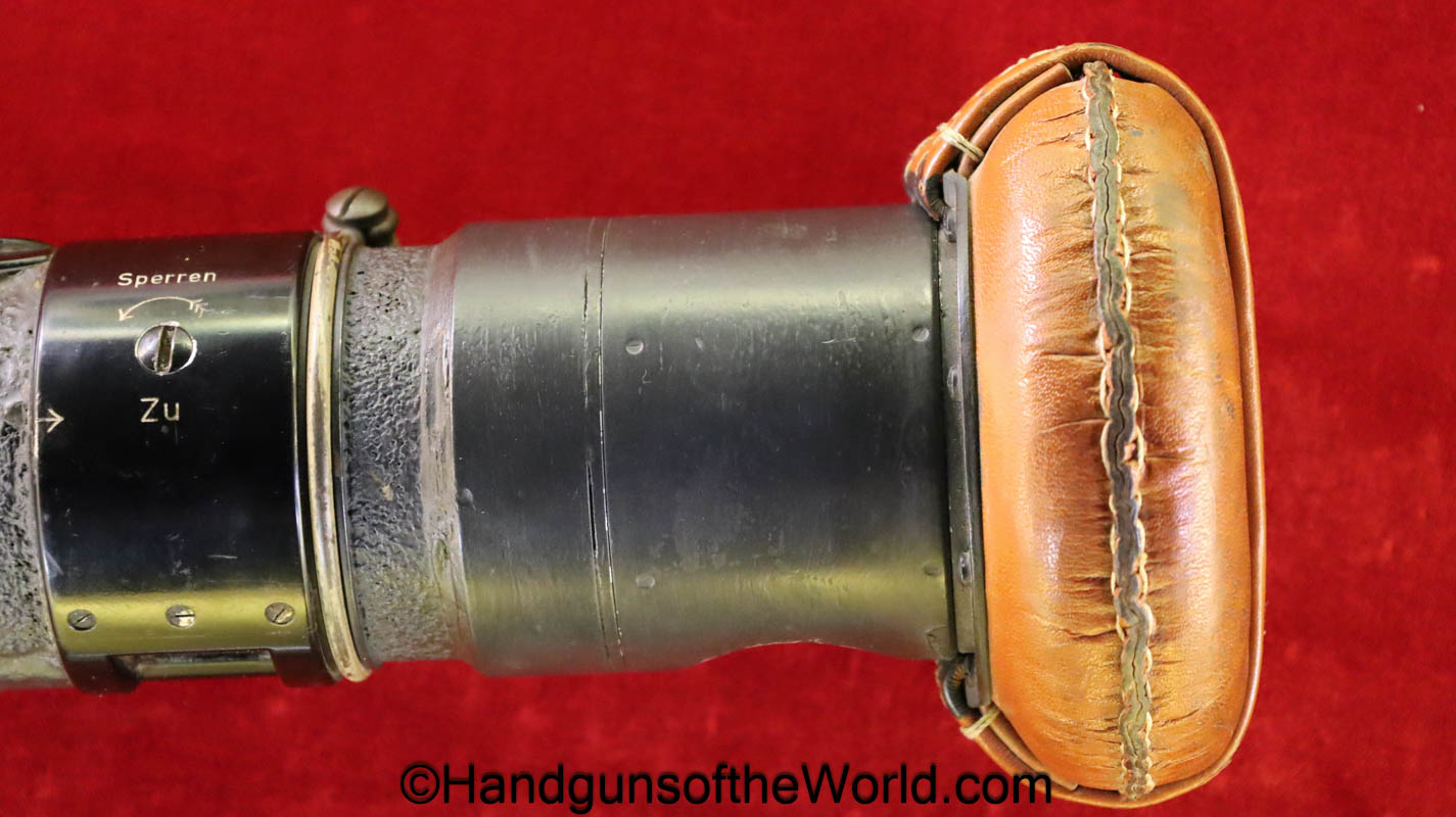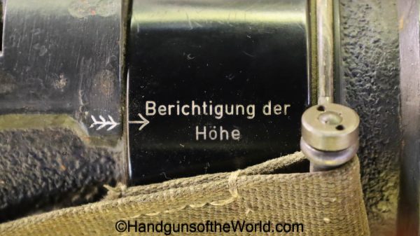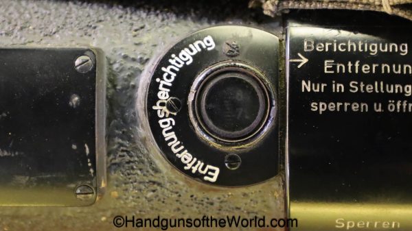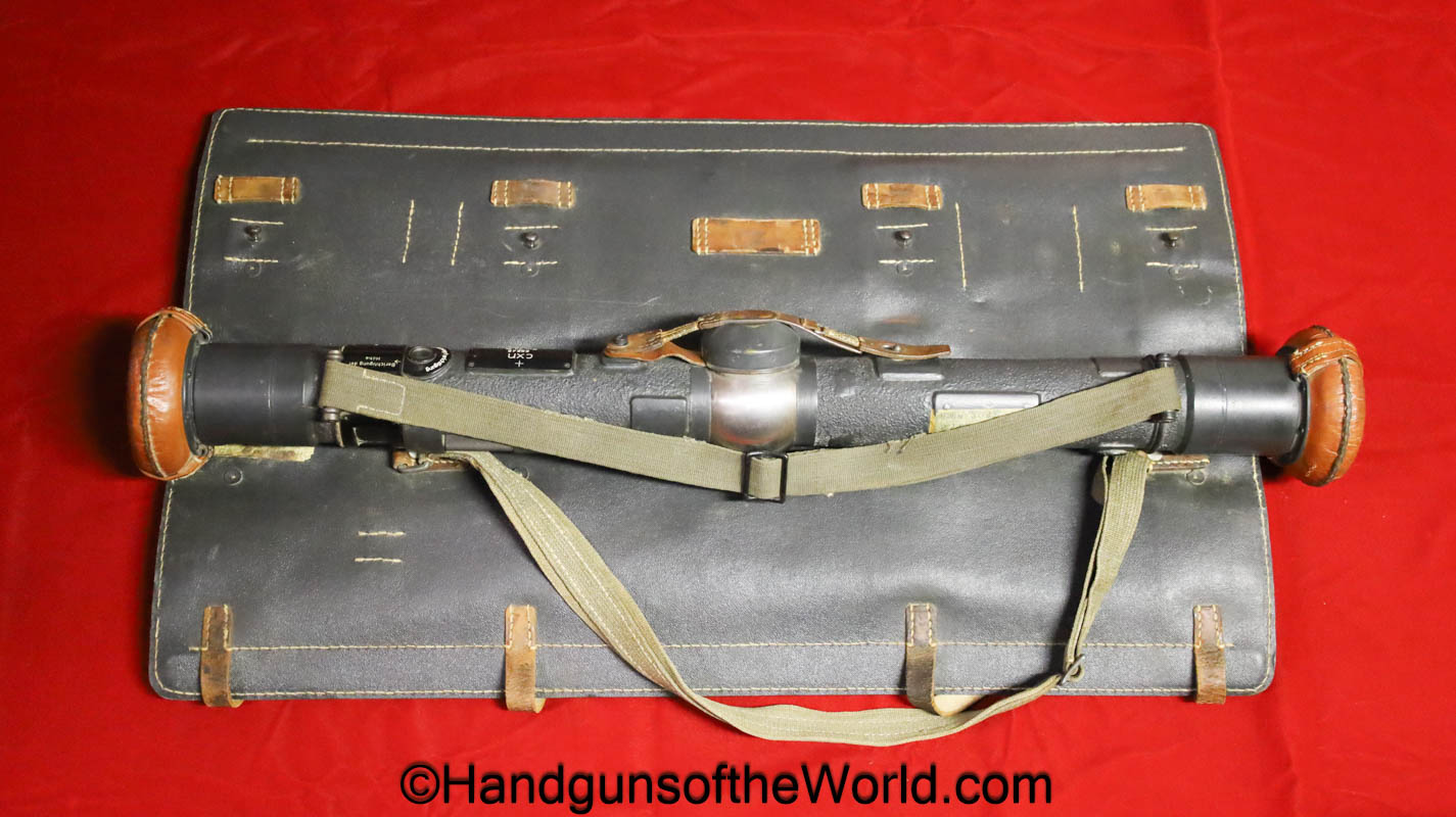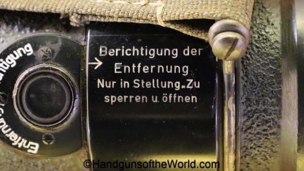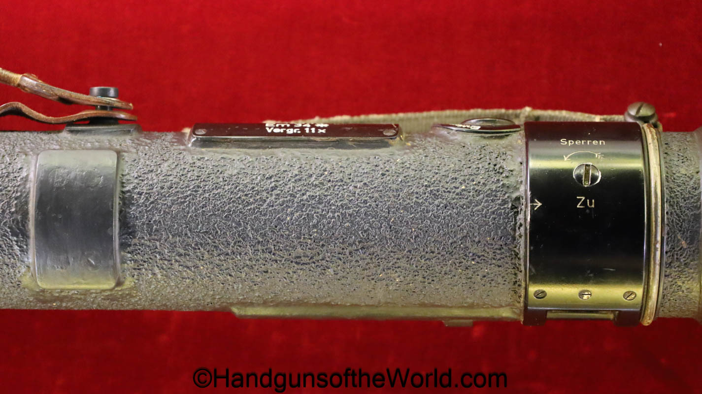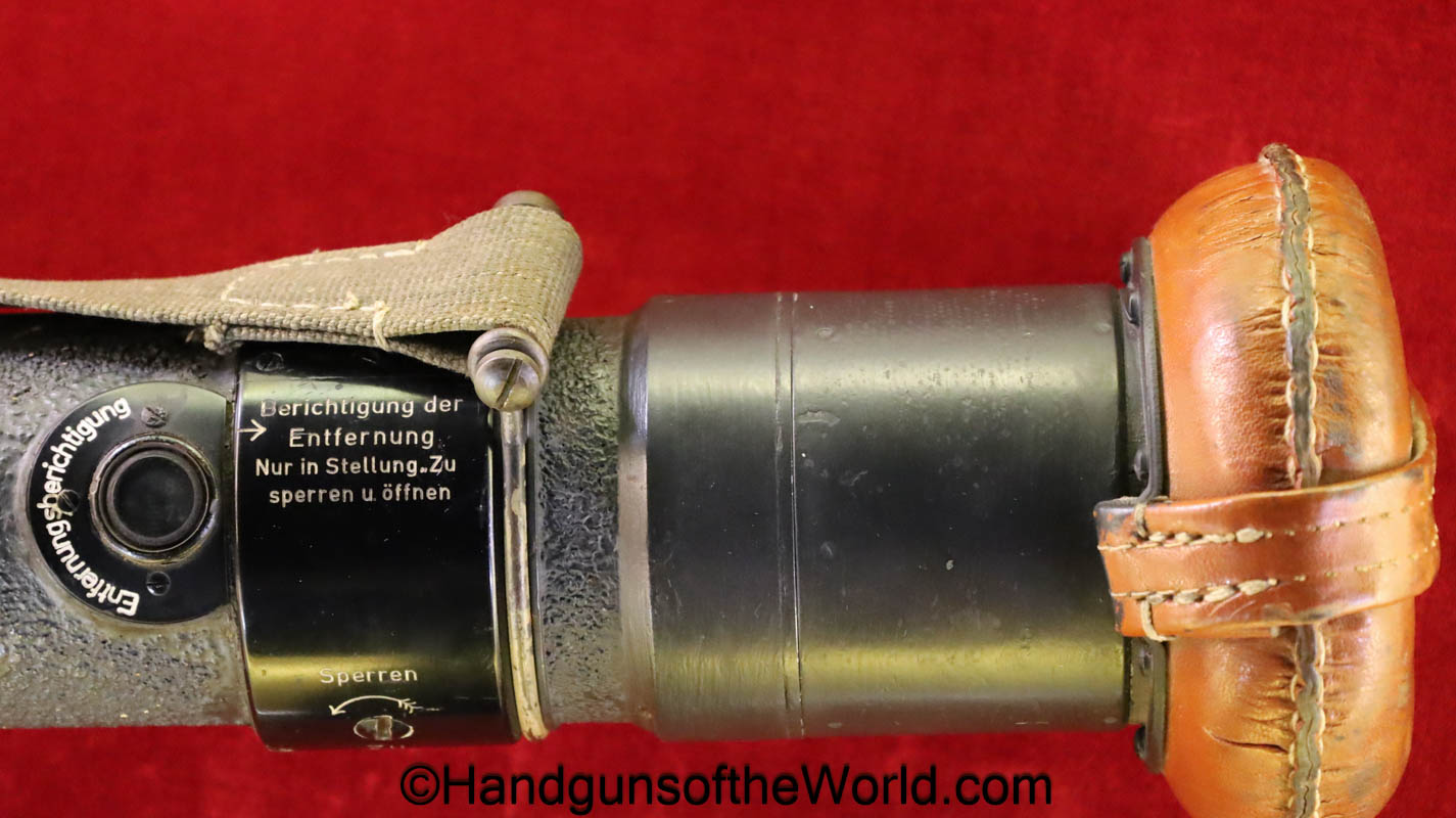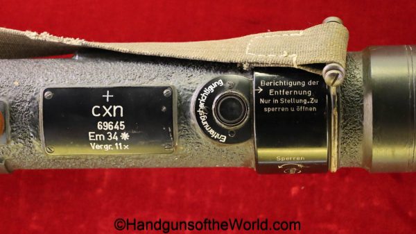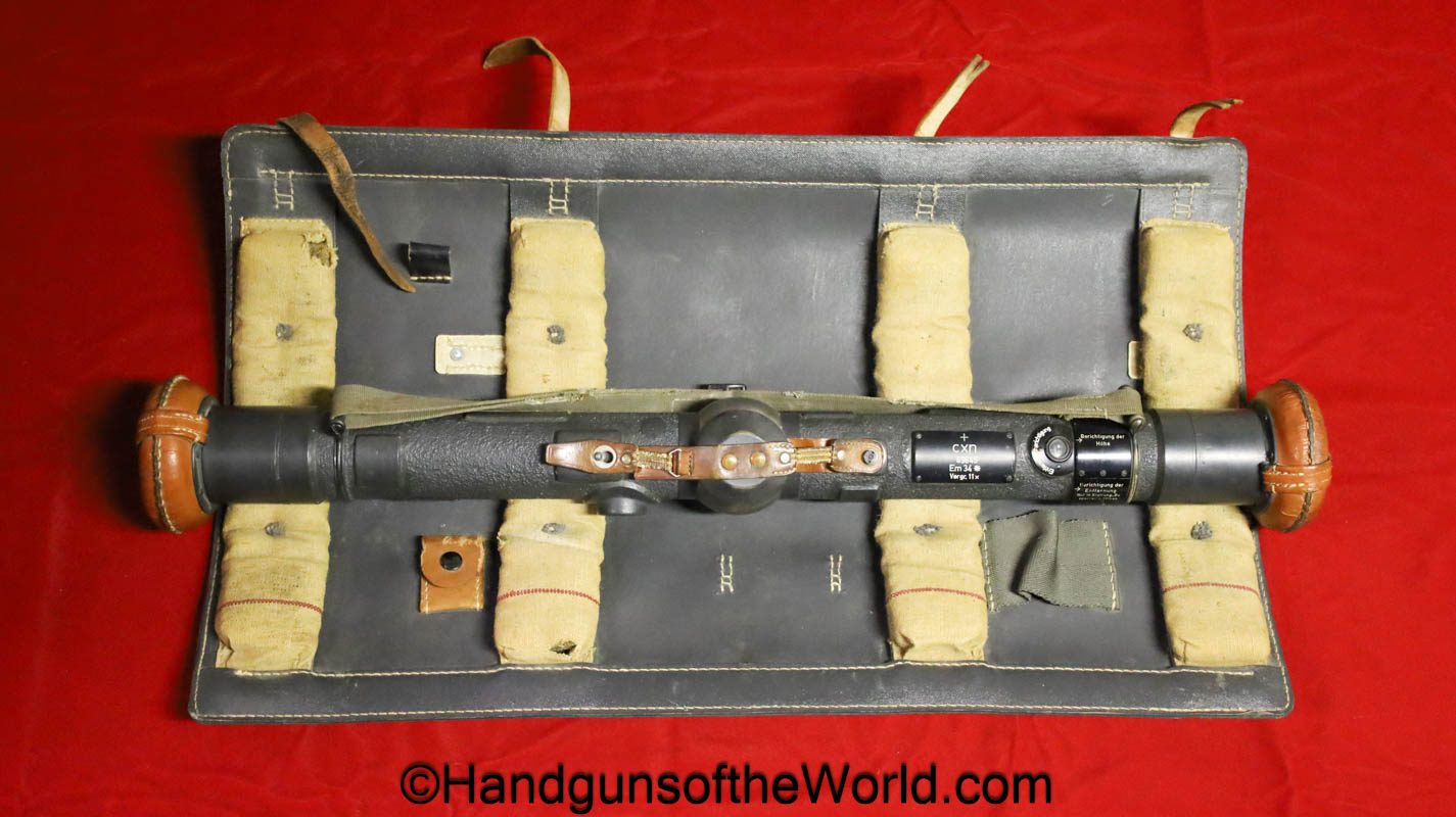 German EM34 Range Finder. This is marker marked CXN=Busch. This has a dark green steel body with all plaques intact. The leather end caps are nice as are the optics. This comes with its original dark green leather shoulder carrying case marked bmj 1943-WaA414. 2 of the leather straps have been lost, overall VG+.