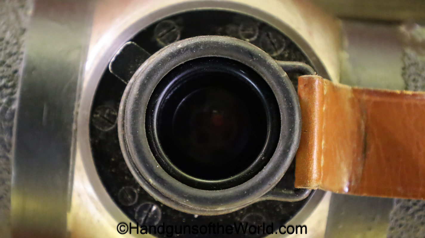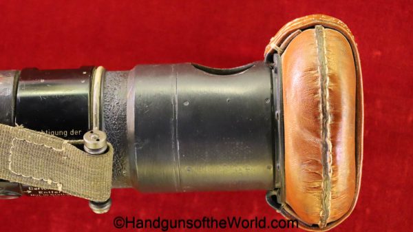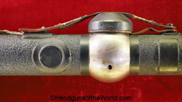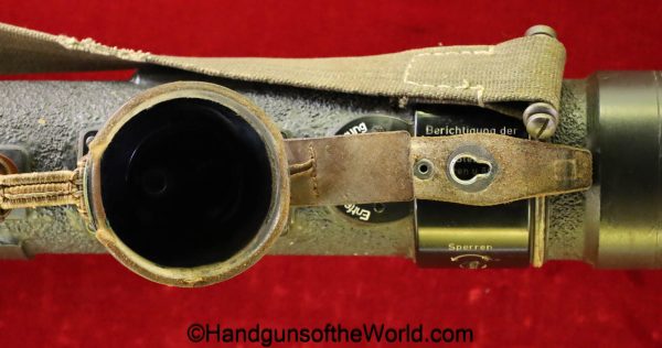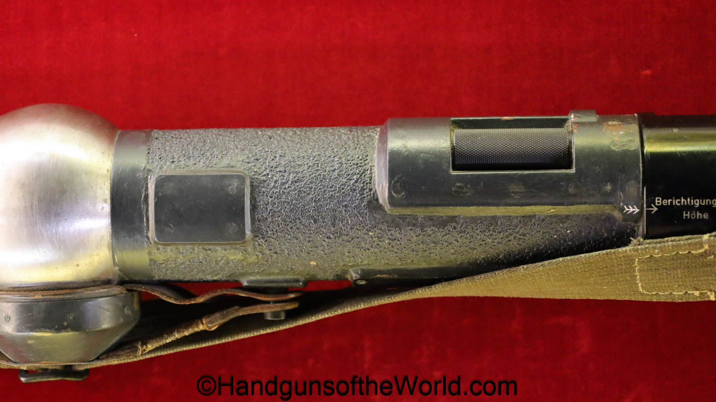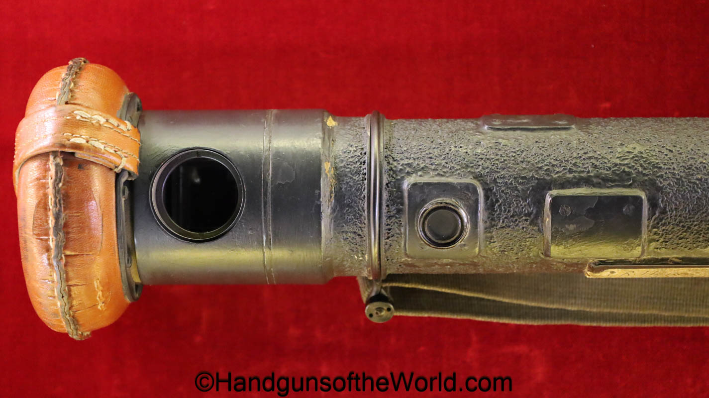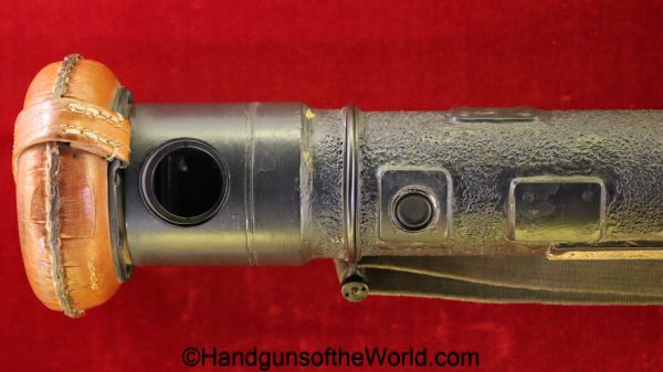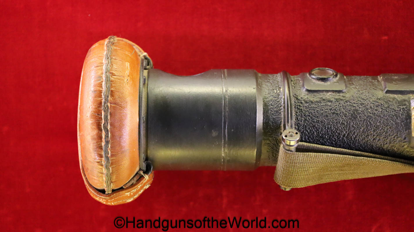 German EM34 Range Finder. This is marker marked CXN=Busch. This has a dark green steel body with all plaques intact. The leather end caps are nice as are the optics. This comes with its original dark green leather shoulder carrying case marked bmj 1943-WaA414. 2 of the leather straps have been lost, overall VG+.