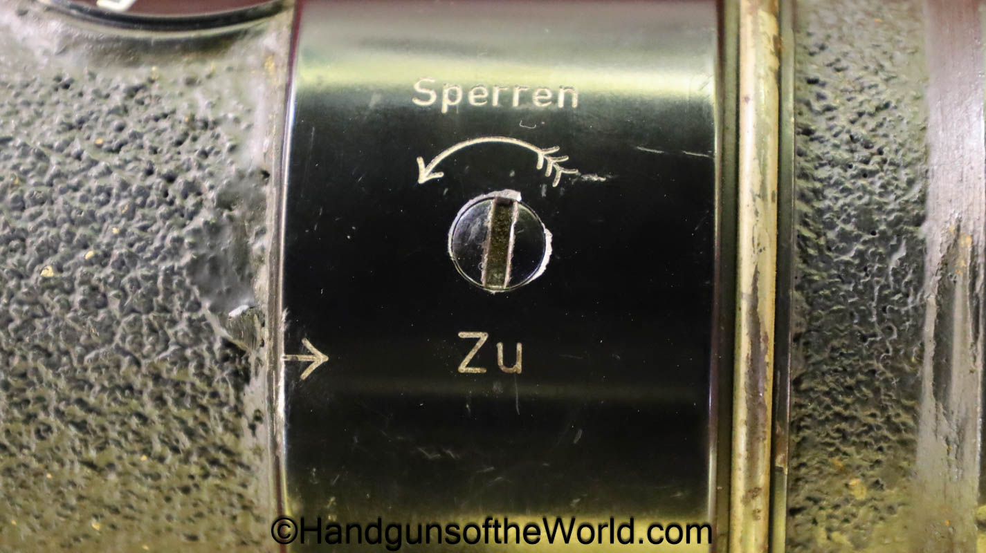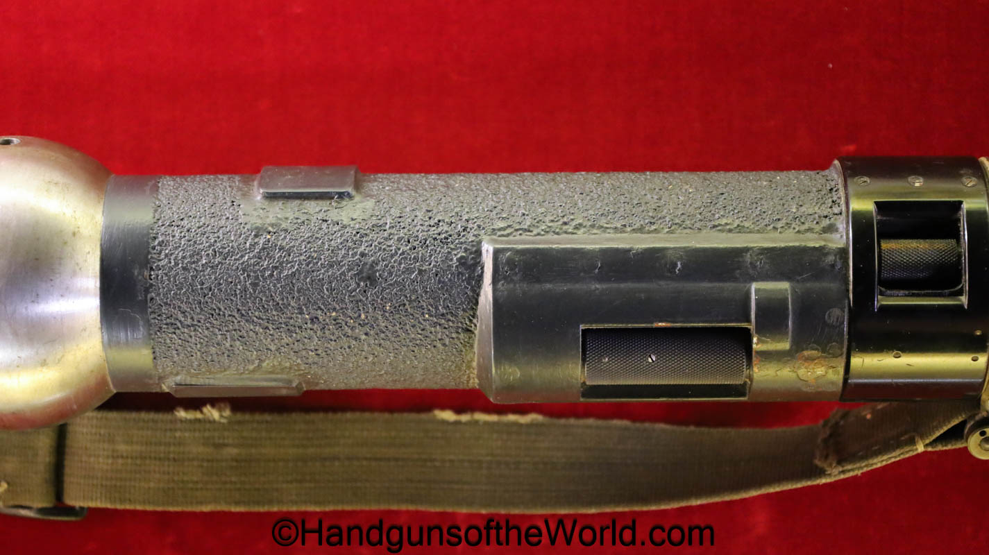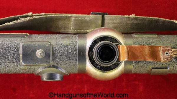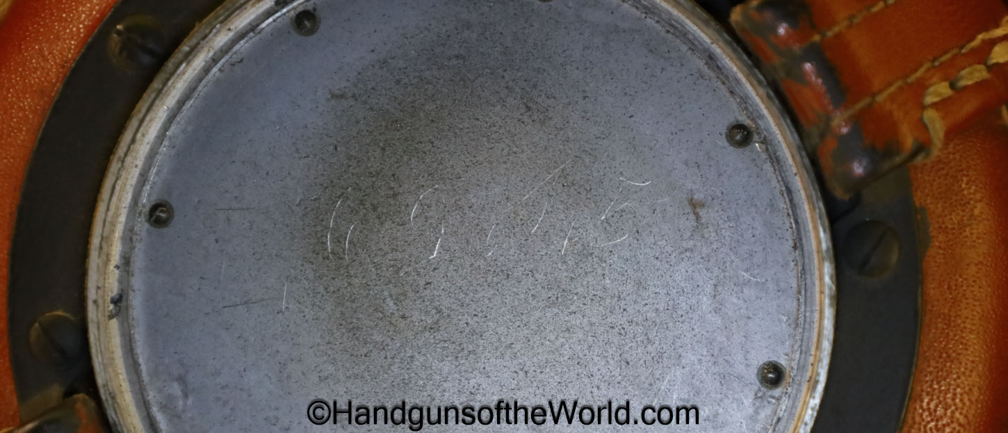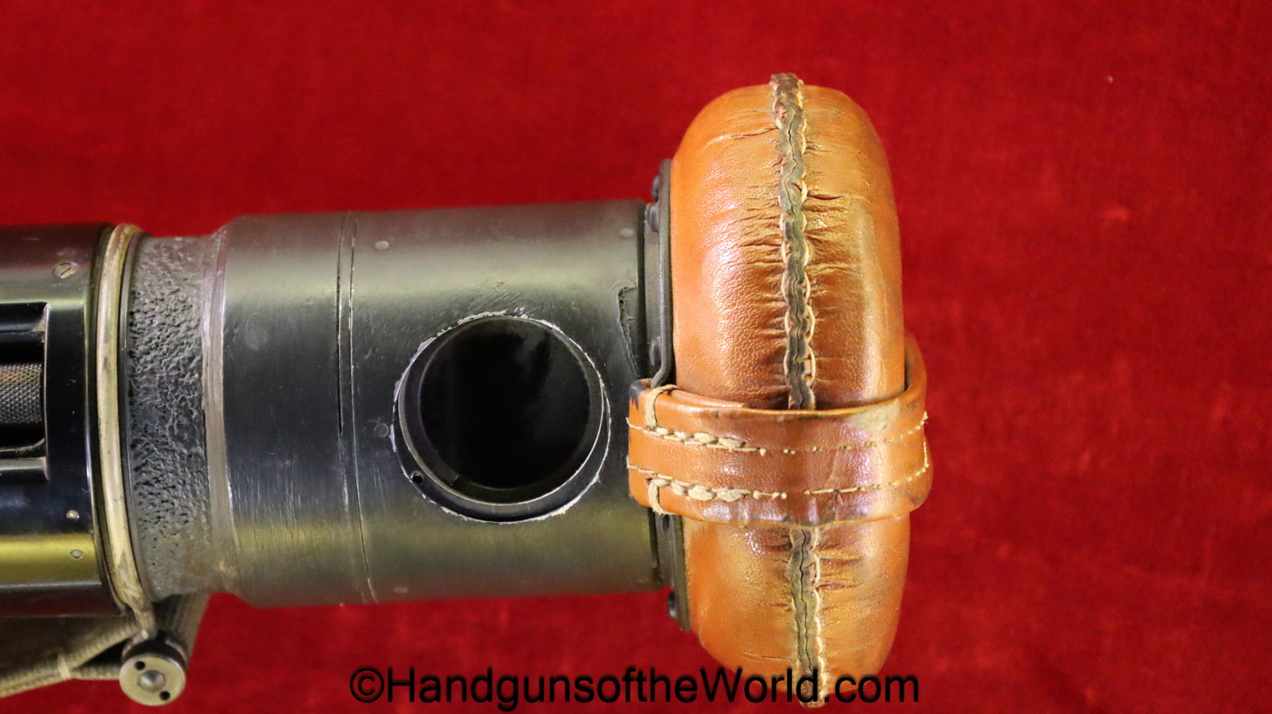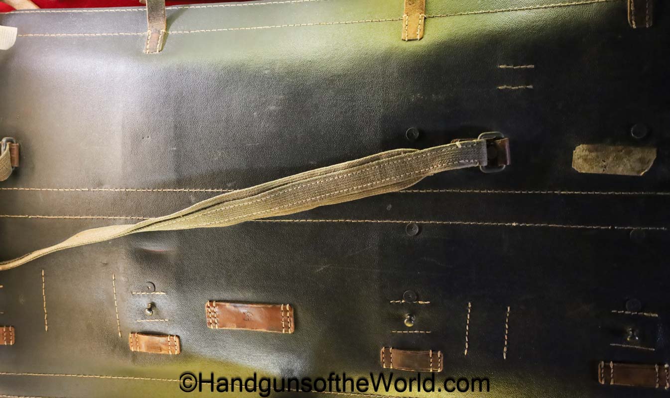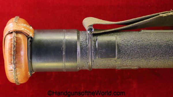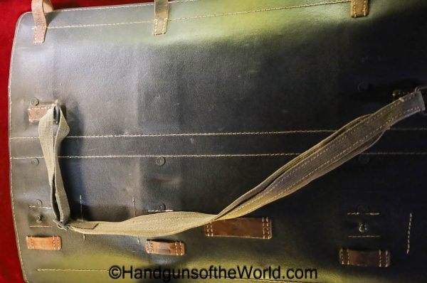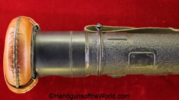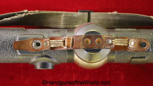 German EM34 Range Finder. This is marker marked CXN=Busch. This has a dark green steel body with all plaques intact. The leather end caps are nice as are the optics. This comes with its original dark green leather shoulder carrying case marked bmj 1943-WaA414. 2 of the leather straps have been lost, overall VG+.