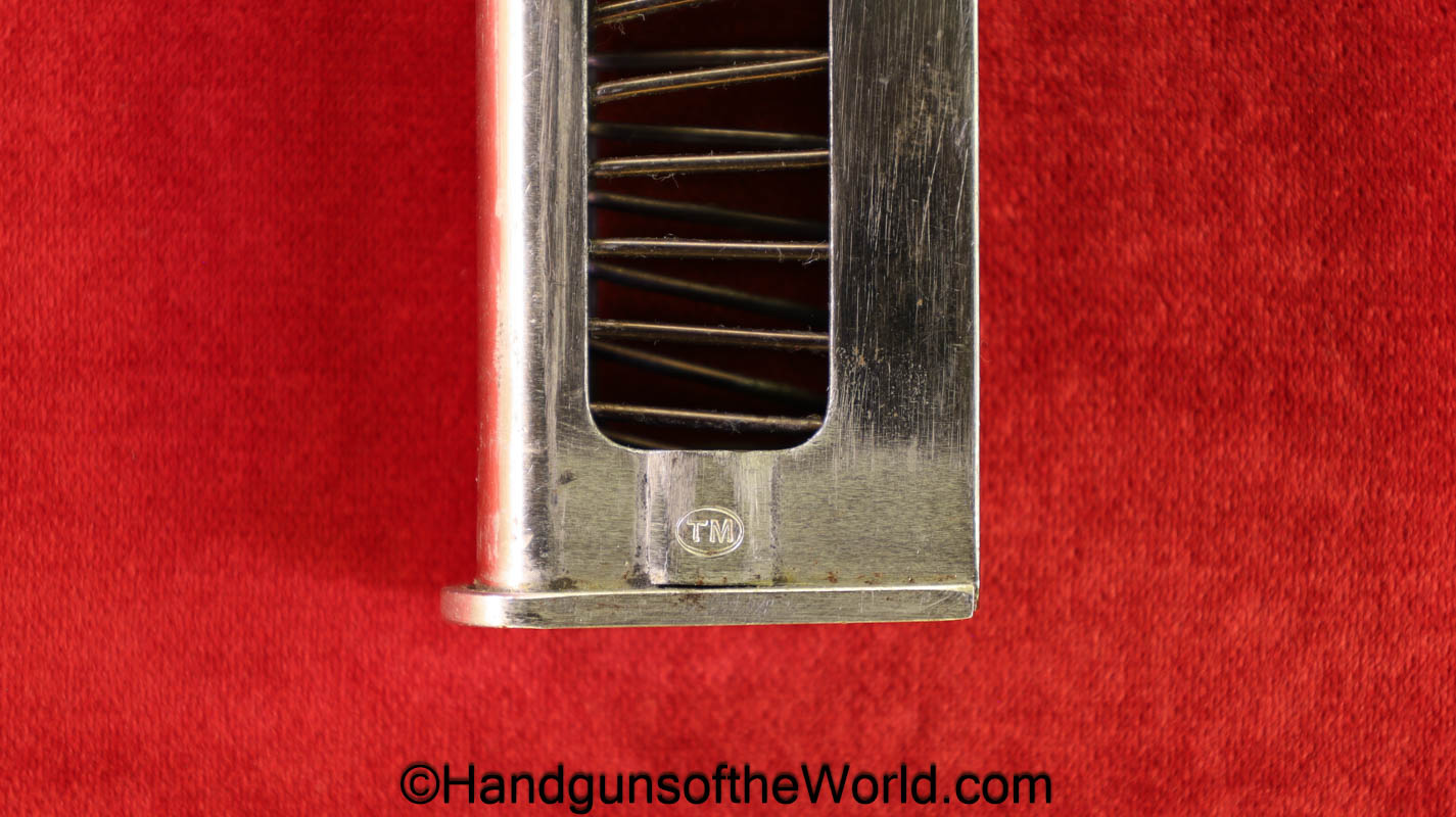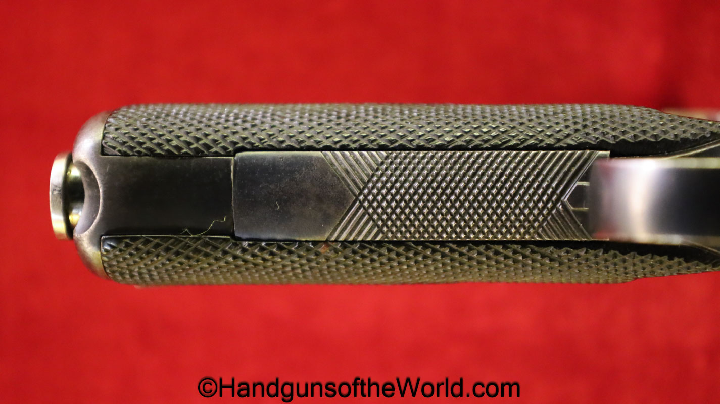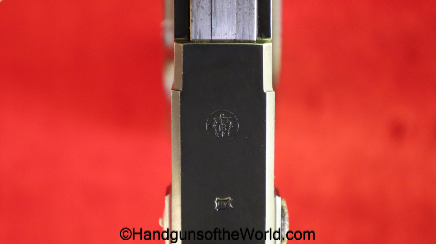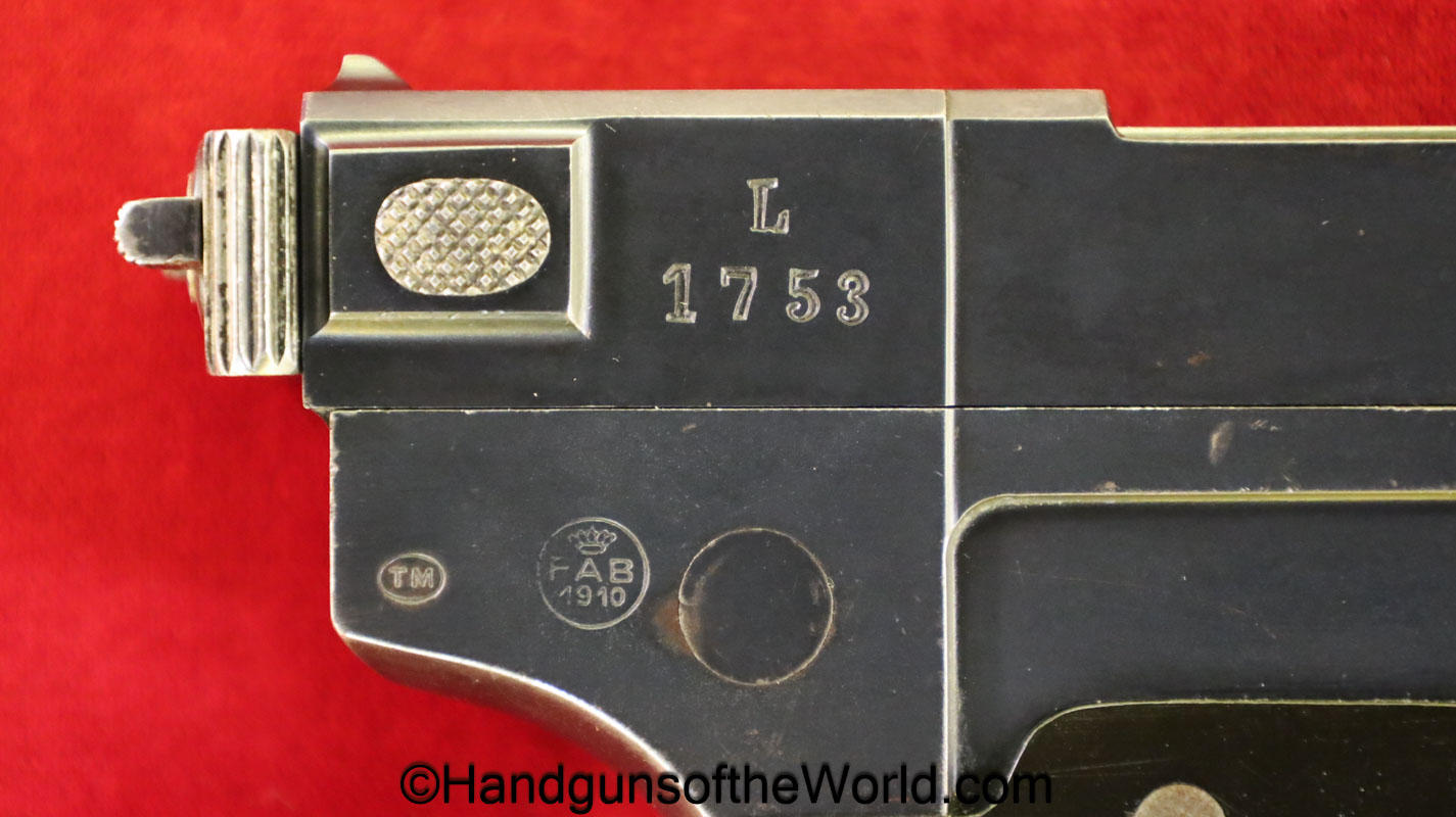 Glisenti 1910, 9mm. This is Italian Military TM in an oval proofed on the right rear frame and on the side of the magazine. This has the proper black Bakelite grips and is marked FAB in a circle on the right side of the frame. This has all matching serial numbers, with about 97% blue and a VG bore.