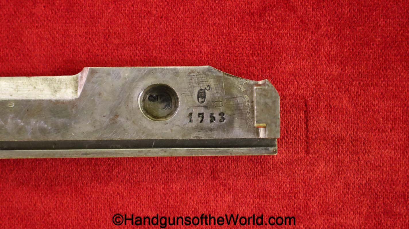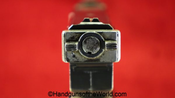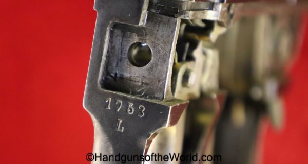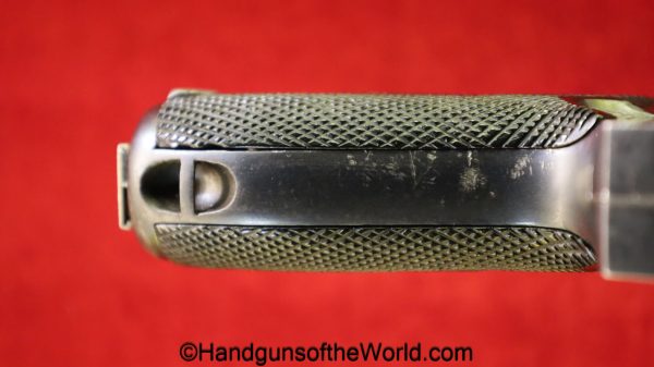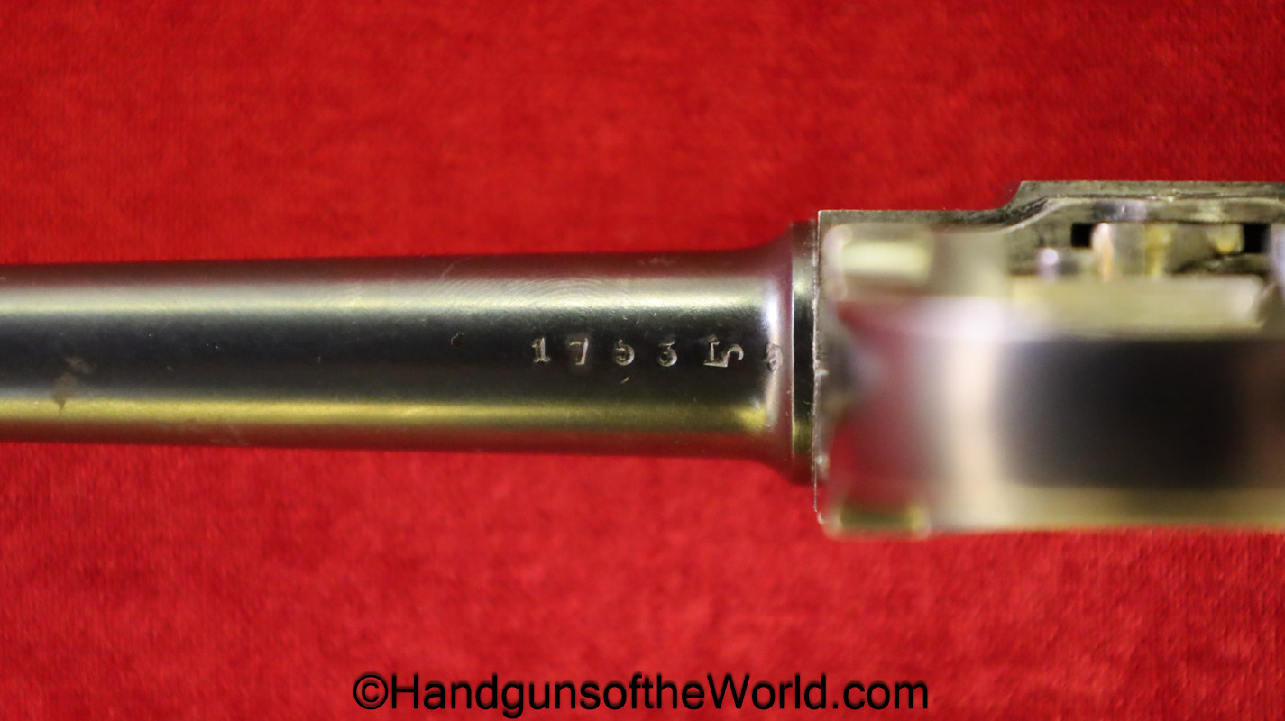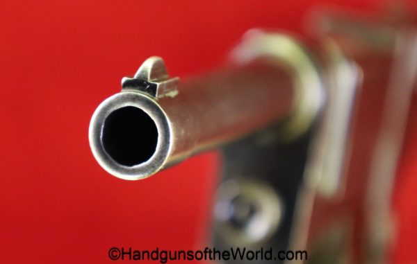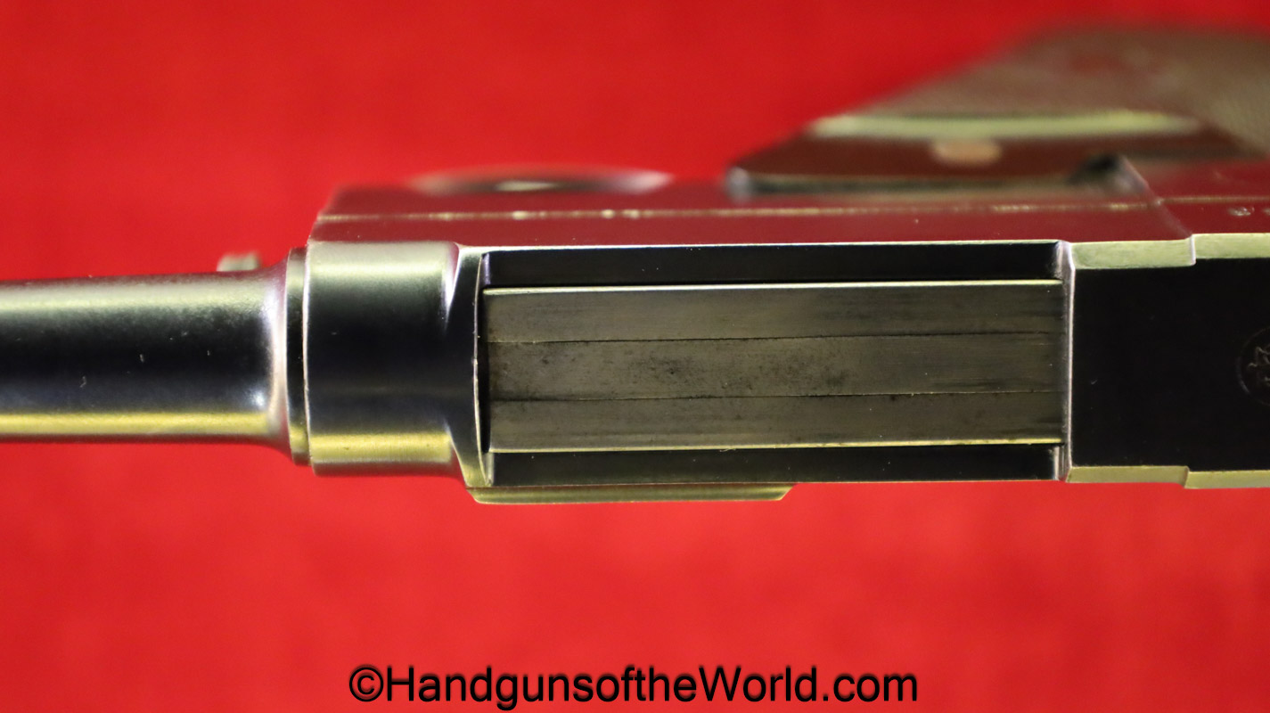 Glisenti 1910, 9mm. This is Italian Military TM in an oval proofed on the right rear frame and on the side of the magazine. This has the proper black Bakelite grips and is marked FAB in a circle on the right side of the frame. This has all matching serial numbers, with about 97% blue and a VG bore.