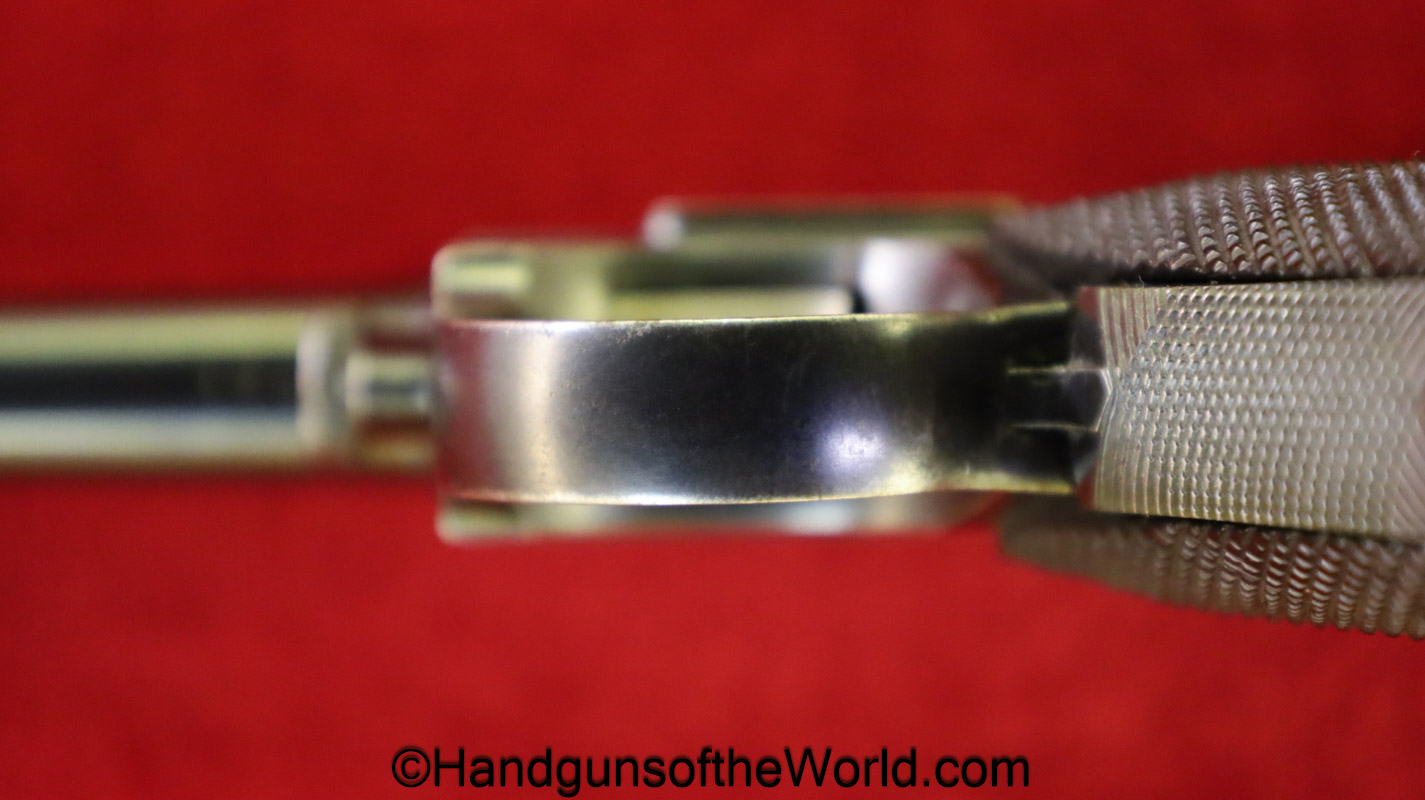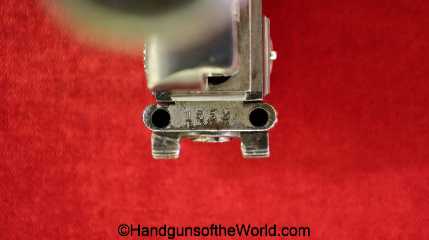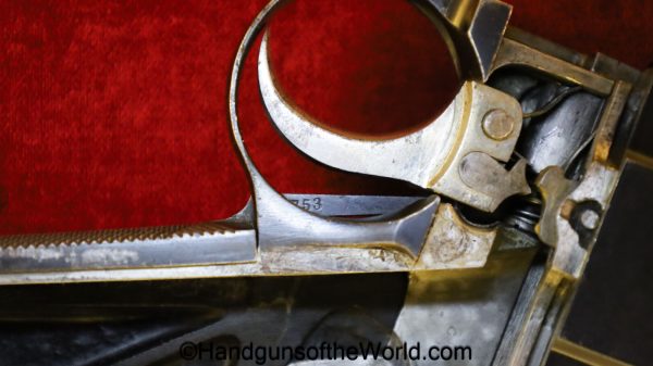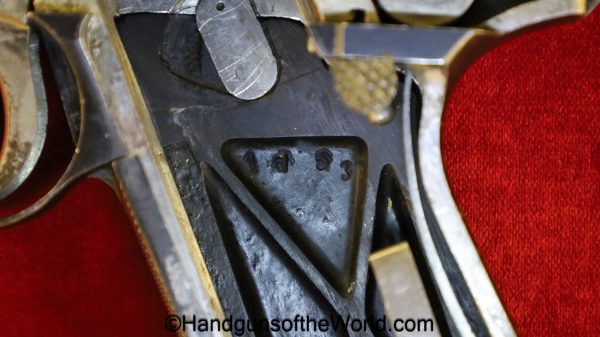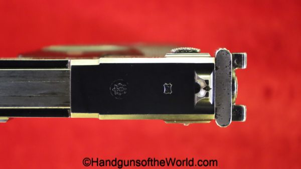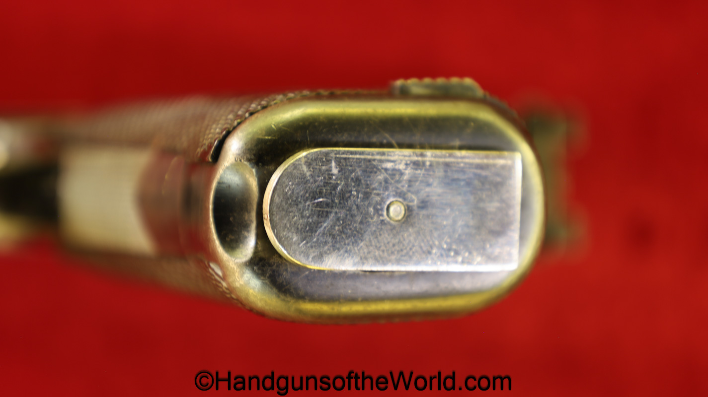 Glisenti 1910, 9mm. This is Italian Military TM in an oval proofed on the right rear frame and on the side of the magazine. This has the proper black Bakelite grips and is marked FAB in a circle on the right side of the frame. This has all matching serial numbers, with about 97% blue and a VG bore.