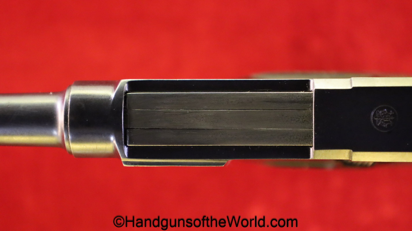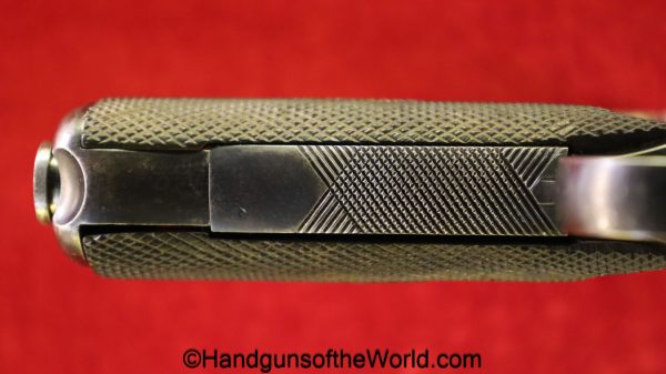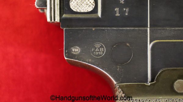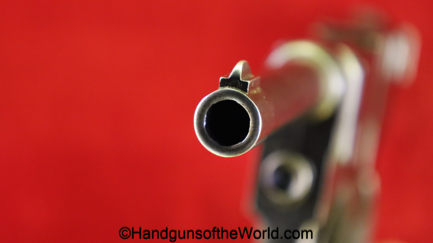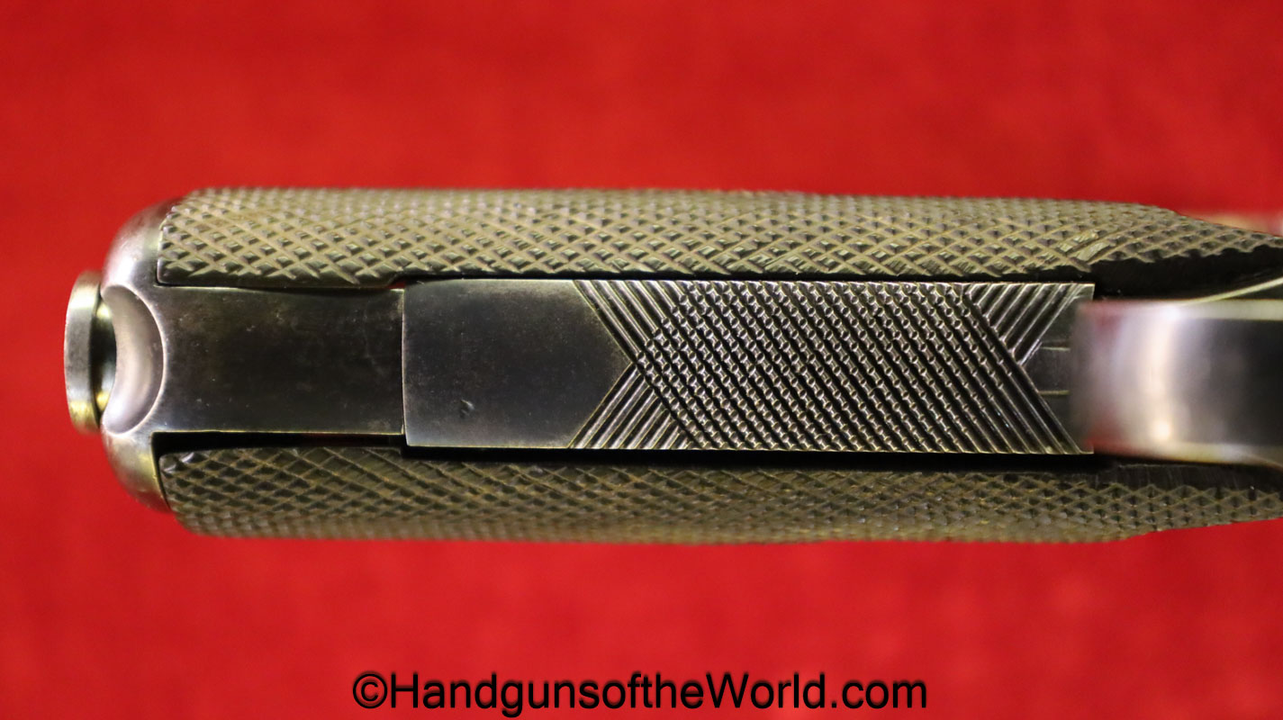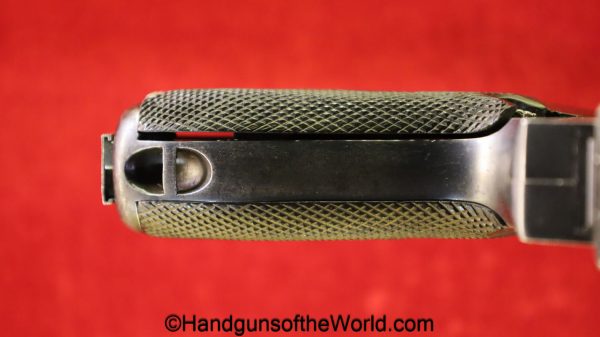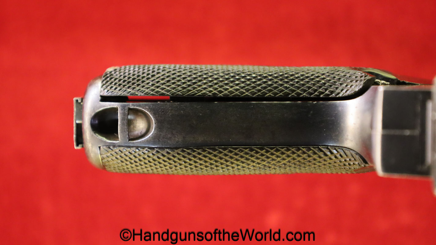 Glisenti 1910, 9mm. This is Italian TM in an oval proofed on the side, and on the magazine. This has black hard rubber grips. This is dated FAB 1910, and has all matching serial numbers. The blue rates about 97% and the bore is VG++.