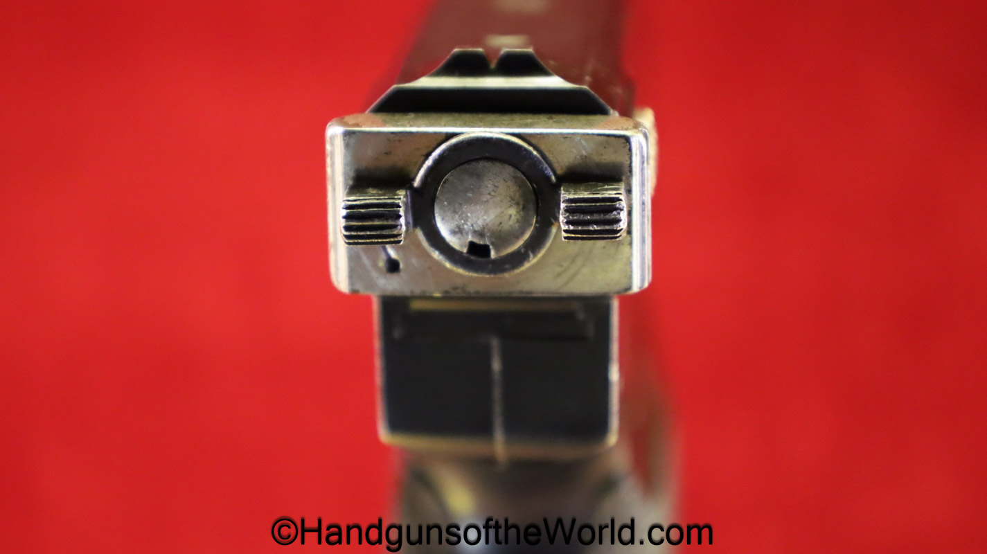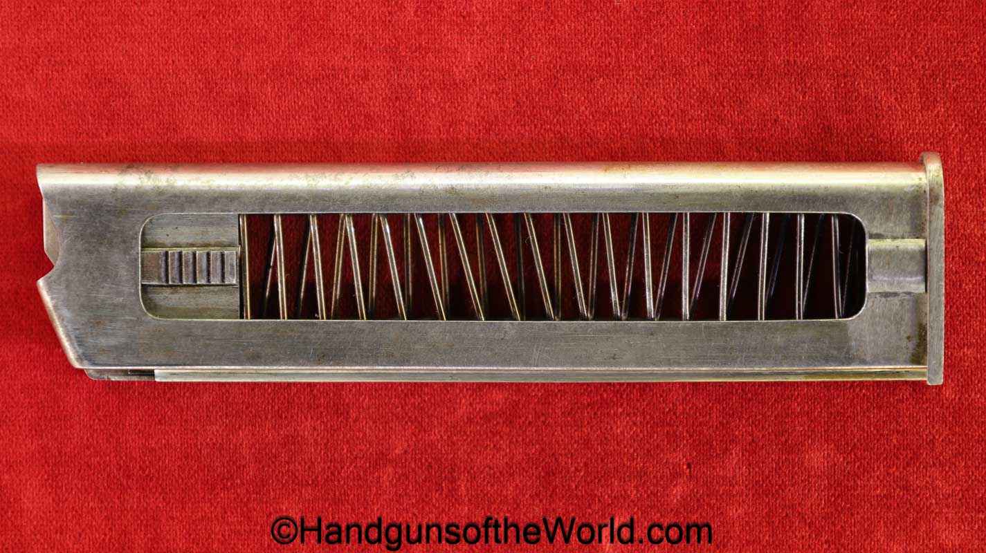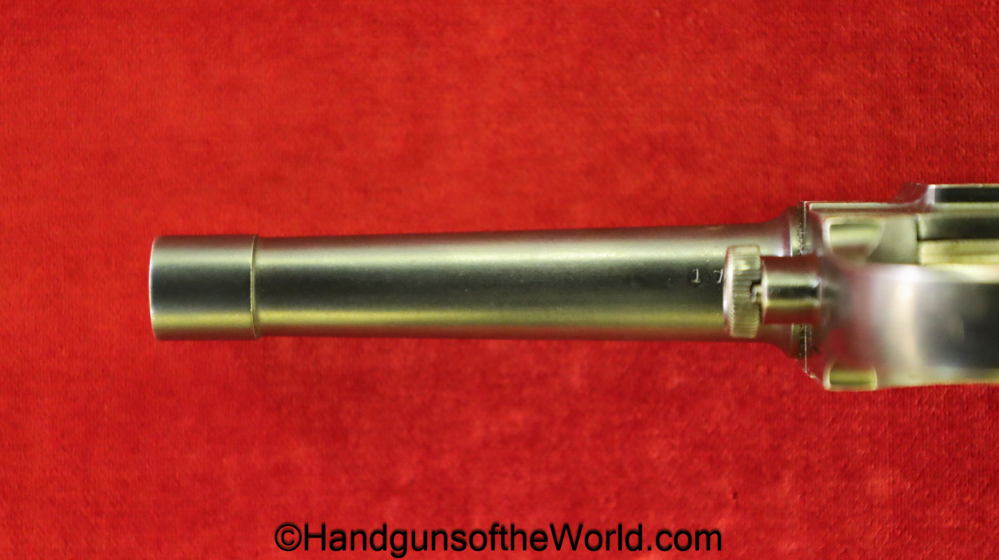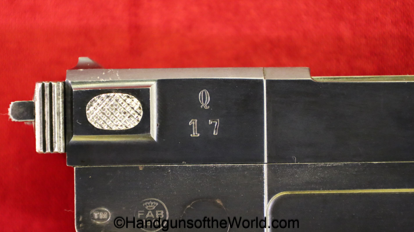 Glisenti 1910, 9mm. This is Italian TM in an oval proofed on the side, and on the magazine. This has black hard rubber grips. This is dated FAB 1910, and has all matching serial numbers. The blue rates about 97% and the bore is VG++.