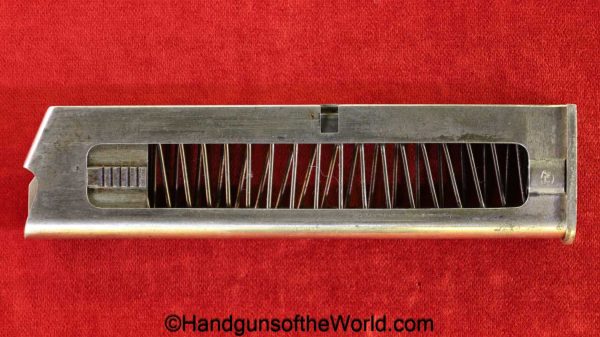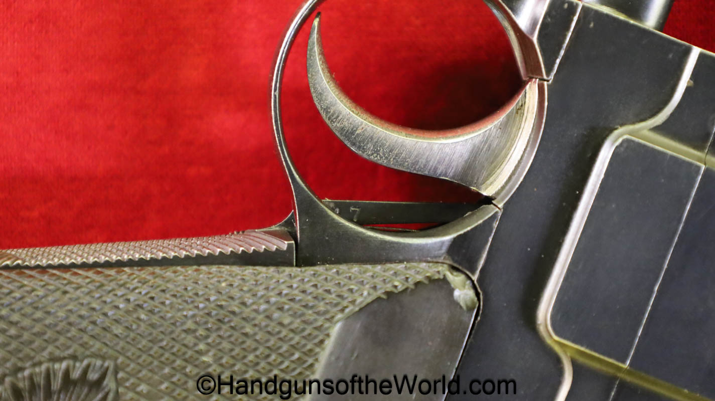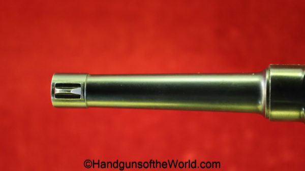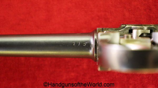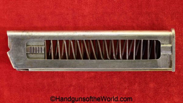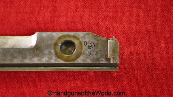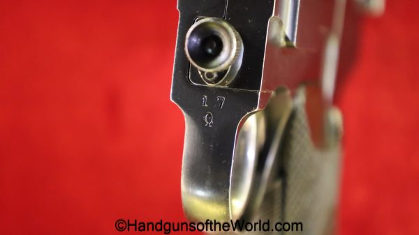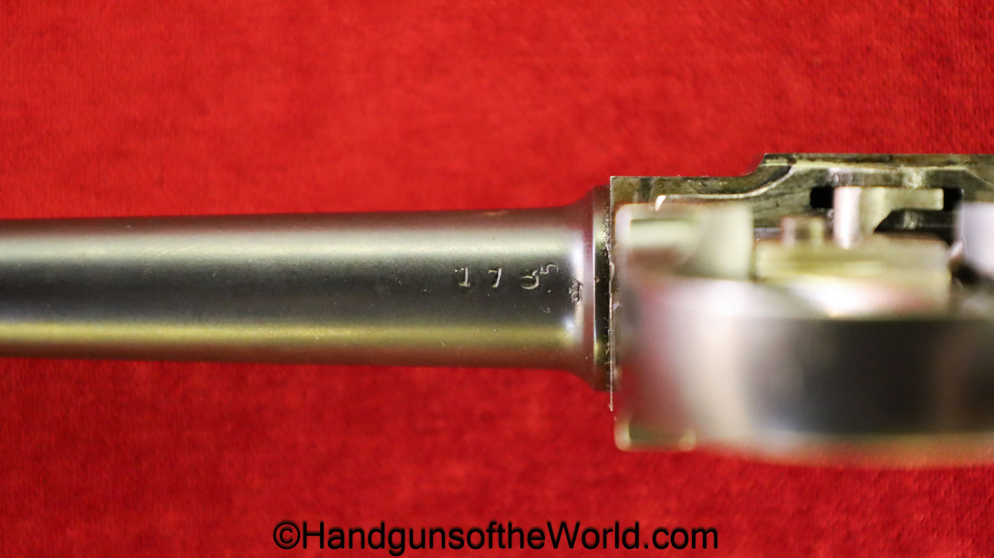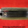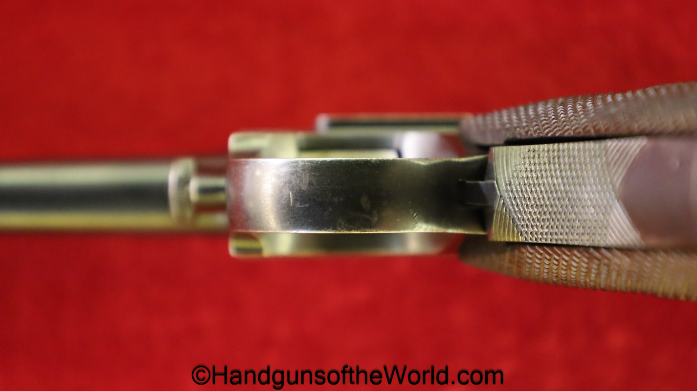 Glisenti 1910, 9mm. This is Italian TM in an oval proofed on the side, and on the magazine. This has black hard rubber grips. This is dated FAB 1910, and has all matching serial numbers. The blue rates about 97% and the bore is VG++.