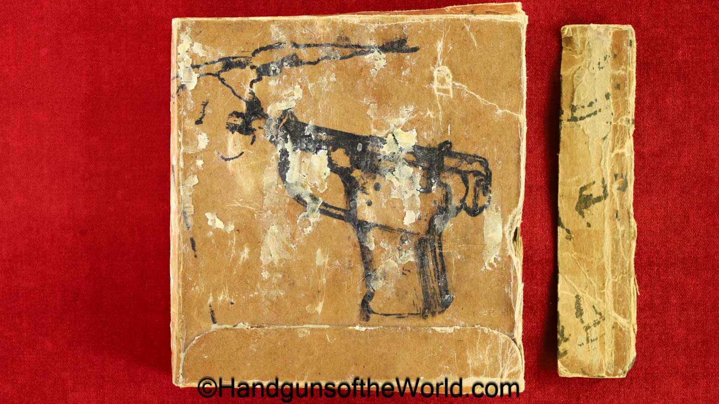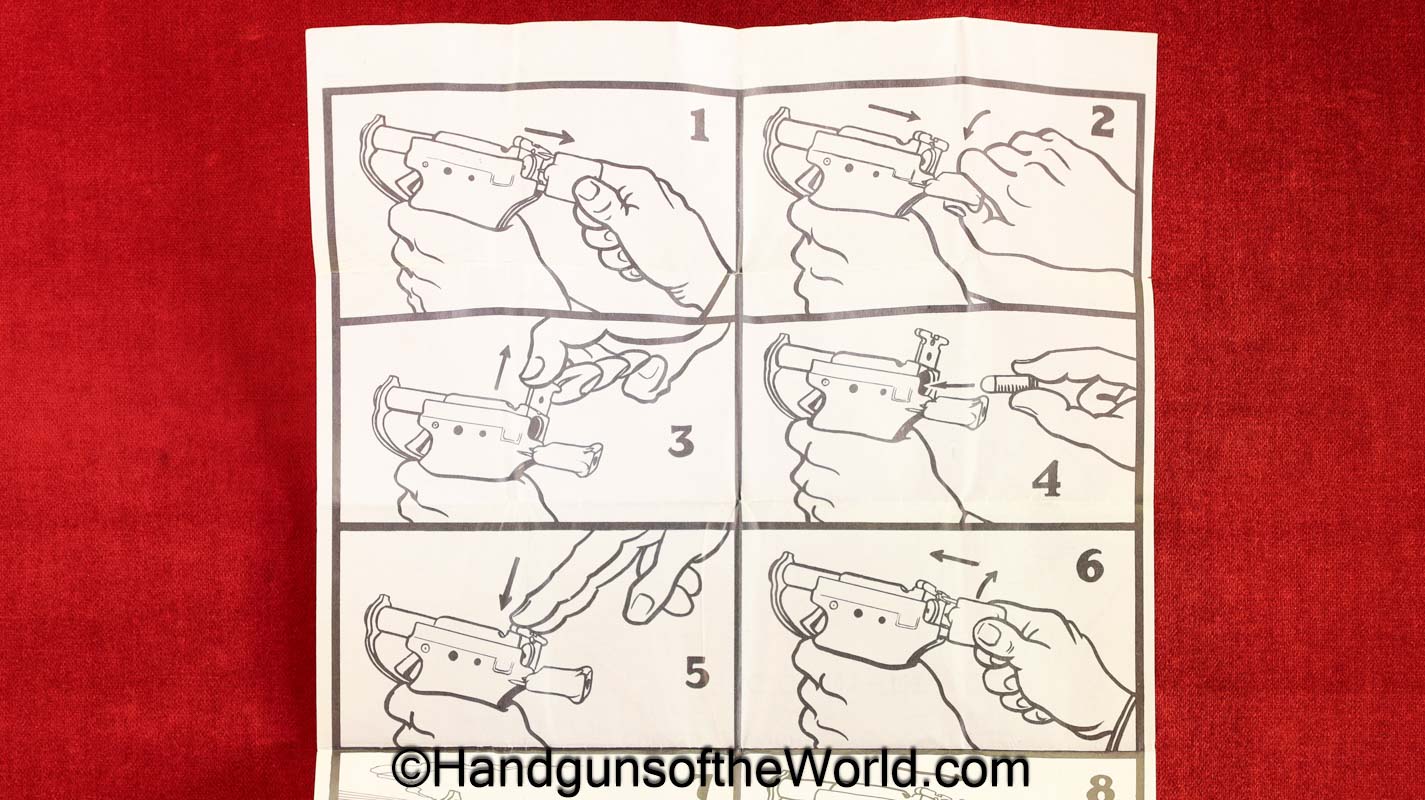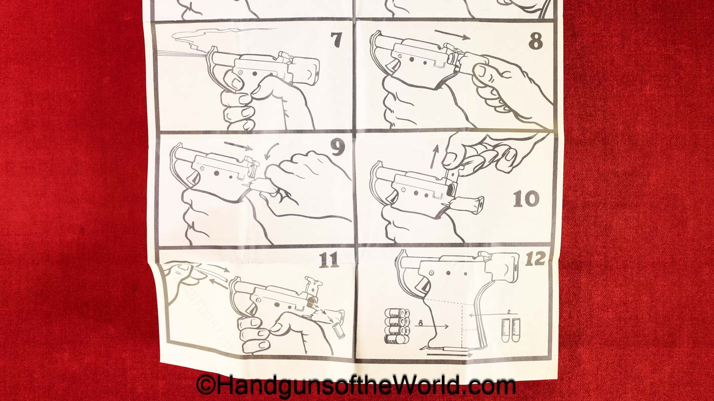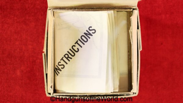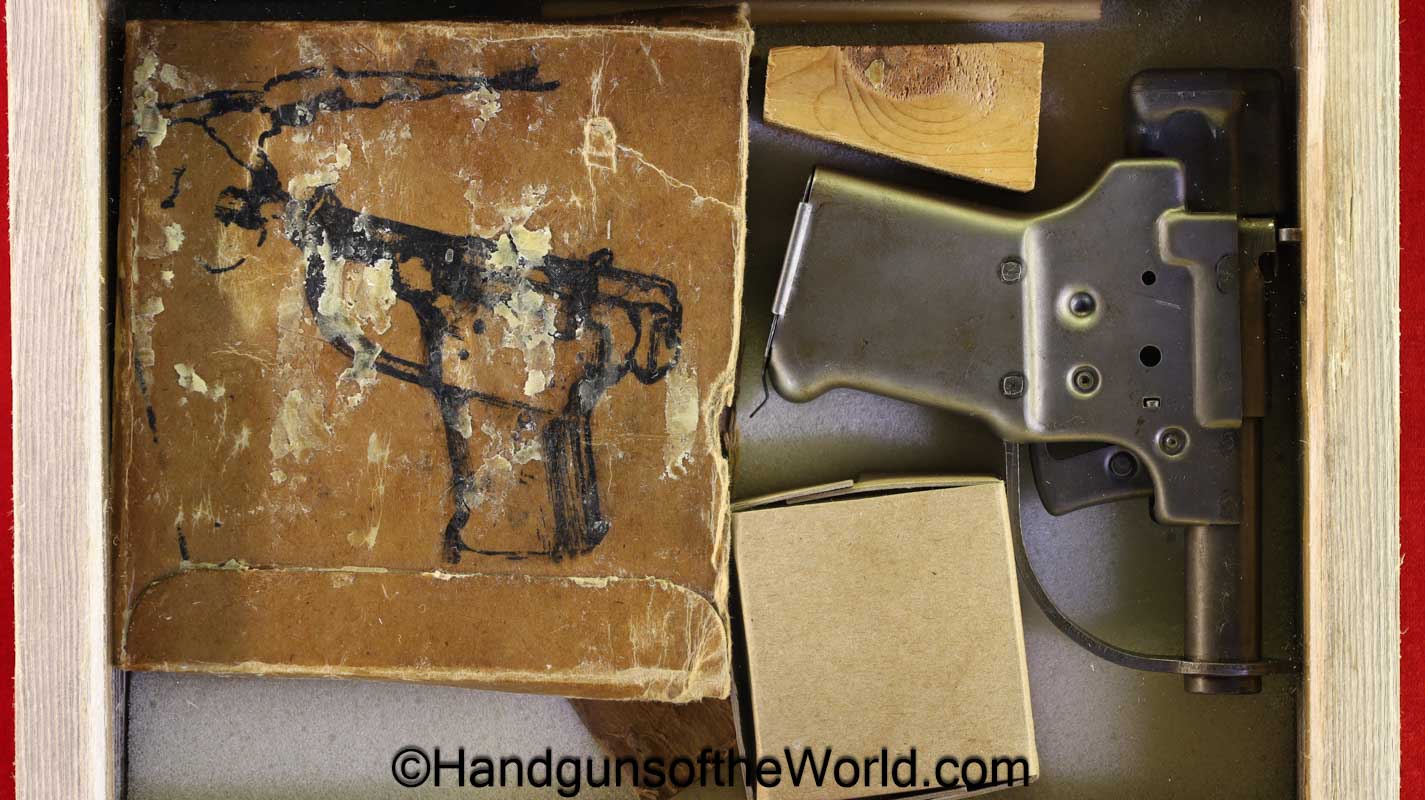 Guidelamp FP-45, .45acp Liberator. 1 of 1 Million built in 1942 by a division of General Motors to covertly arm the resistance fighters during WWII in France-so the story goes. This is excellent overall in the original waxed cardboard box-end piece detached, along with all accessories. The ammo box and wooden ejector dowel are modern replacements. 10 rounds of proper FA 42 marked ammo is included.