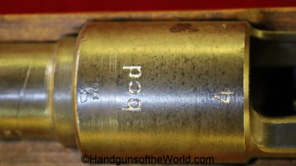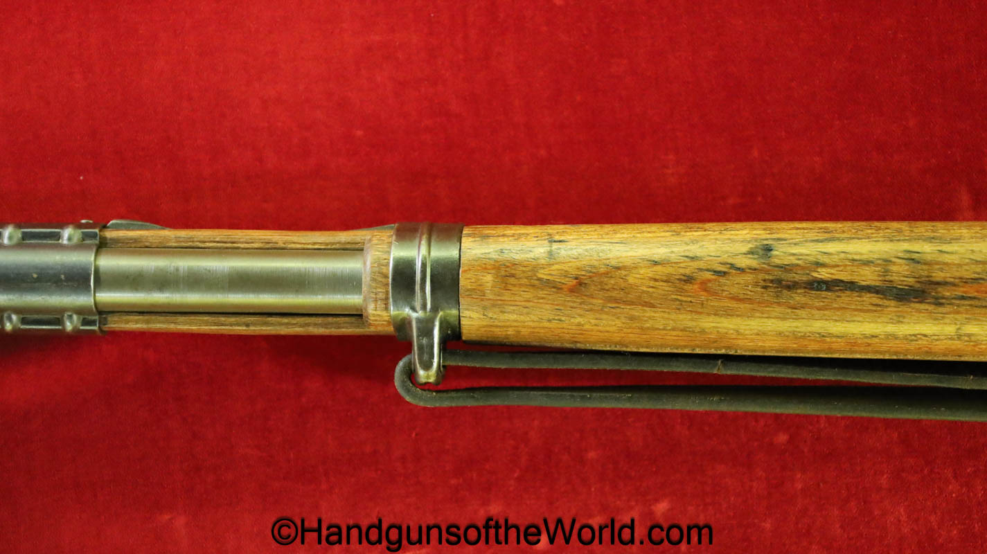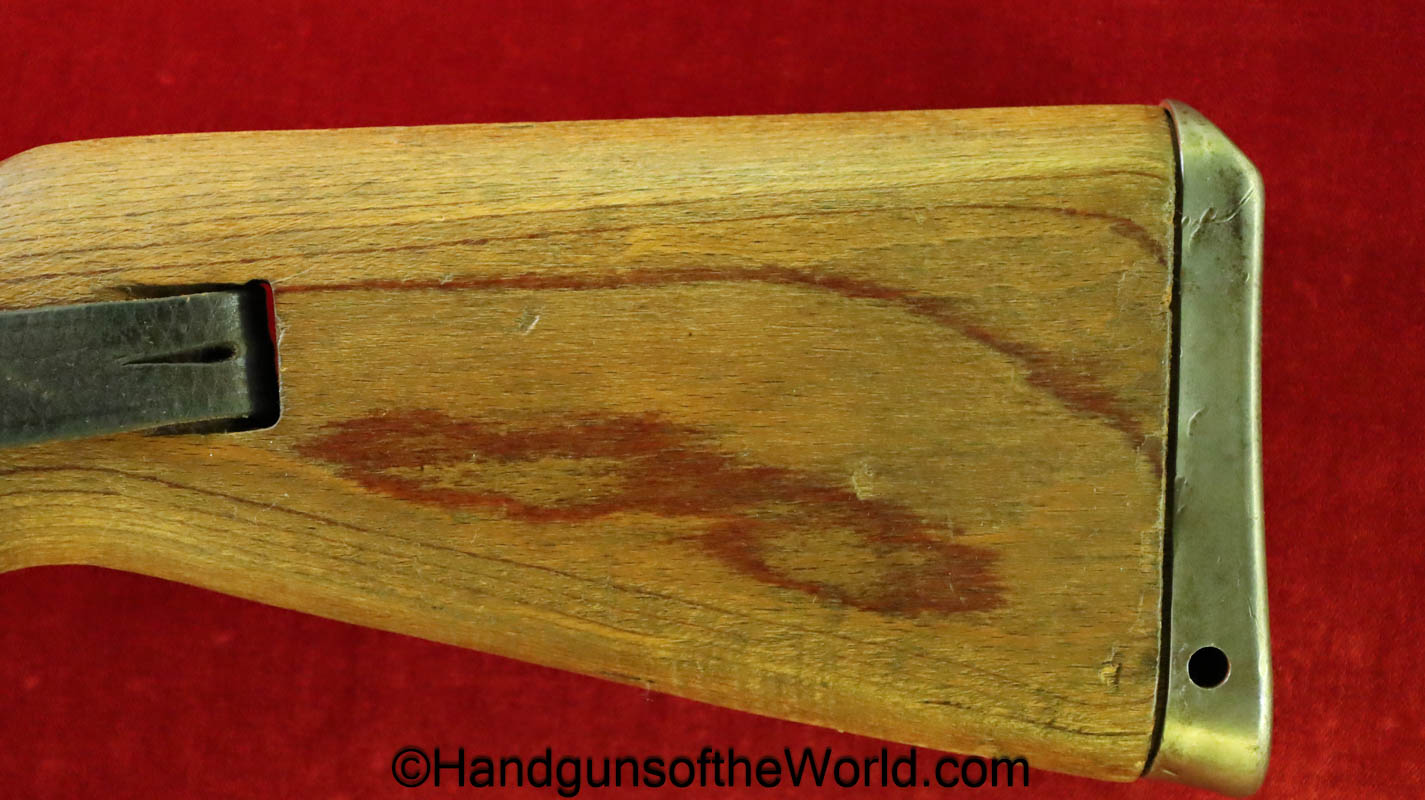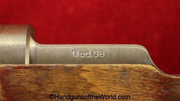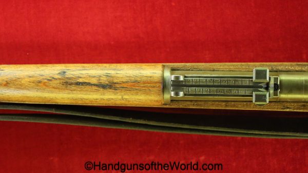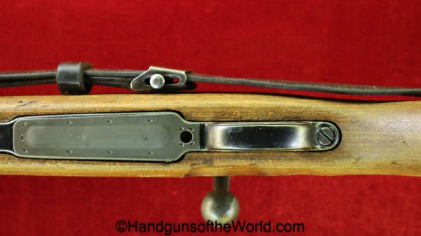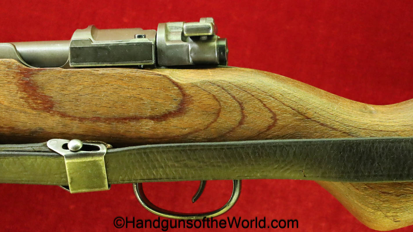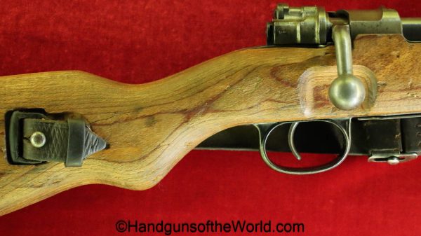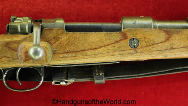 Gustloff-Werke 98K, BCD-4 on the chamber. This is lightly Waa Eagle H, German WWII proofed on the late war laminate stock. This has all matching serial numbers, and no importer markings. This has all phosphate parts but for the proper blue trigger guard housing. This retains about 95% phosphate with some browning showing on the chamber area. This has nice wood and an excellent bore.