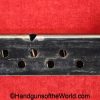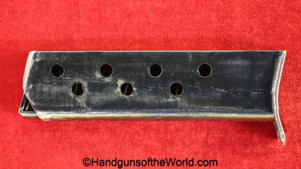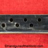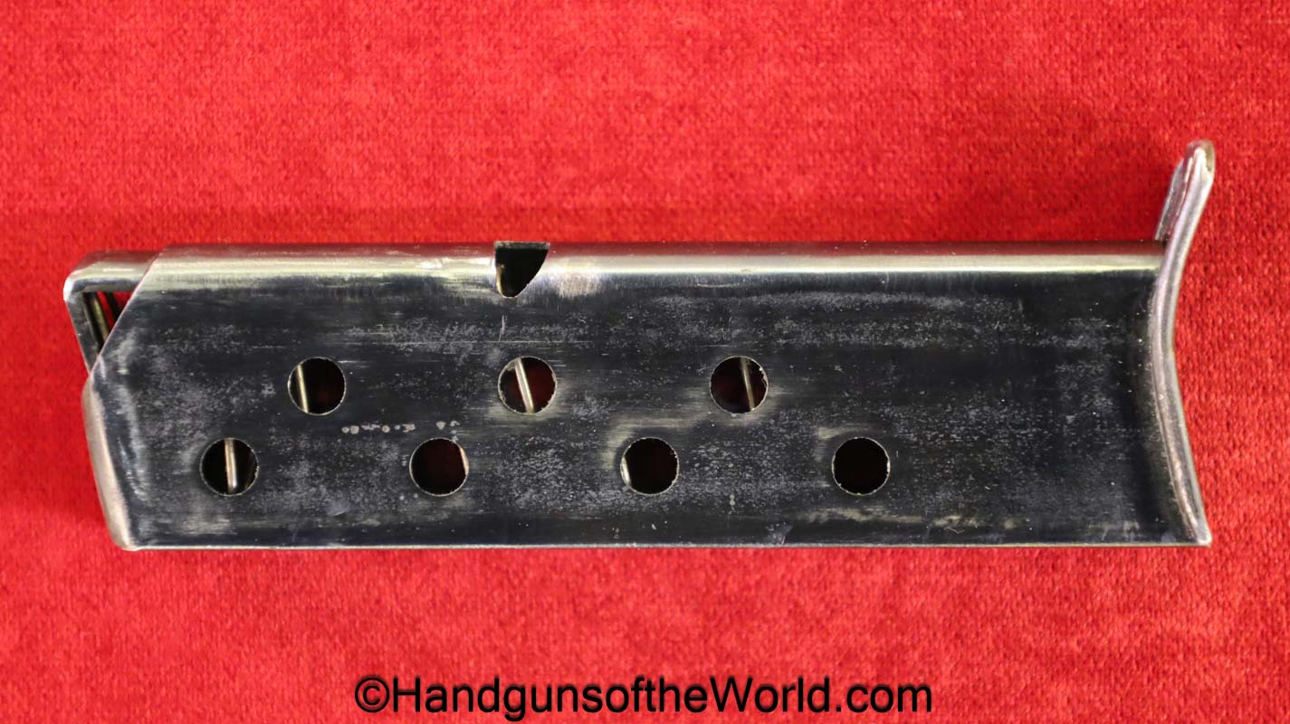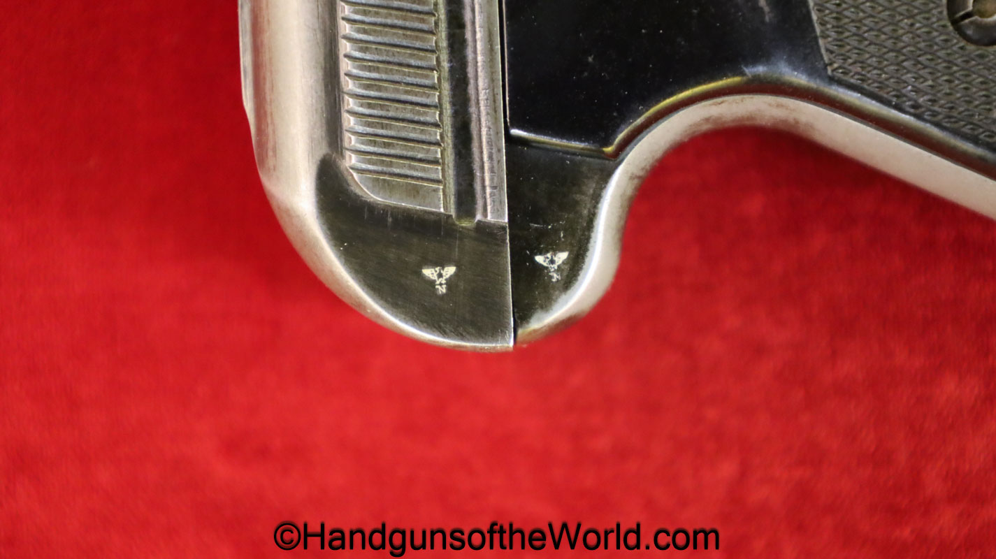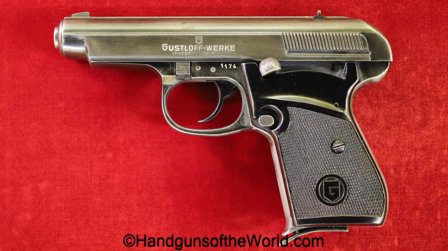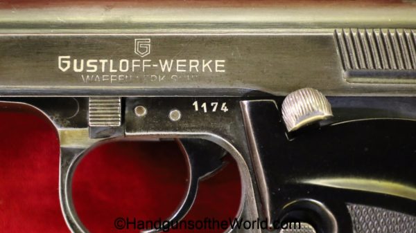 Gustloff-Werke Pocket, 7.65mm. This is German WWII era Eagle N proofed on the frame, slide and barrel. This has the rare black Bakelite grips with Gustloff-Werke logo. This has the alloy frame and a steel slide. This has all matching numbers, but for the correct finger extension base magazine. There is some finish remaining and the bore is excellent. These experimental pistols never went into full production, and it is estimated that fewer than 500 were ever built and even fewer were actually proofed, like this one.