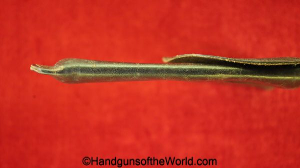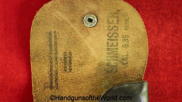 Period Haenel Schmeisser Model 1 Pistol Holster. This is a brown leather pocket pattern with a snap closure-missing the cover. This has the Akah logo on the front, and is ink stamped Schmeisser-Cal 6.35mm inside, and Browning 6.35 has been lined out. Overall VG+.