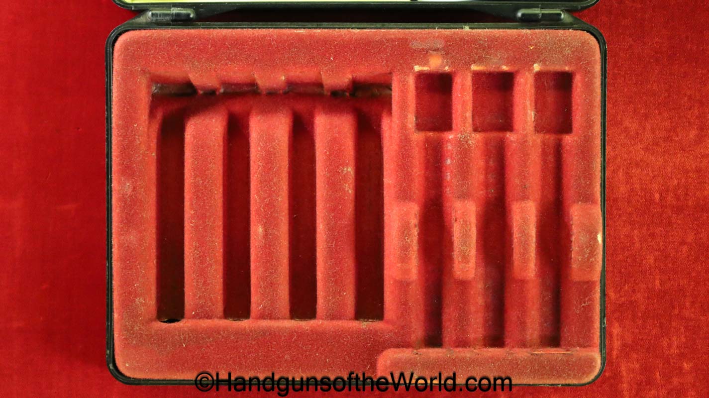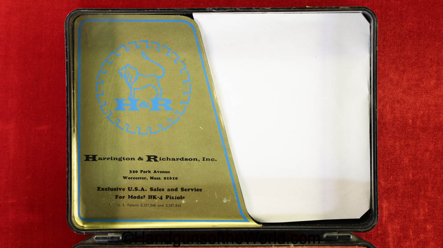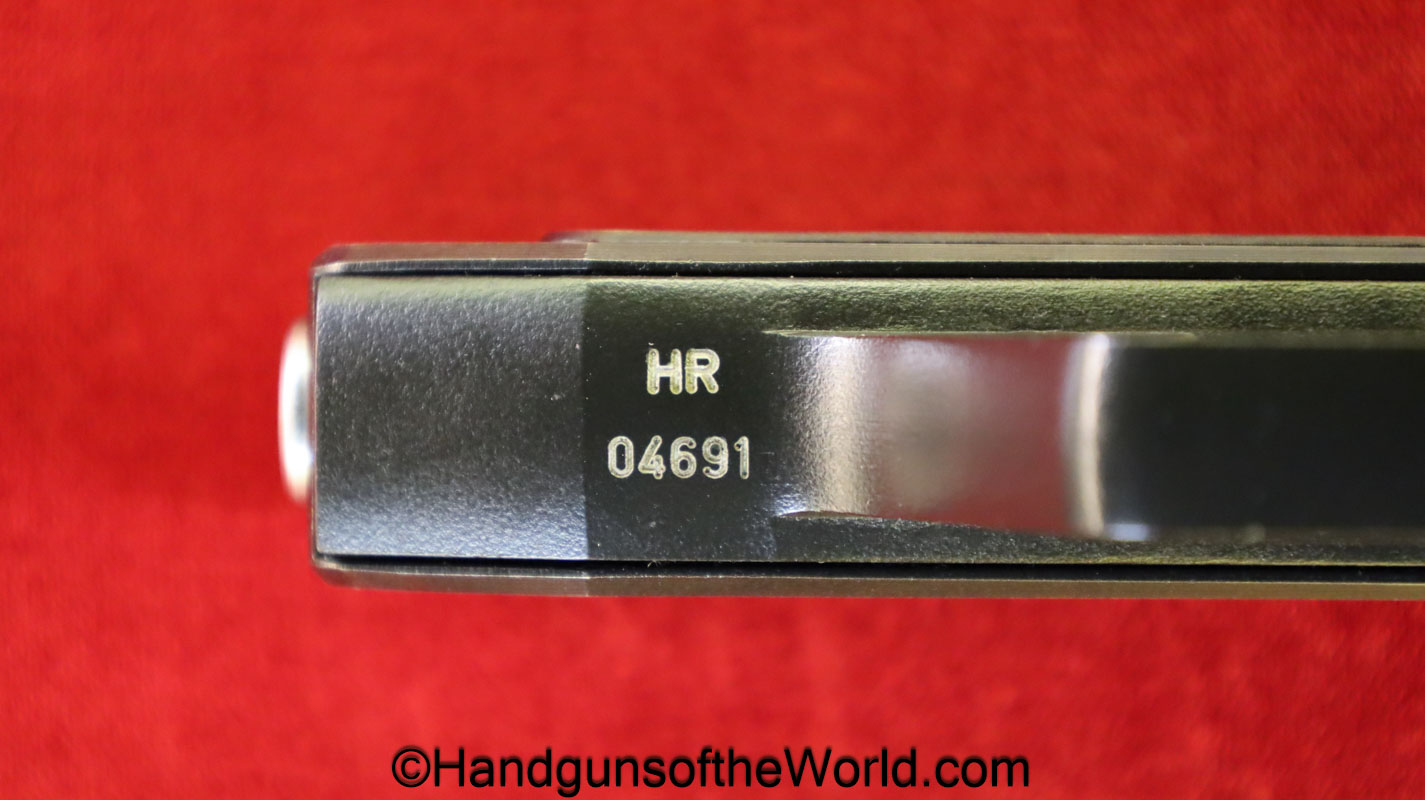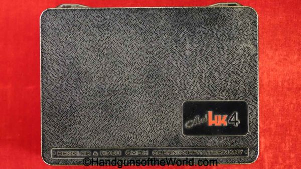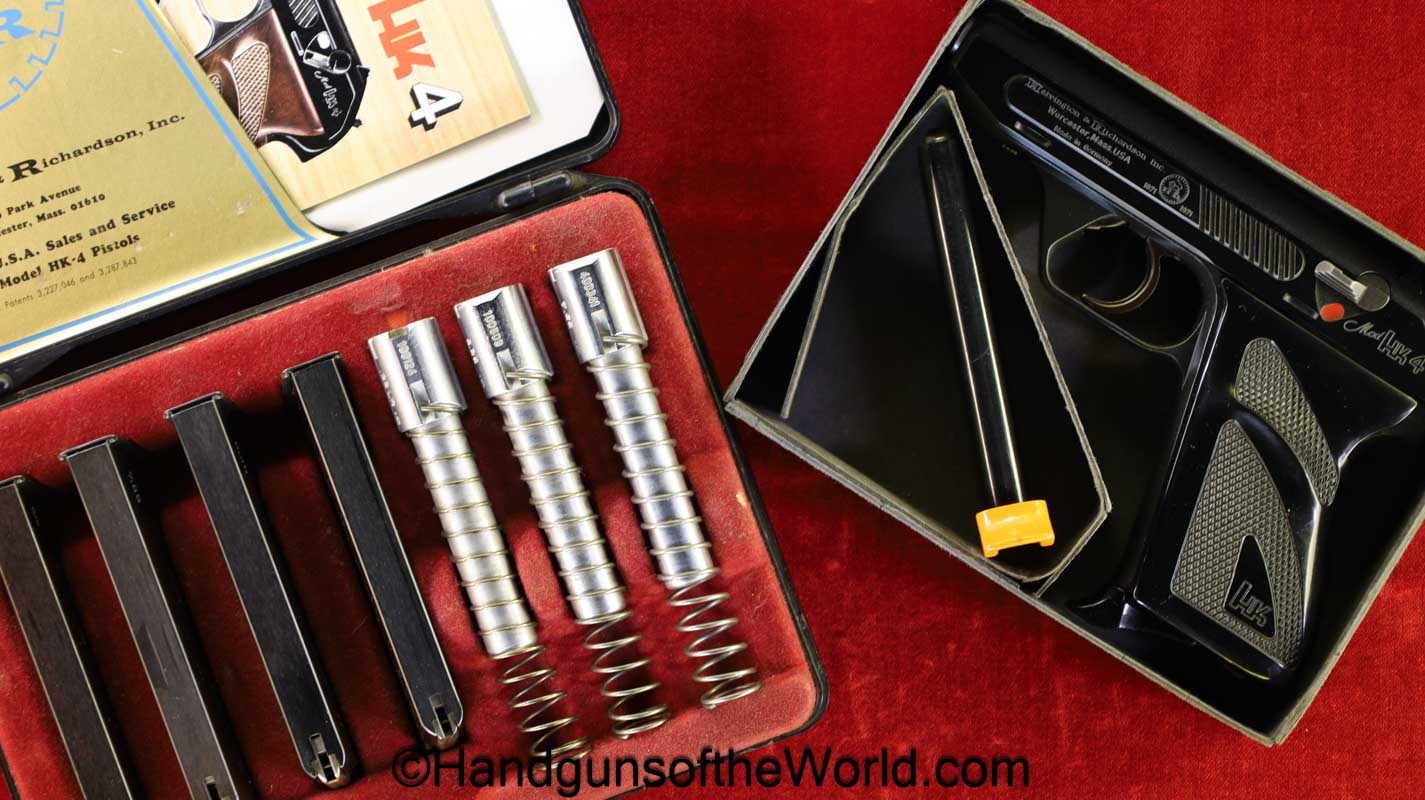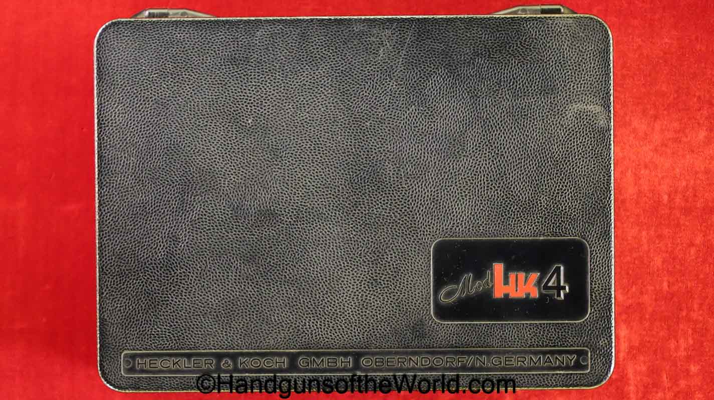 Heckler & Koch HK4, .380 caliber with aluminum frame. This was imported by Harrington & Richardson, as marked on the slide. This has the black plastic grips, with 99+% blue and the bore is excellent. This comes with an original cardboard box missing the labels. This also comes with the rare Tri-Cal Conversion Kit with a 22, 6.35mm & 7.65mm barrels and magazines. This will include 2 9mm magazines and 2 22 caliber magazines along with the owner’s manuals, extractor and pin punch to assist with the change in calibers. Overall Excellent.