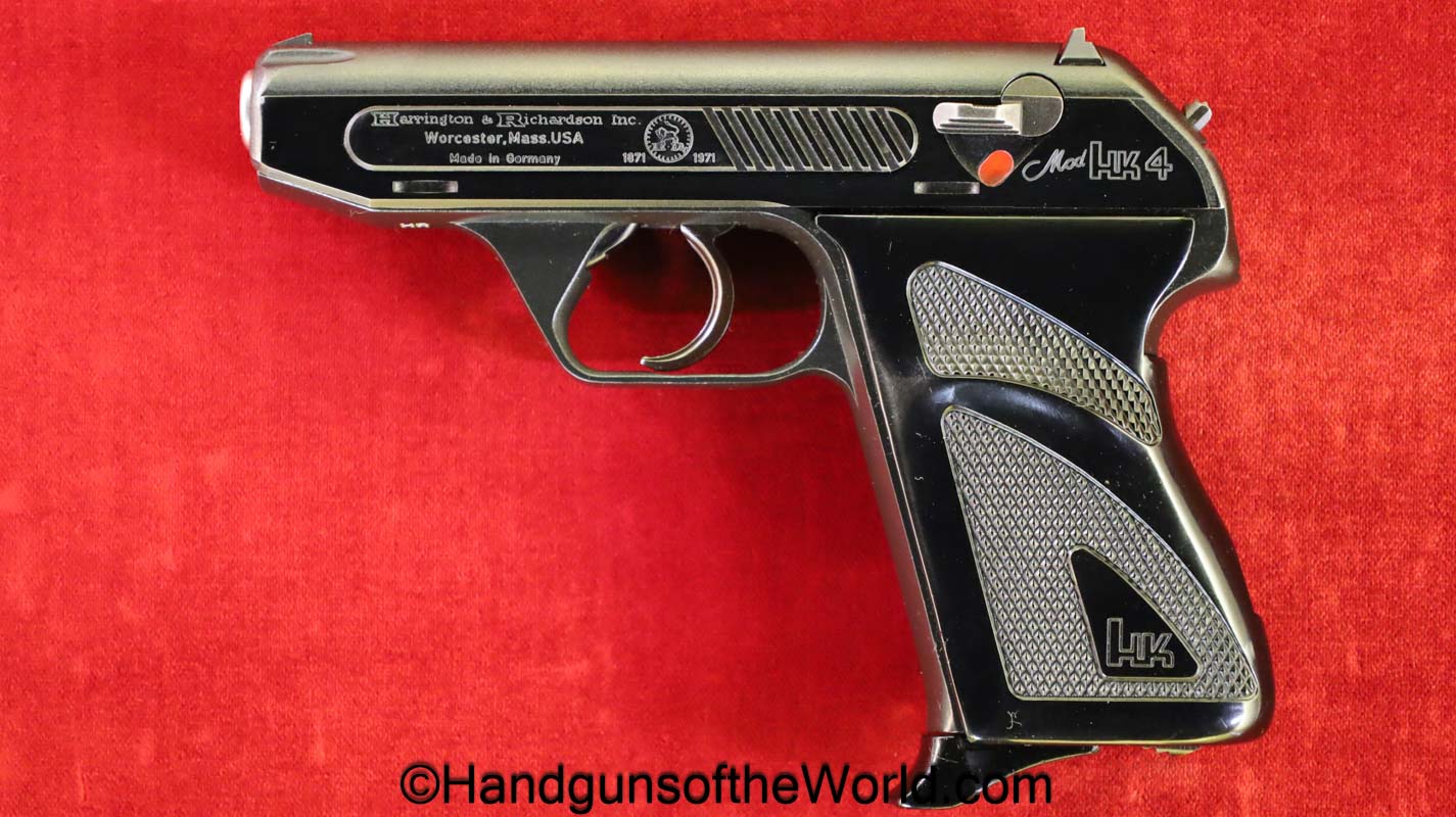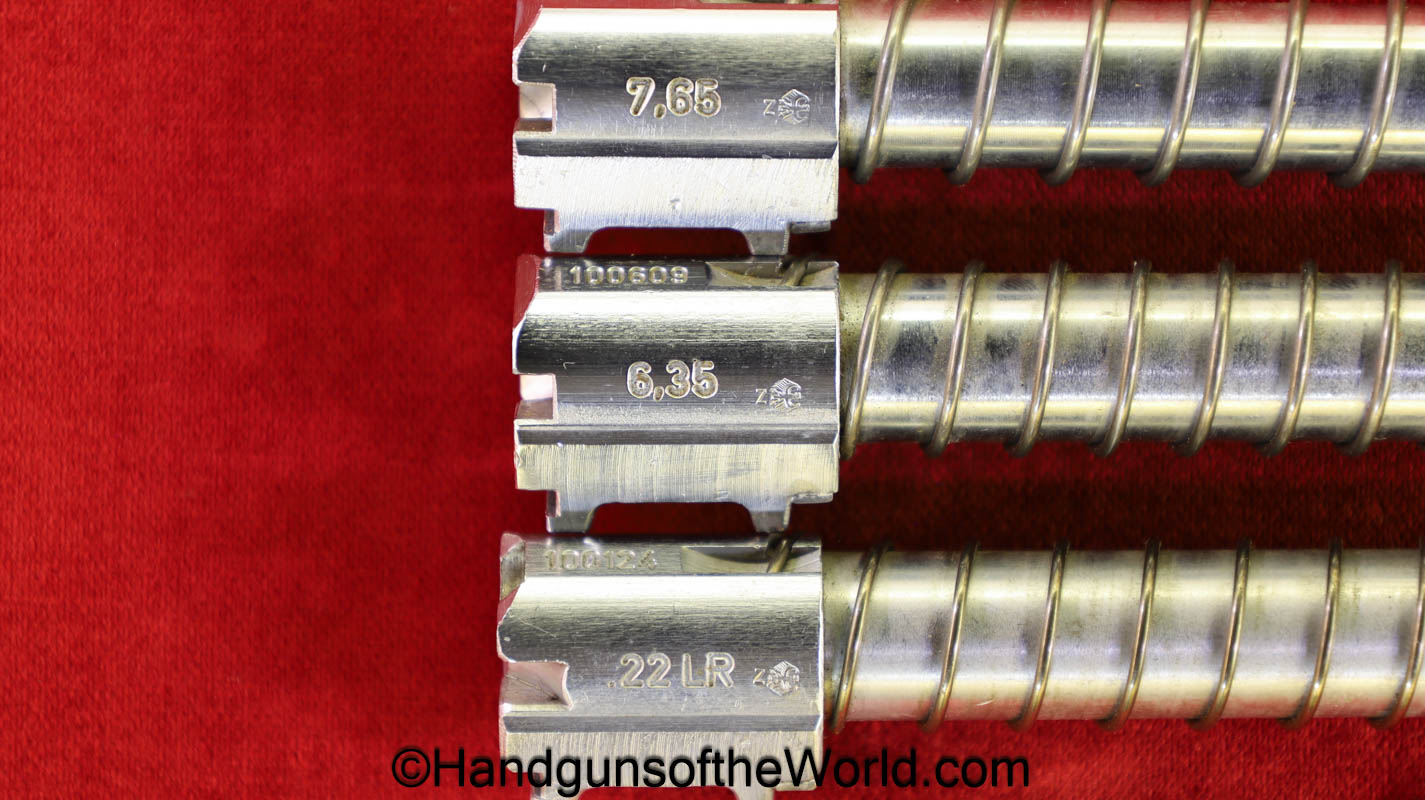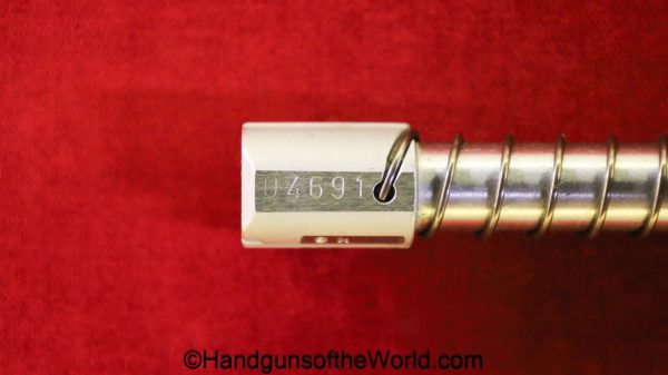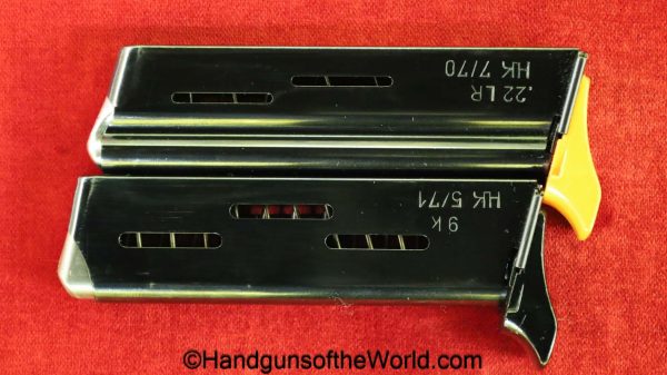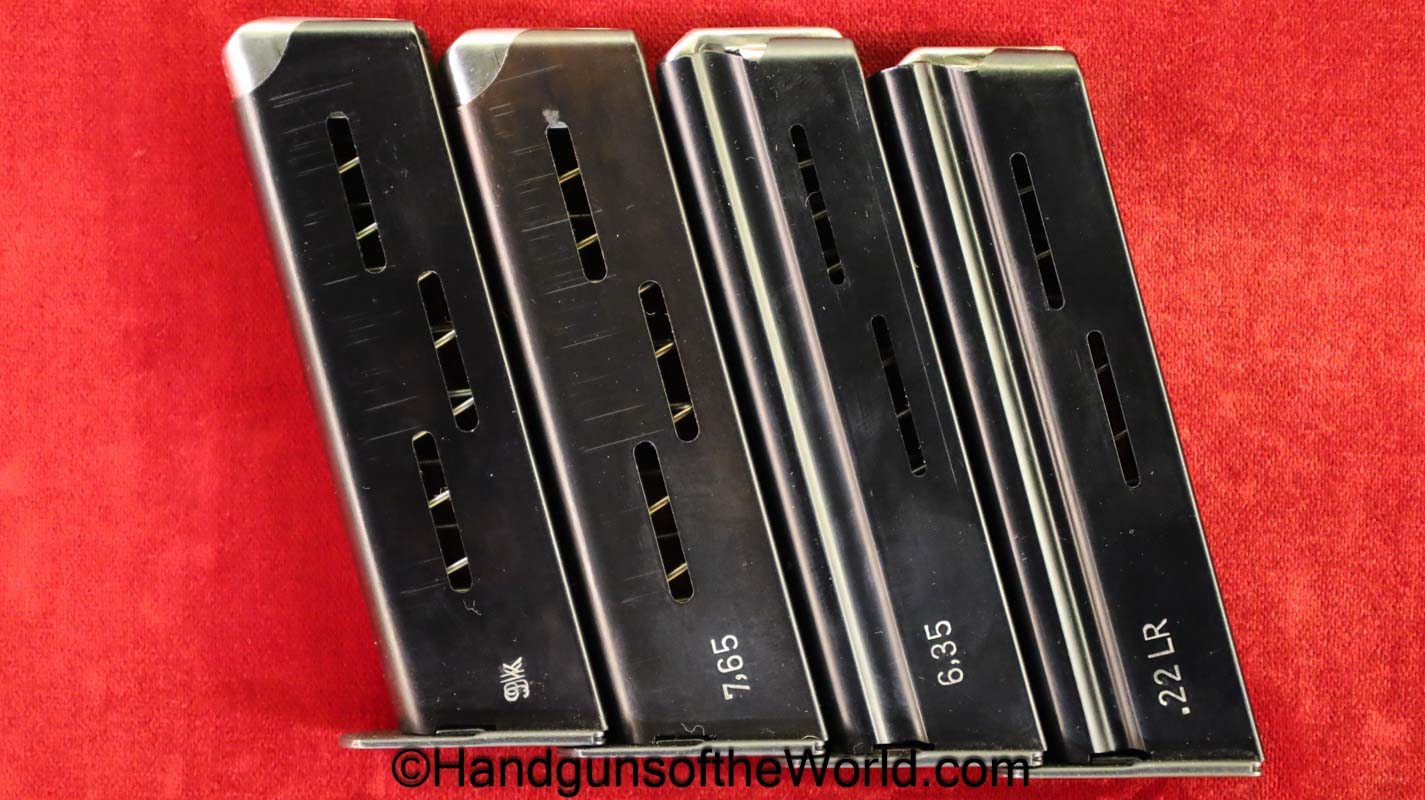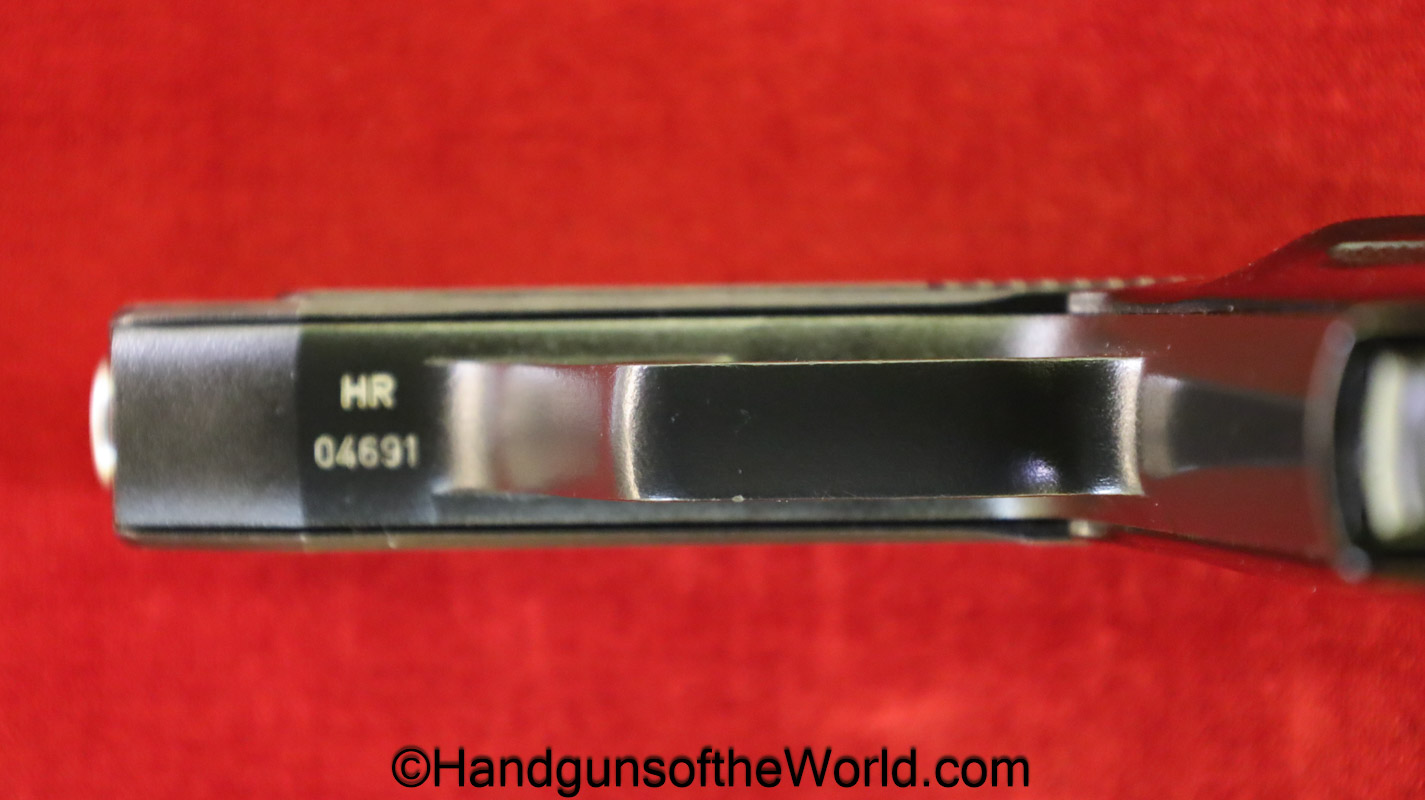 Heckler & Koch HK4, .380 caliber with aluminum frame. This was imported by Harrington & Richardson, as marked on the slide. This has the black plastic grips, with 99+% blue and the bore is excellent. This comes with an original cardboard box missing the labels. This also comes with the rare Tri-Cal Conversion Kit with a 22, 6.35mm & 7.65mm barrels and magazines. This will include 2 9mm magazines and 2 22 caliber magazines along with the owner’s manuals, extractor and pin punch to assist with the change in calibers. Overall Excellent.