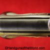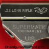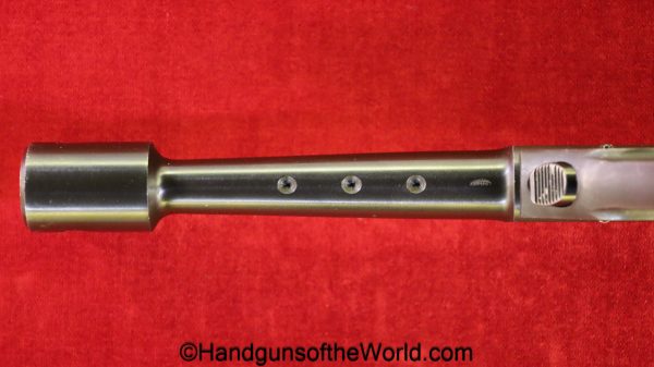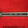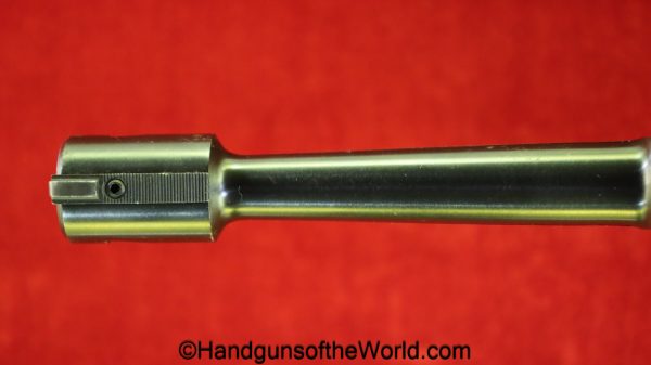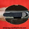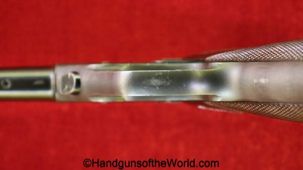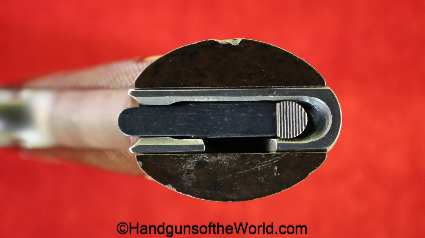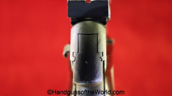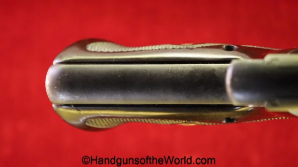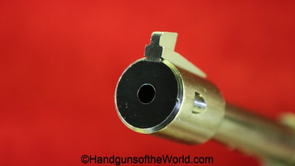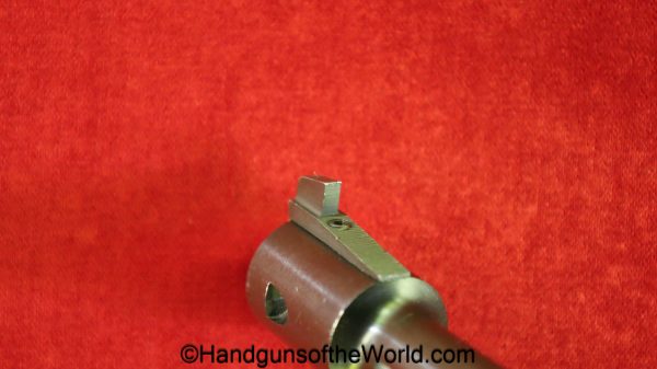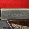 High Standard Model 102, 22lr. This has the 6 3/4″ Space gun barrel and brown plastic grips with HS medallions. This is boldly stamped US on the left side of the frame. The blue rates about 95% and the bore is excellent.