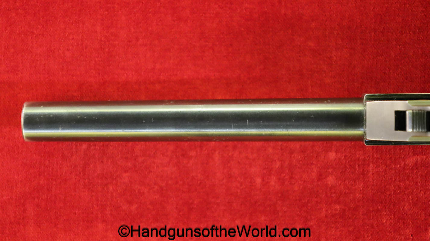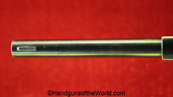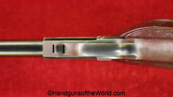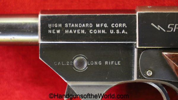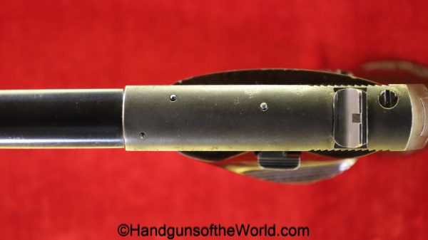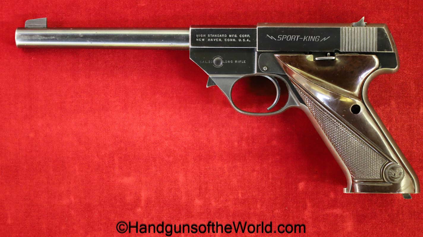 High Standard Sport King, .22lr. This has the 6 3/4″ barrel and brown plastic grips with thumb rest. The blue rates about 85% and the bore is excellent.
