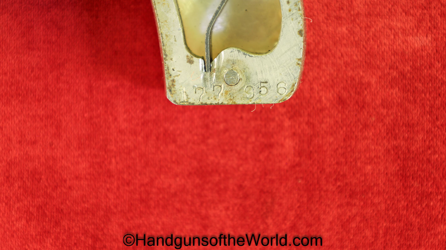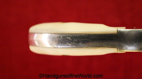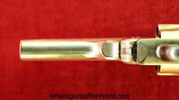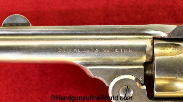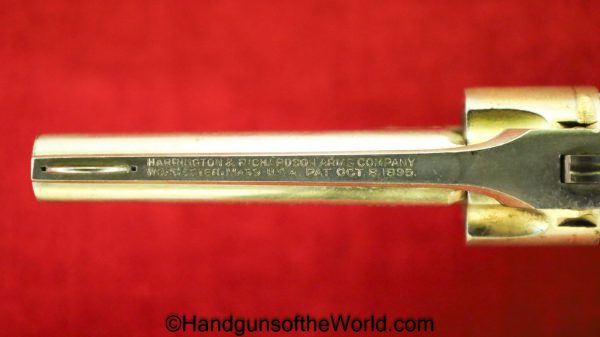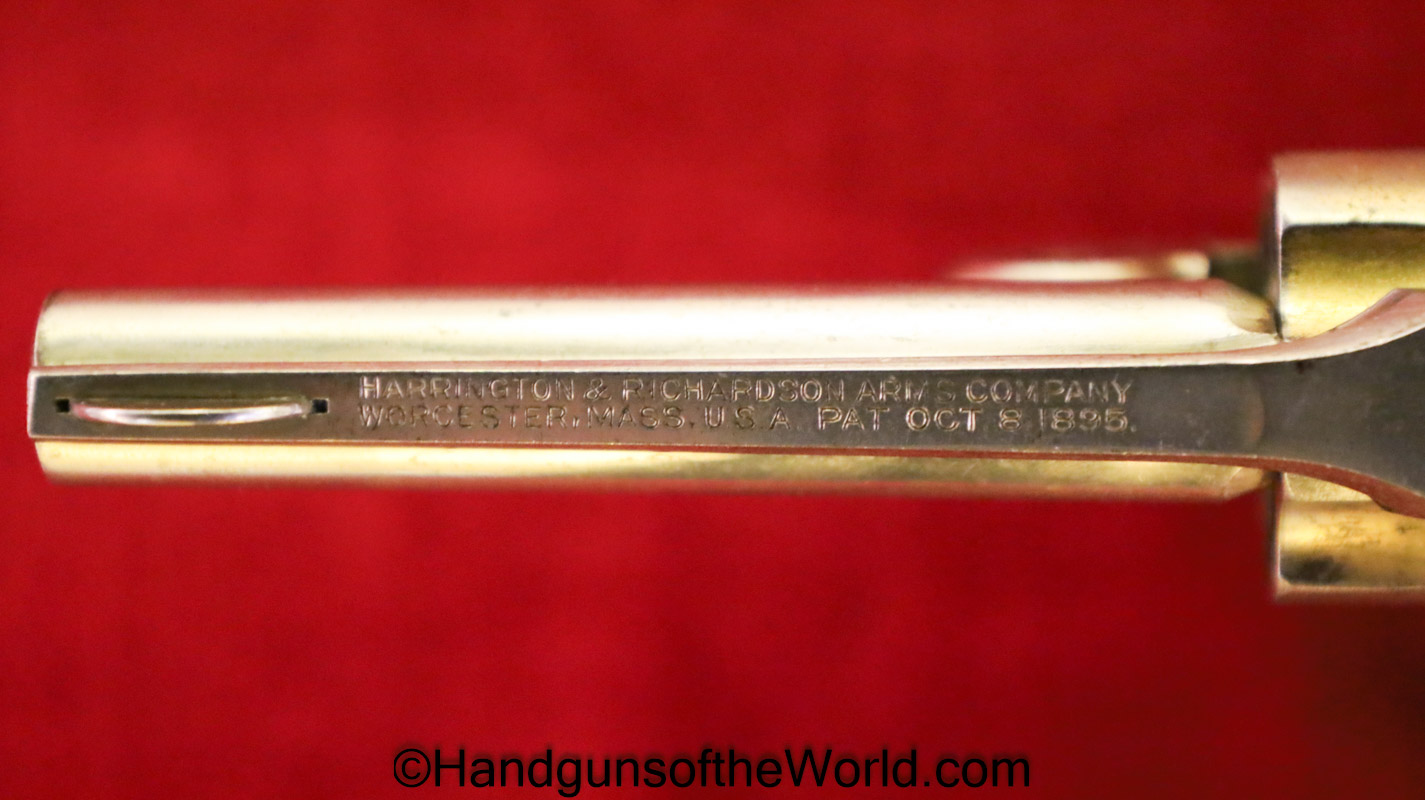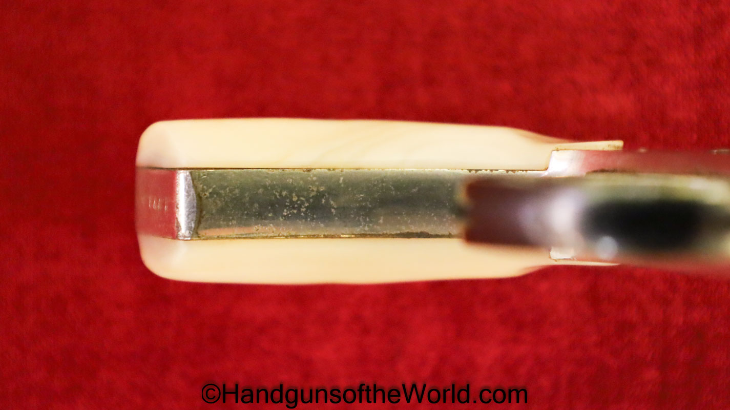 Harrington & Richardson Hammerless, .32 S&W. This has the 3″ barrel and smooth pearl grips. This has a gold washed cylinder and nickel otherwise. About 98% nickel remains and about 60% gold wash remains. the bore is VG+.