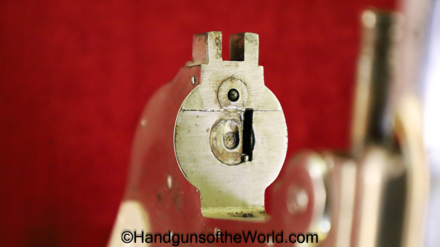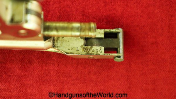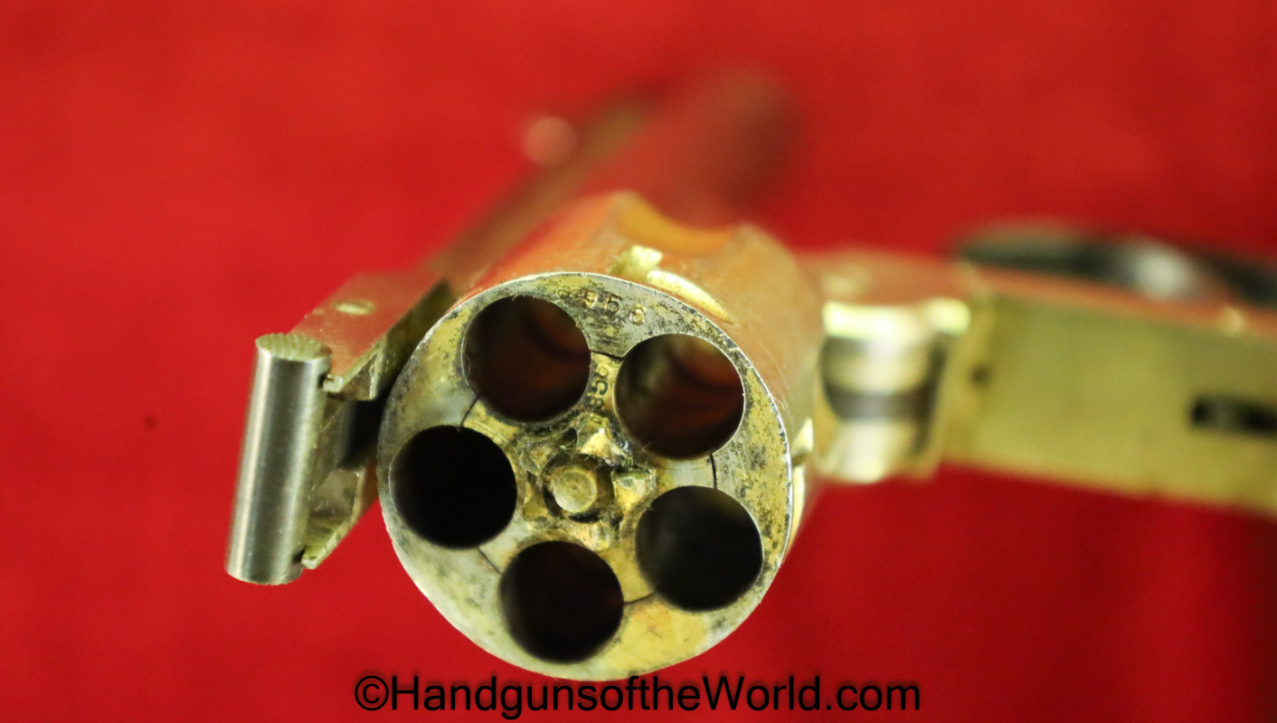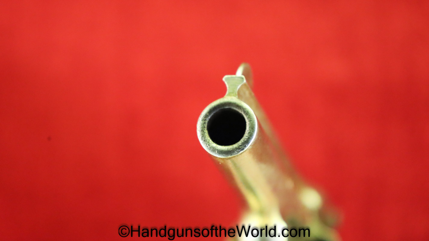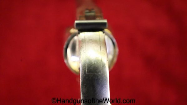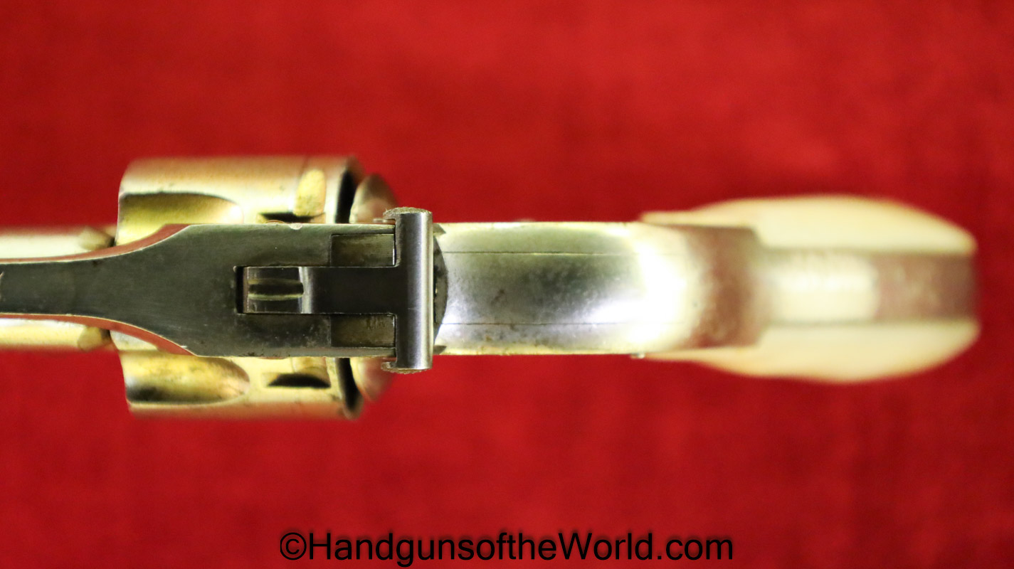 Harrington & Richardson Hammerless, .32 S&W. This has the 3″ barrel and smooth pearl grips. This has a gold washed cylinder and nickel otherwise. About 98% nickel remains and about 60% gold wash remains. the bore is VG+.