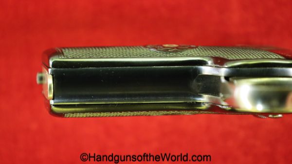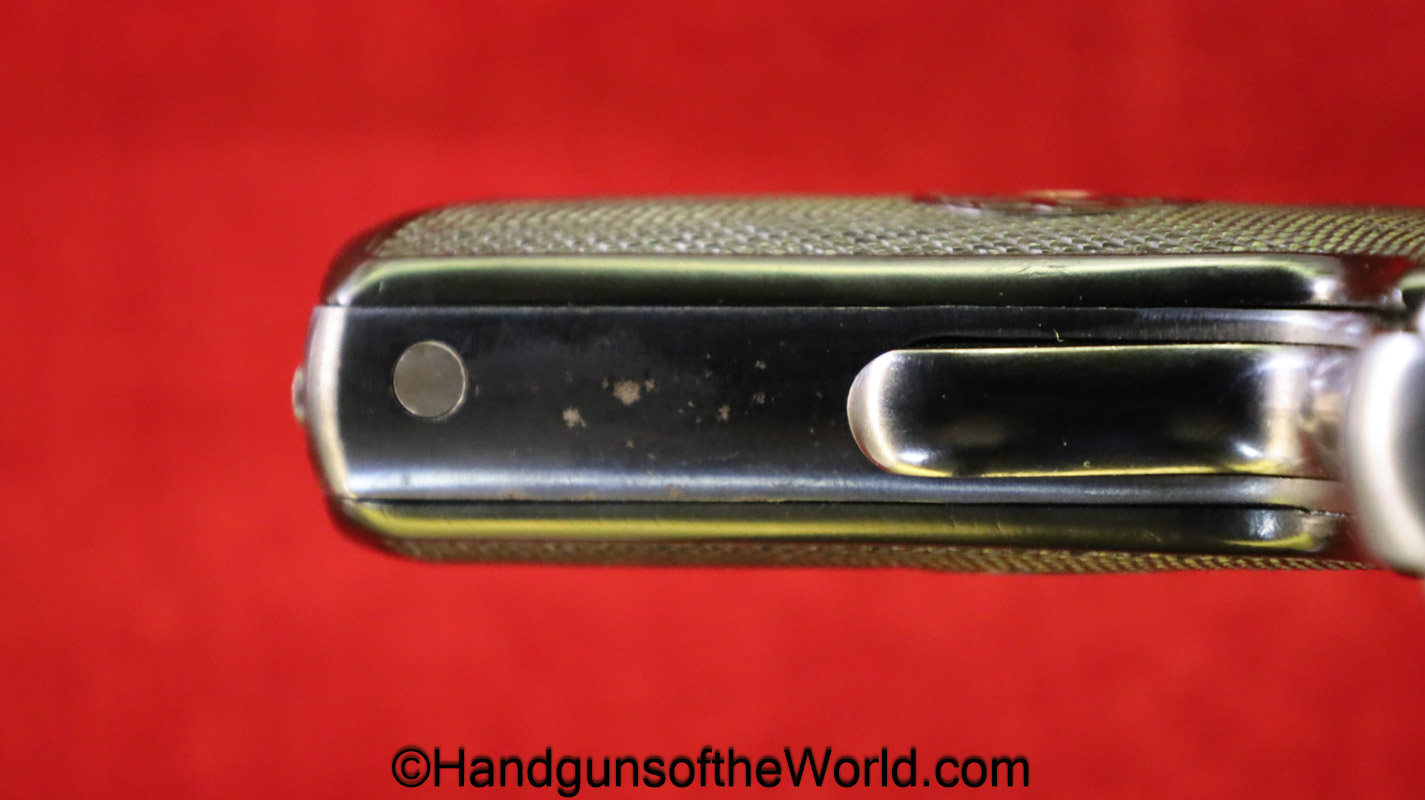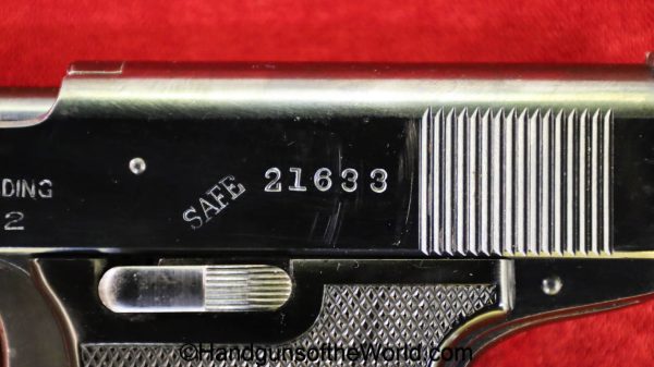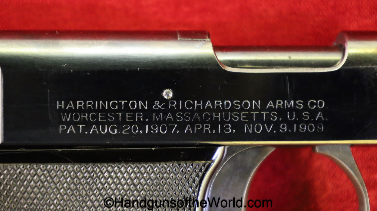 Harrington & Richardson Self Loading, 32acp. This has the black hard rubber grips and 16 fine slide serrations. The blue rates about 99% and the bore is excellent.