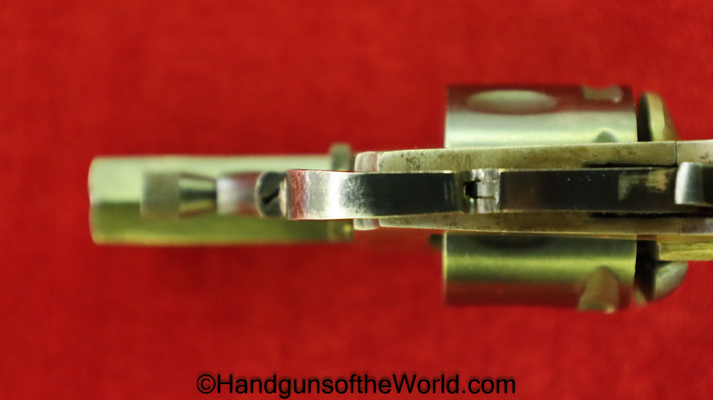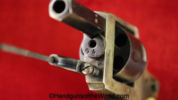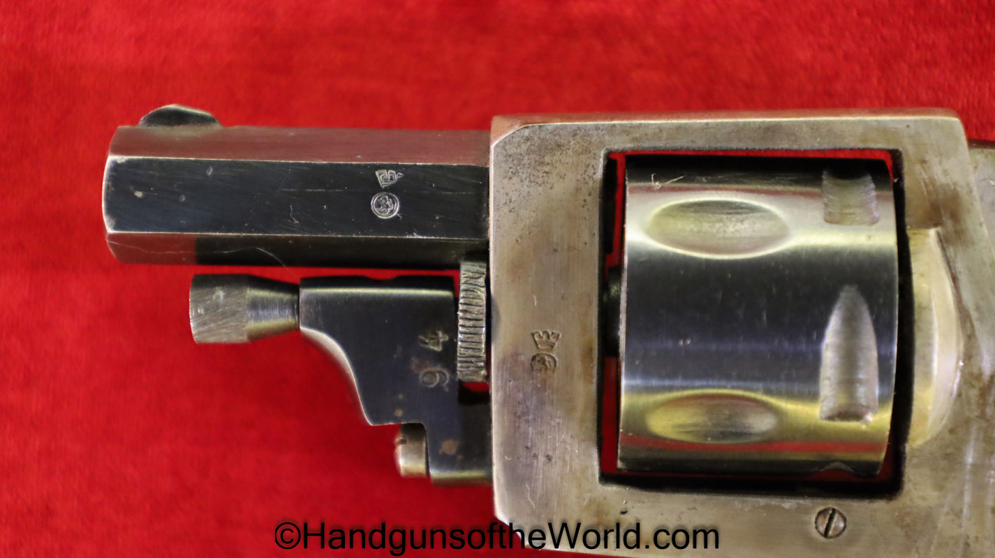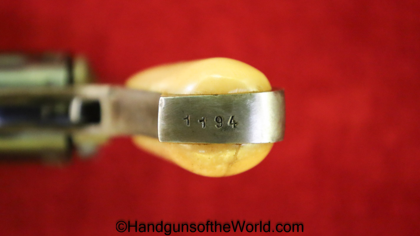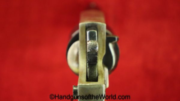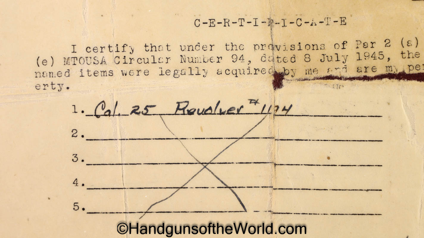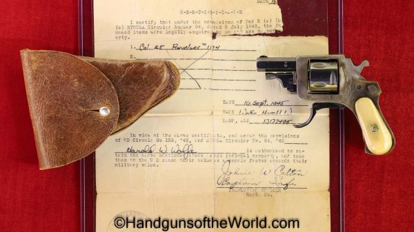 Italian Double Action Revolver, 6.35mm. This small folding trigger revolver is Italian proofed, has a 1 7/8″ octagon barrel and is about 4 1/2″ overall. This has smooth bone grips with a case-colored frame and blue small parts. There is a sliding button safety and works in Double action only. The finish rates about 95% and the bore is present. A period brown leather holster and a laminated, WWII capture paper is included.