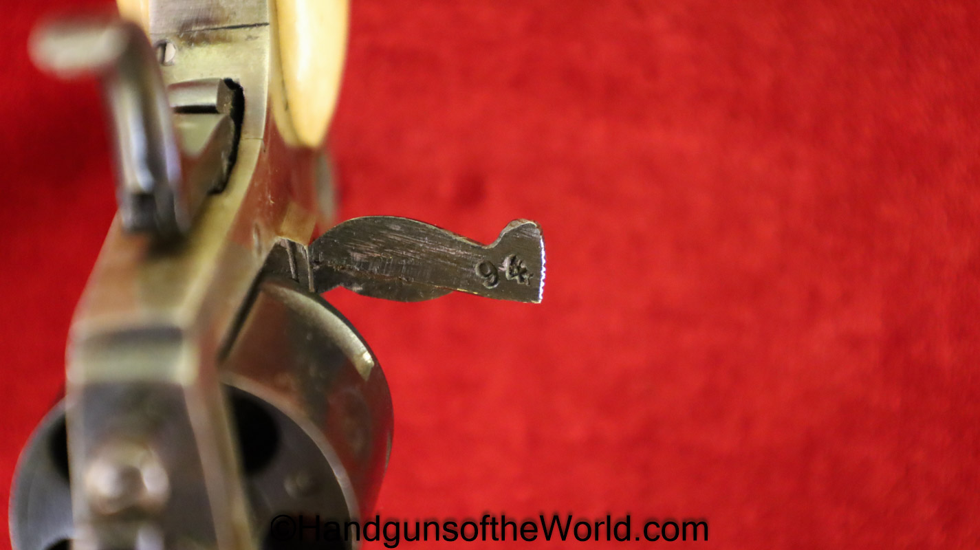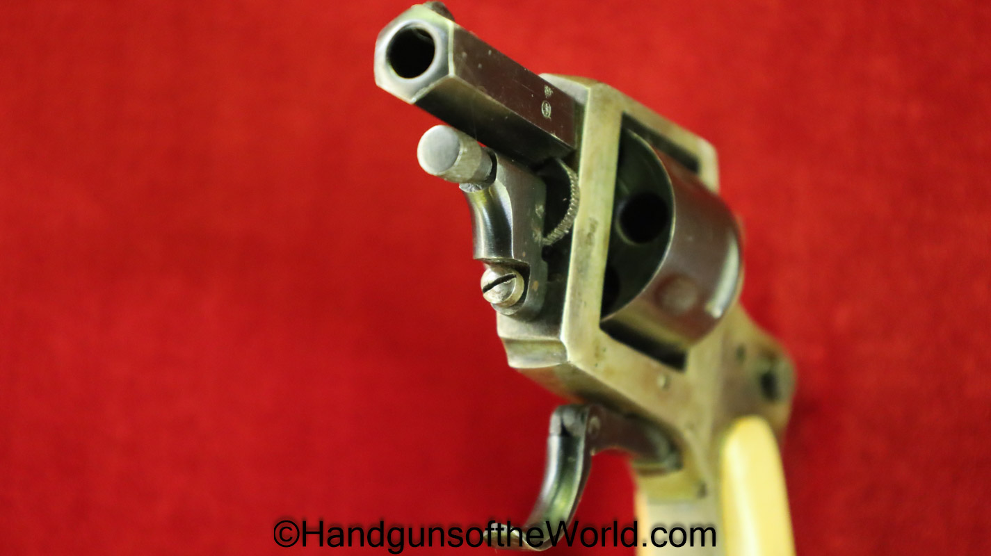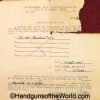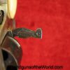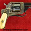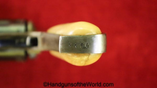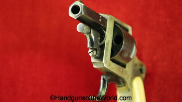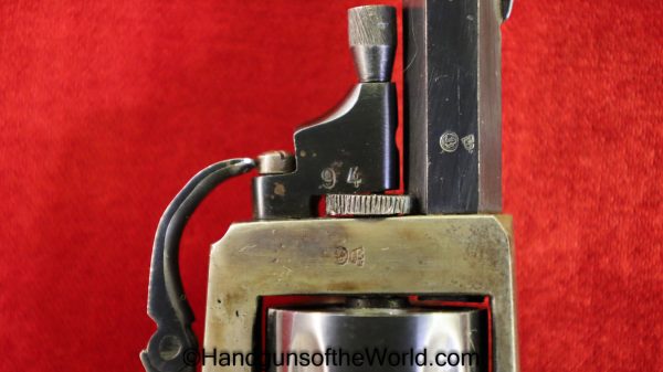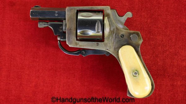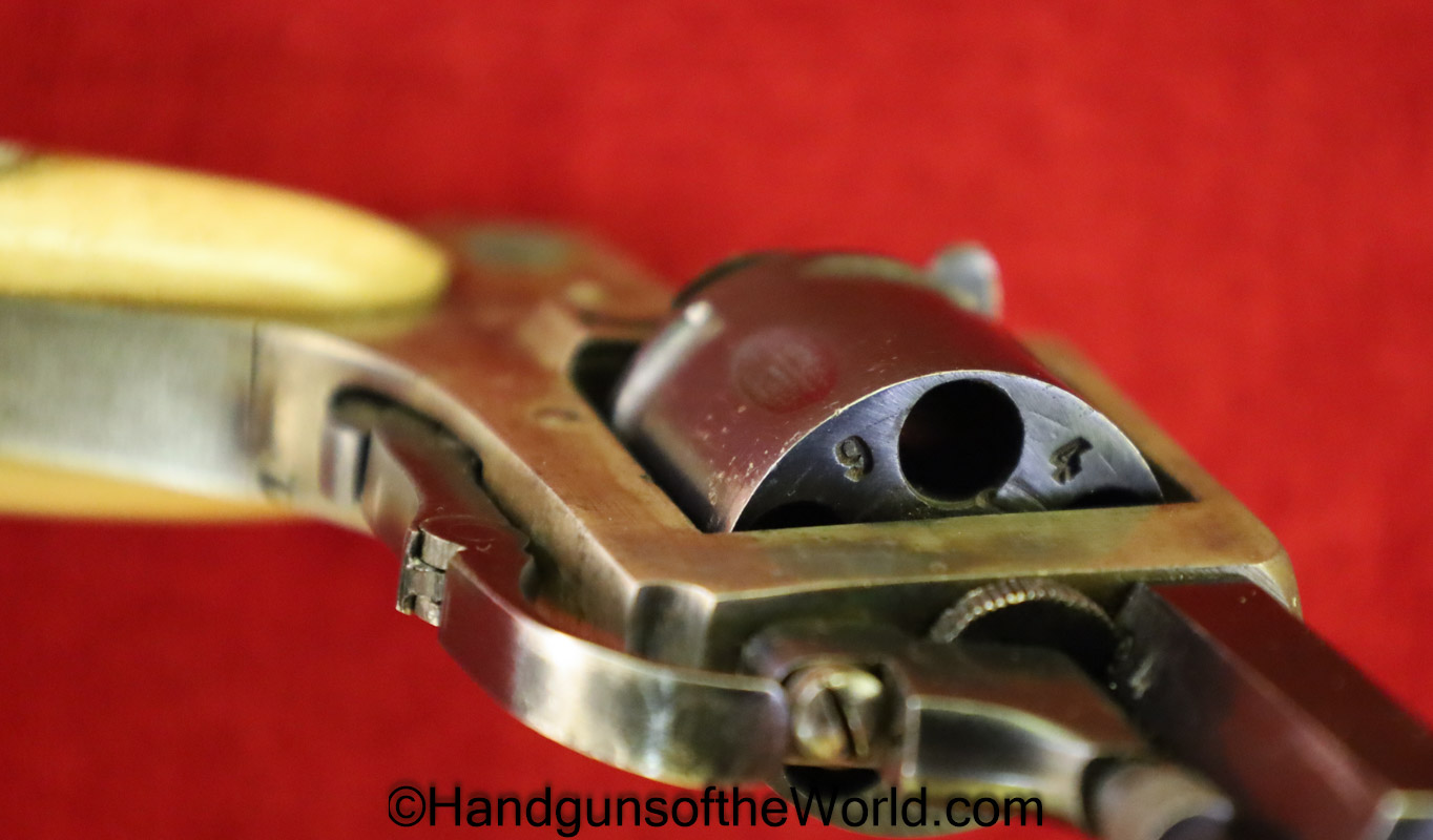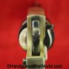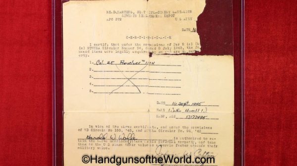 Italian Double Action Revolver, 6.35mm. This small folding trigger revolver is Italian proofed, has a 1 7/8″ octagon barrel and is about 4 1/2″ overall. This has smooth bone grips with a case-colored frame and blue small parts. There is a sliding button safety and works in Double action only. The finish rates about 95% and the bore is present. A period brown leather holster and a laminated, WWII capture paper is included.