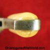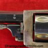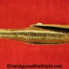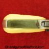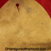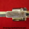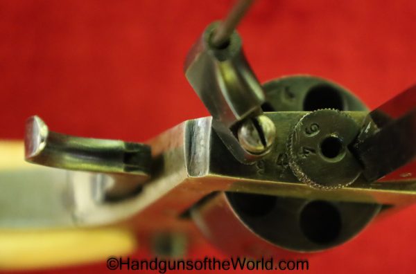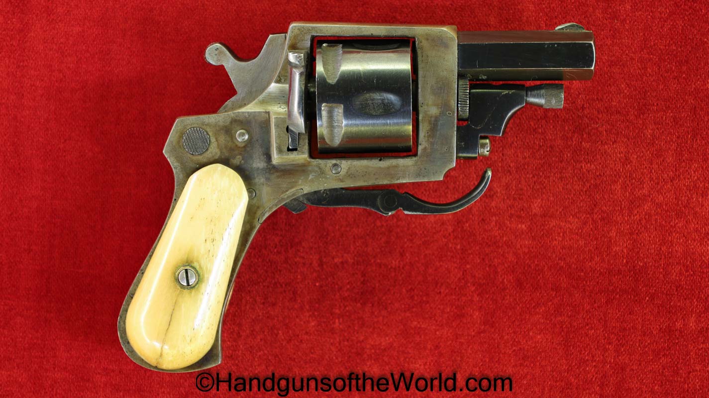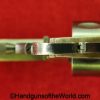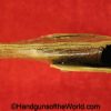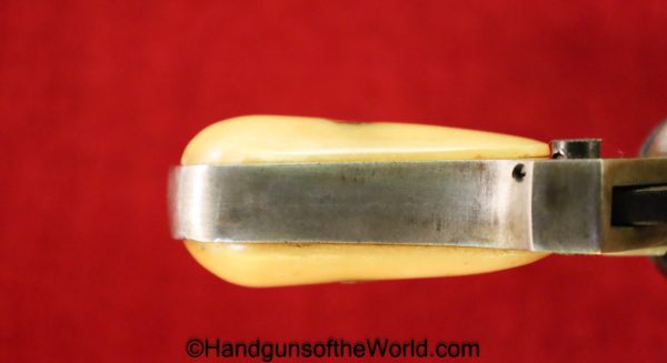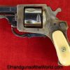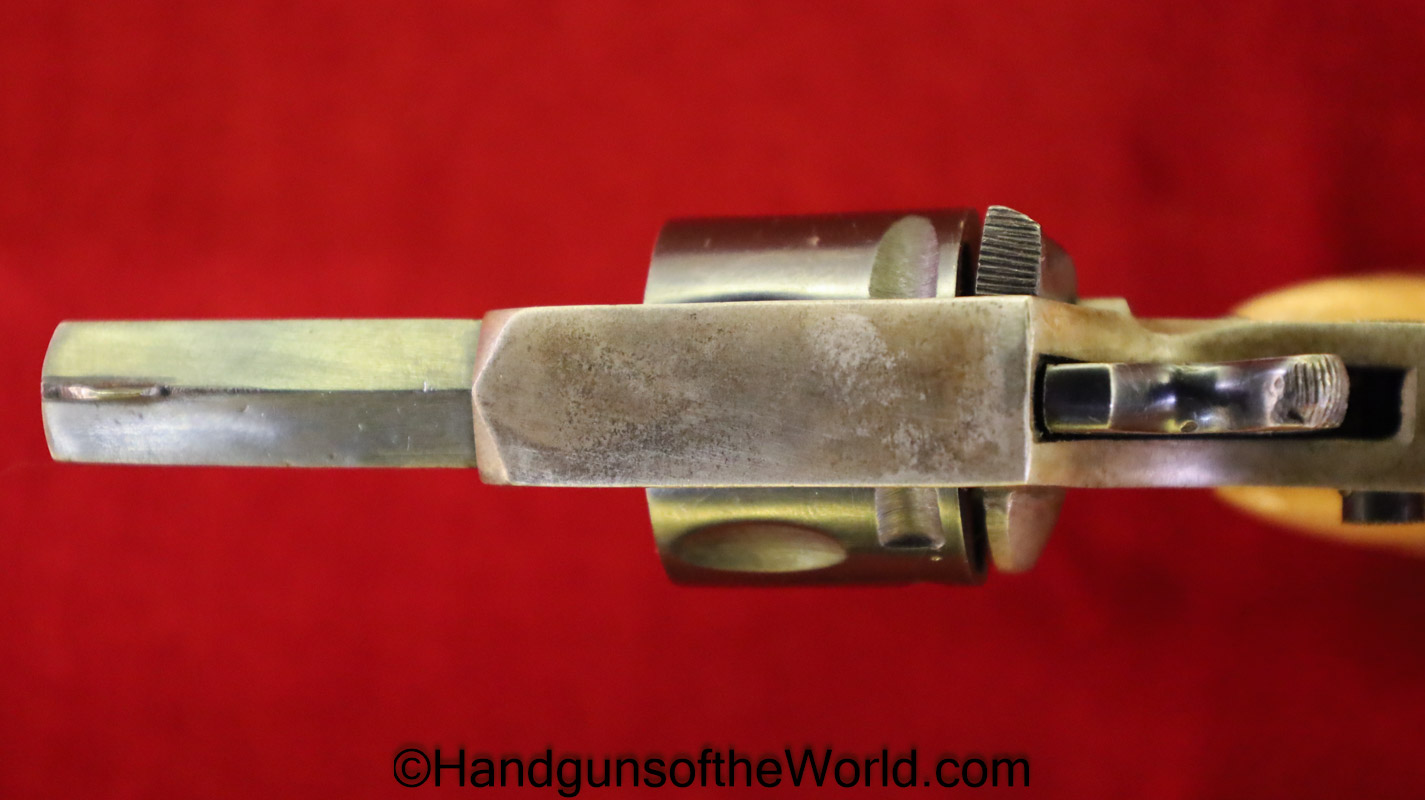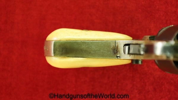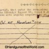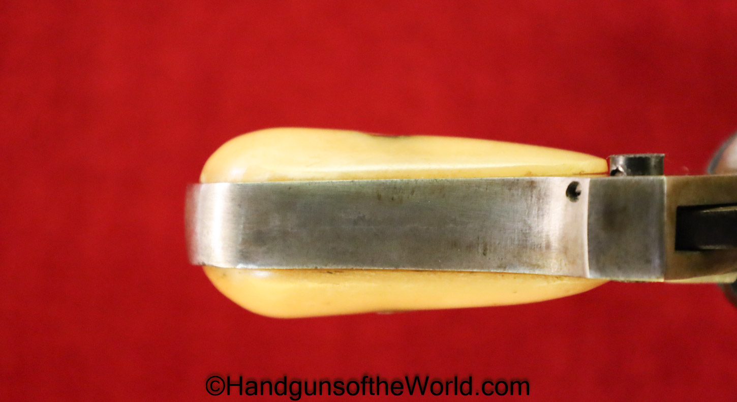 Italian Double Action Revolver, 6.35mm. This small folding trigger revolver is Italian proofed, has a 1 7/8″ octagon barrel and is about 4 1/2″ overall. This has smooth bone grips with a case-colored frame and blue small parts. There is a sliding button safety and works in Double action only. The finish rates about 95% and the bore is present. A period brown leather holster and a laminated, WWII capture paper is included.