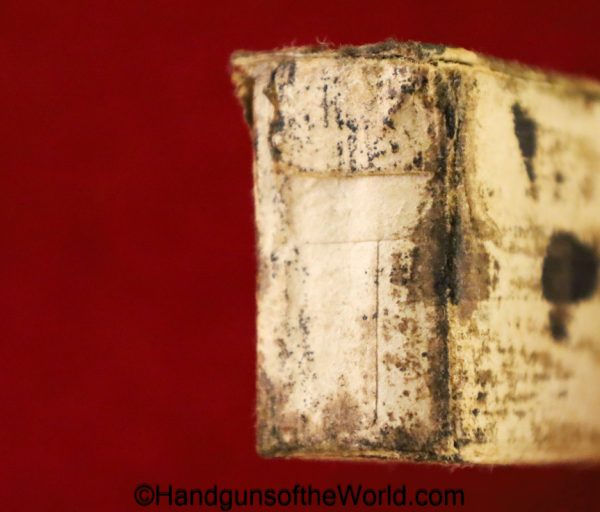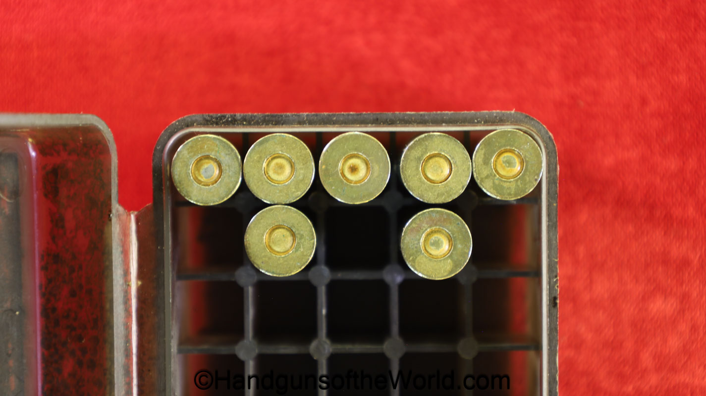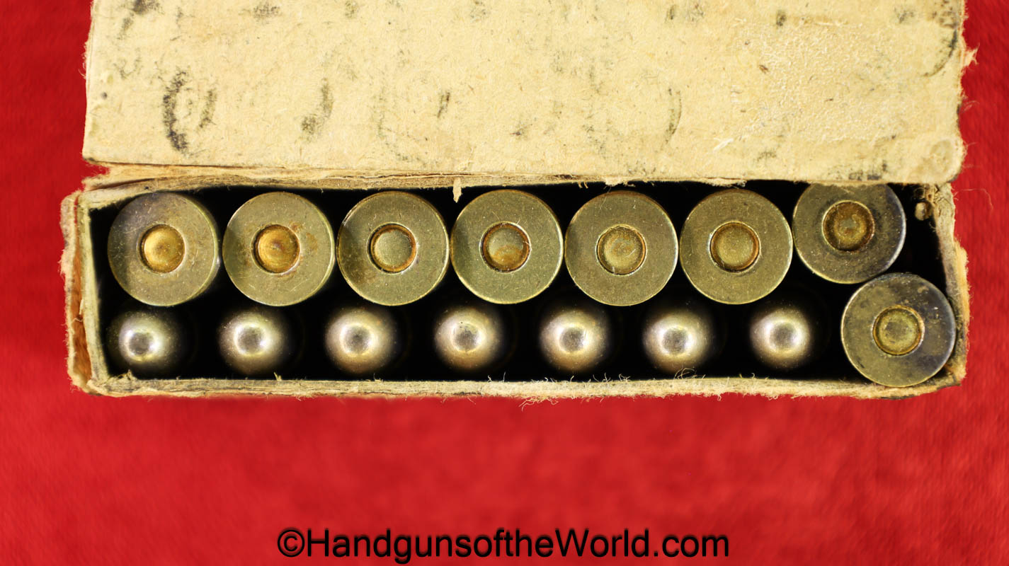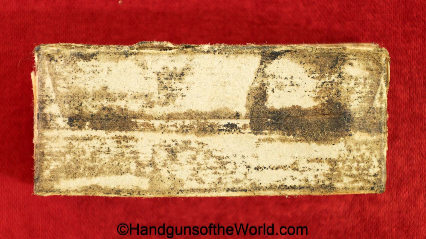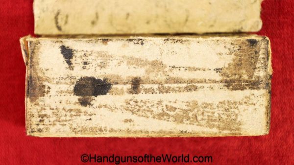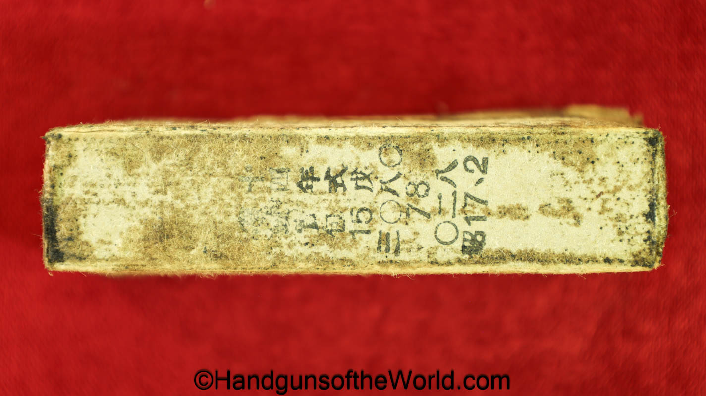Original Japanese Nambu, 8mm Pistol Ammunition. 16 rounds in an opened cardboard box with Japanese writing. This is dated 17.2. Overall VG with some staining.