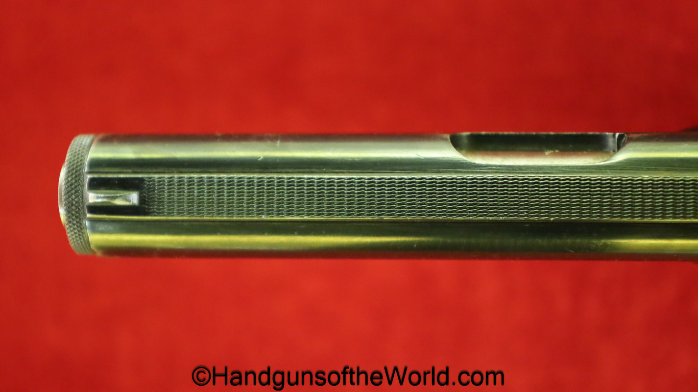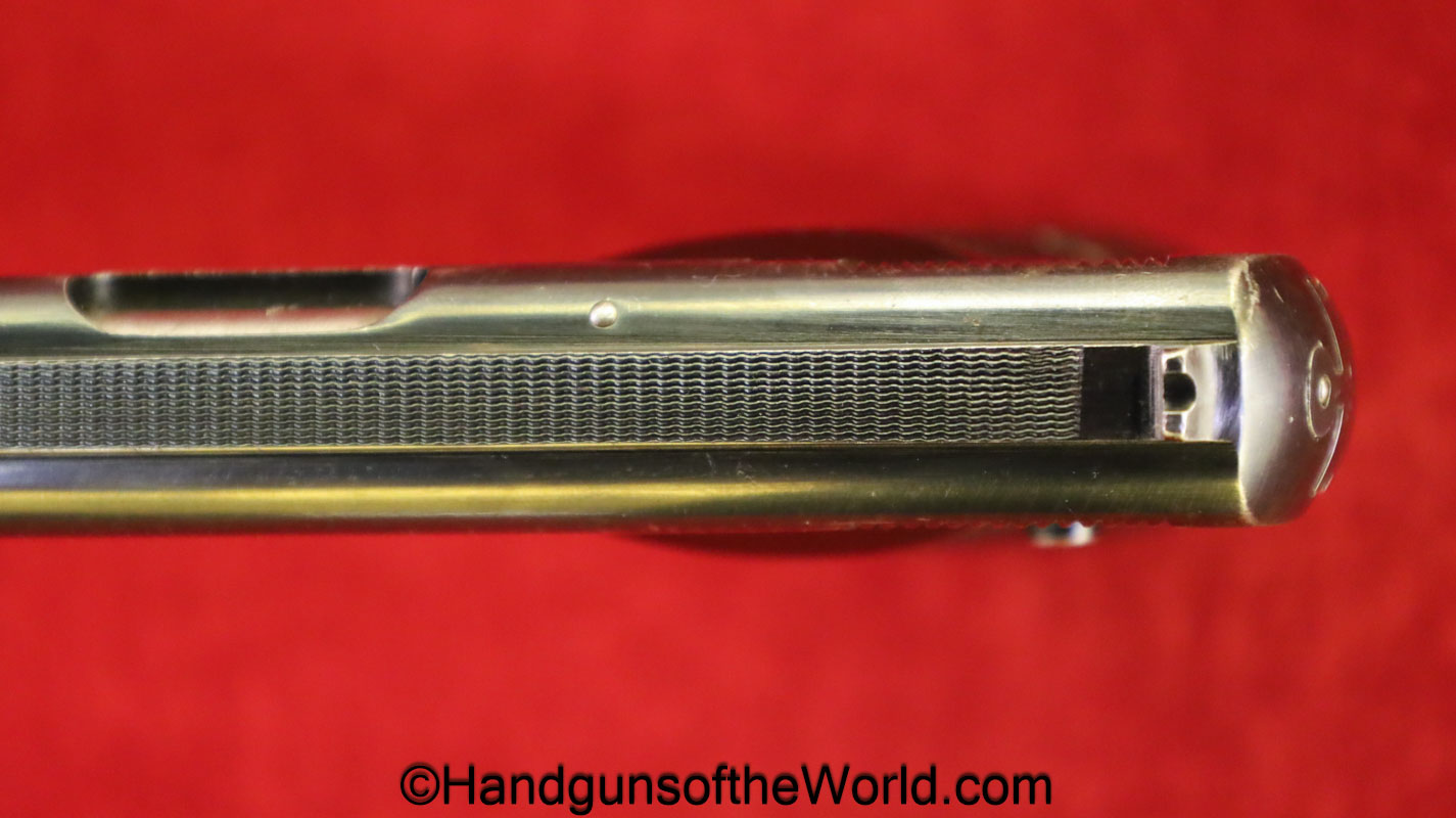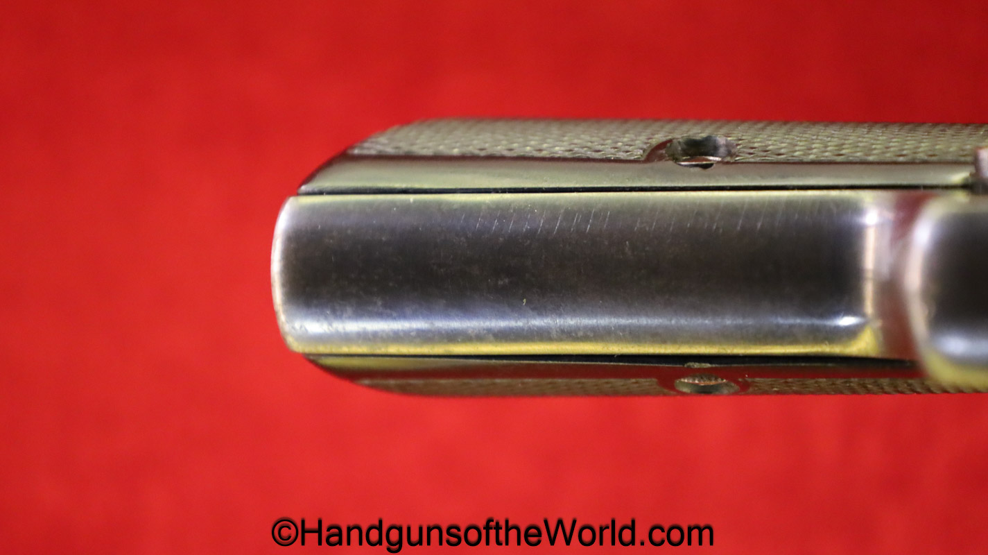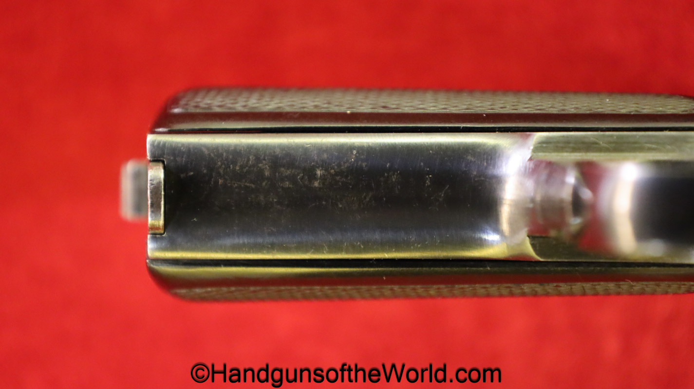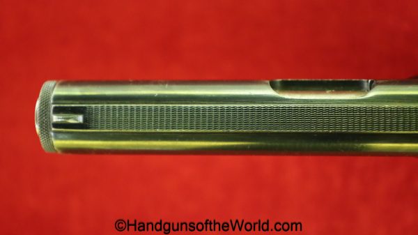 Kommer Model IV, 7.65mm. This is German Eagle N proofed on the frame, slide and barrel. This has the proper plain checkered black Bakelite grips. The blue rates about 97% and the bore is excellent.