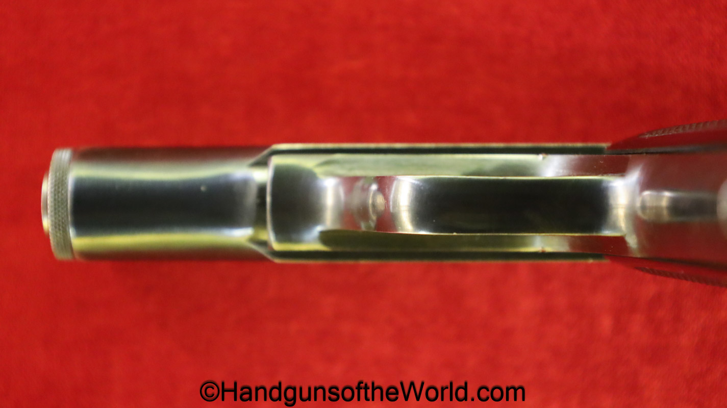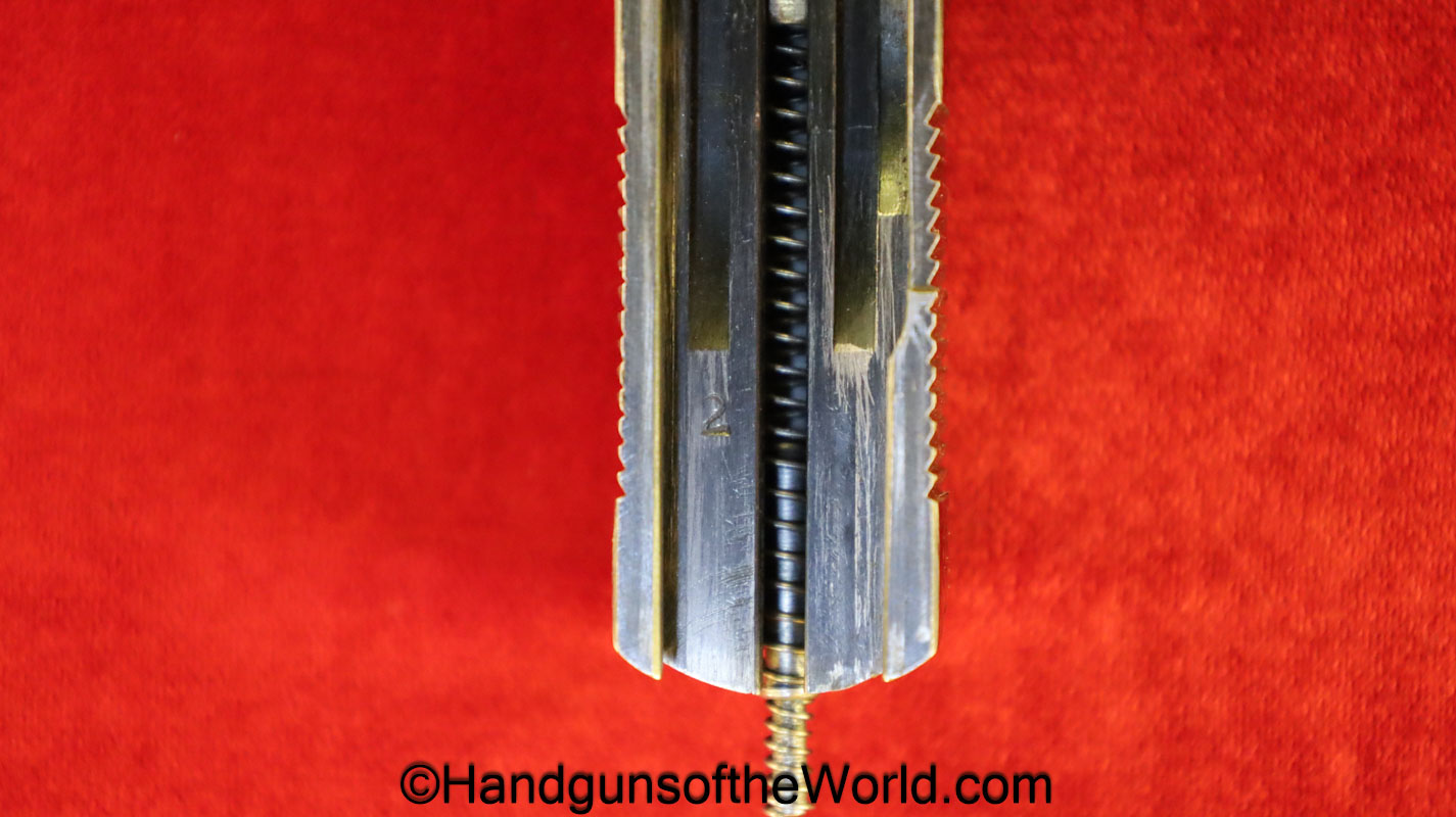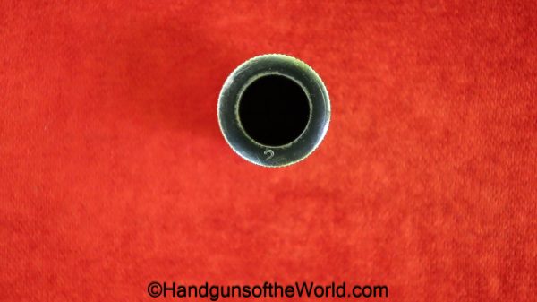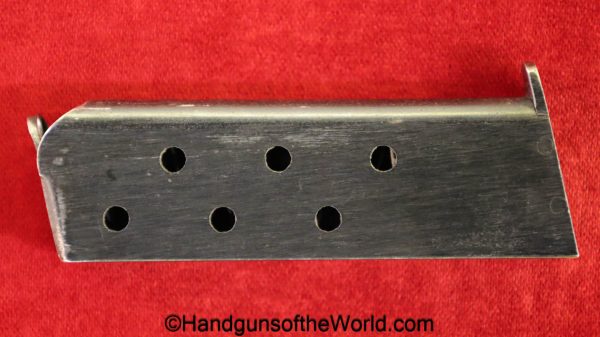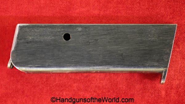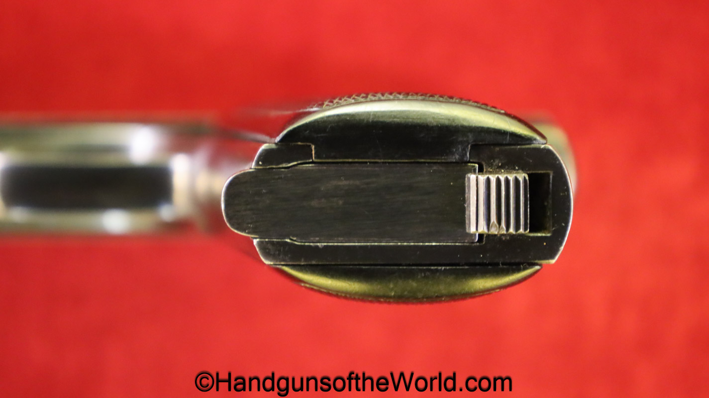 Kommer Model IV, 7.65mm. This is German Eagle N proofed on the frame, slide and barrel. This has the proper plain checkered black Bakelite grips. The blue rates about 97% and the bore is excellent.
