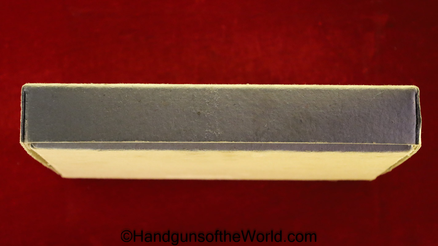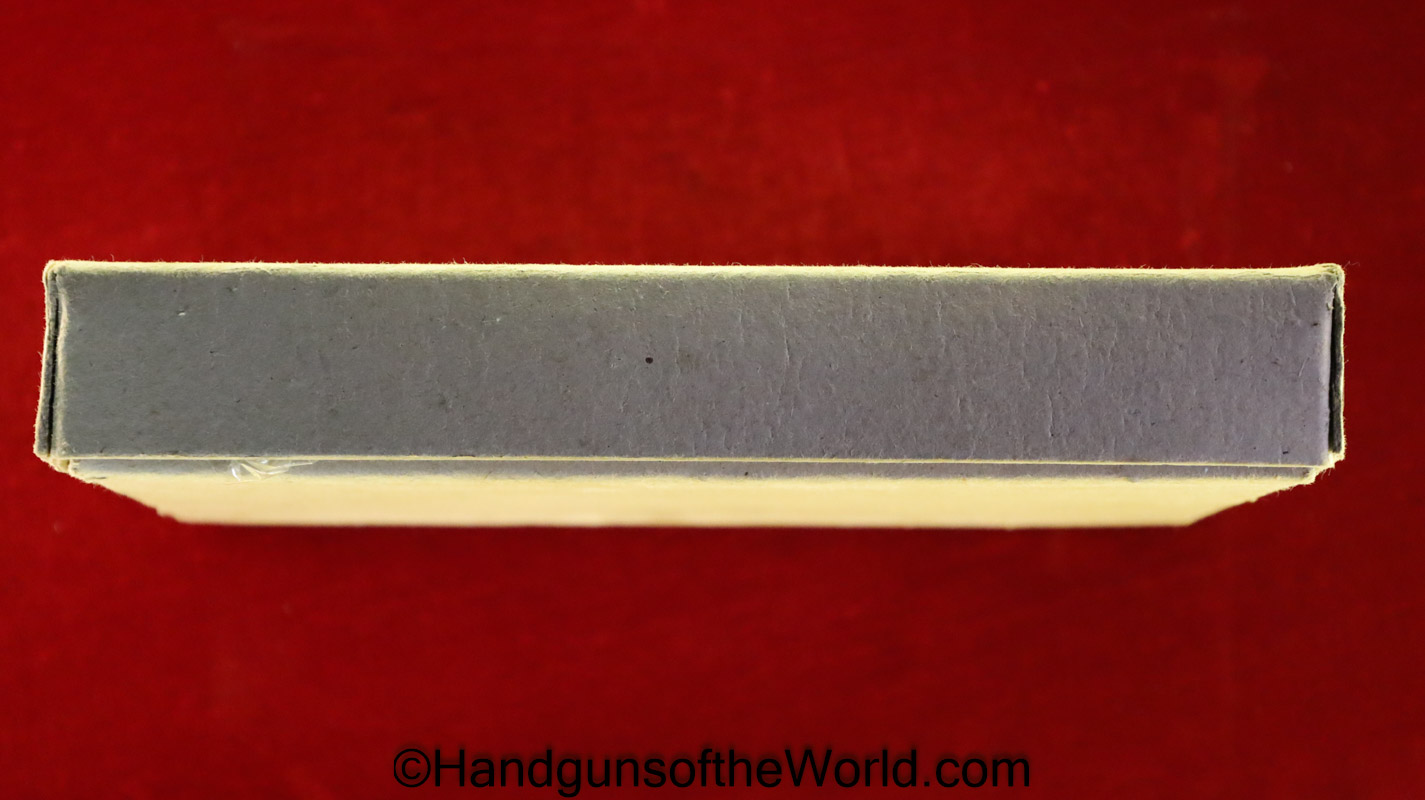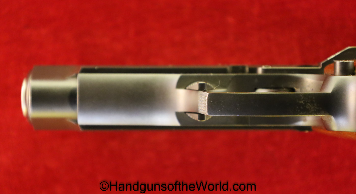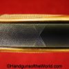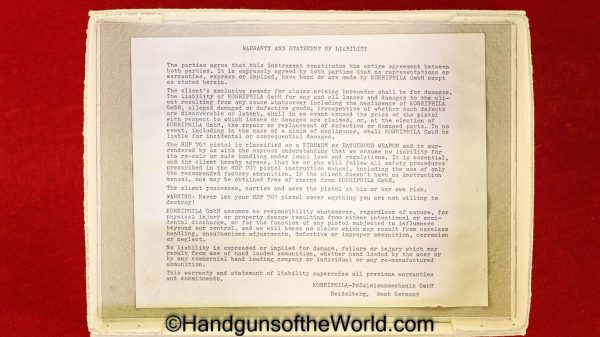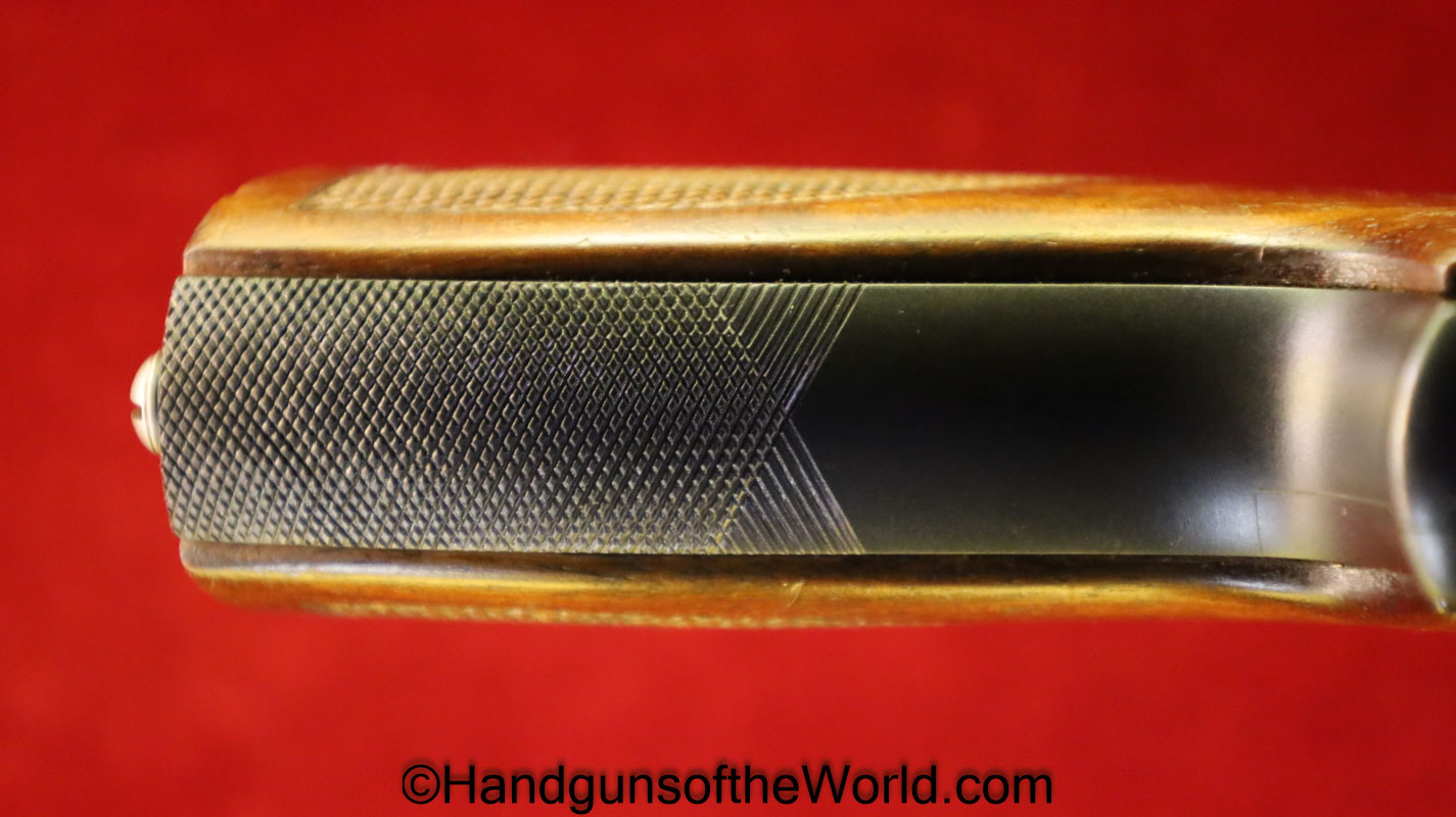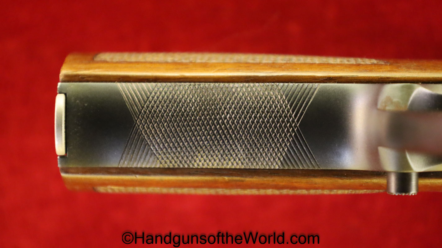 Korriphila HSP 701, 9mm. This is German proof/dated 1988 on the right frame. This has a 4″ barrel and is Single Action/Double Action. This has checkered walnut grips, checkered front and rear grip straps and a standard rear sight. This has 99% blue-many handling marks and an excellent bore. This has its original, brown cardboard box with warranties in the base and lid.