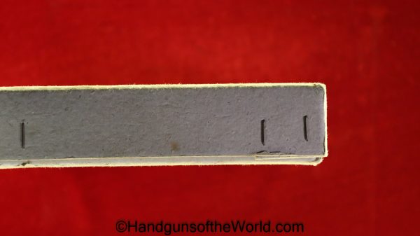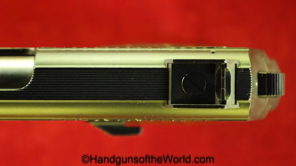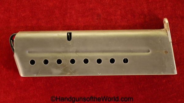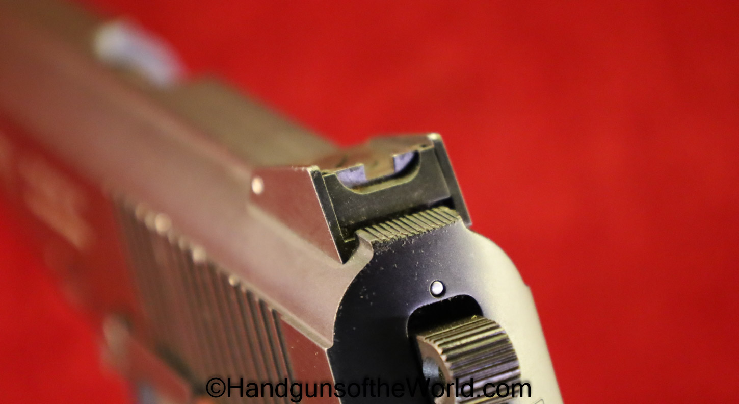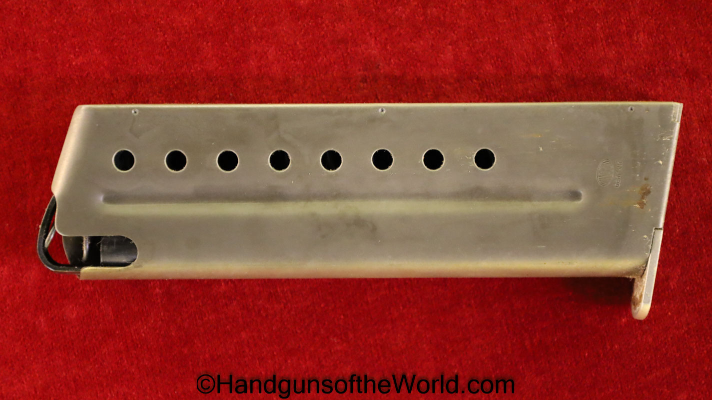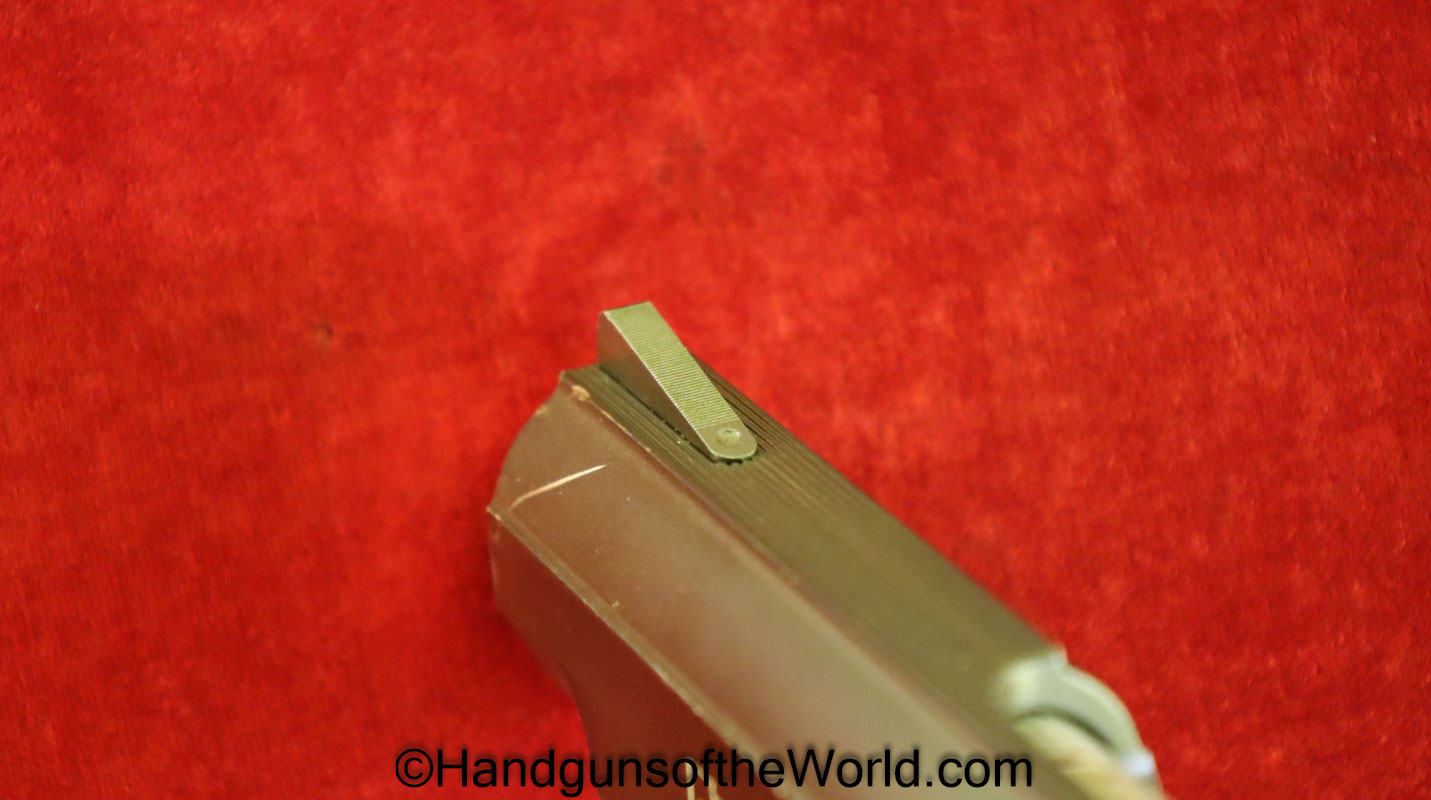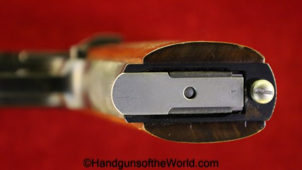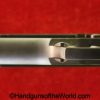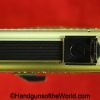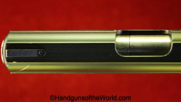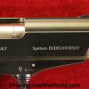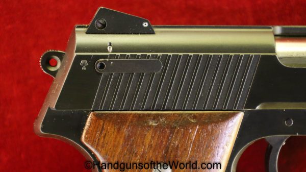 Korriphila HSP 701, 9mm. This is German proof/dated 1988 on the right frame. This has a 4″ barrel and is Single Action/Double Action. This has checkered walnut grips, checkered front and rear grip straps and a standard rear sight. This has 99% blue-many handling marks and an excellent bore. This has its original, brown cardboard box with warranties in the base and lid.