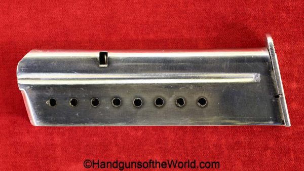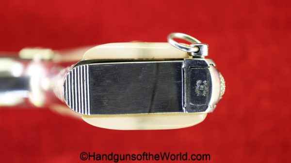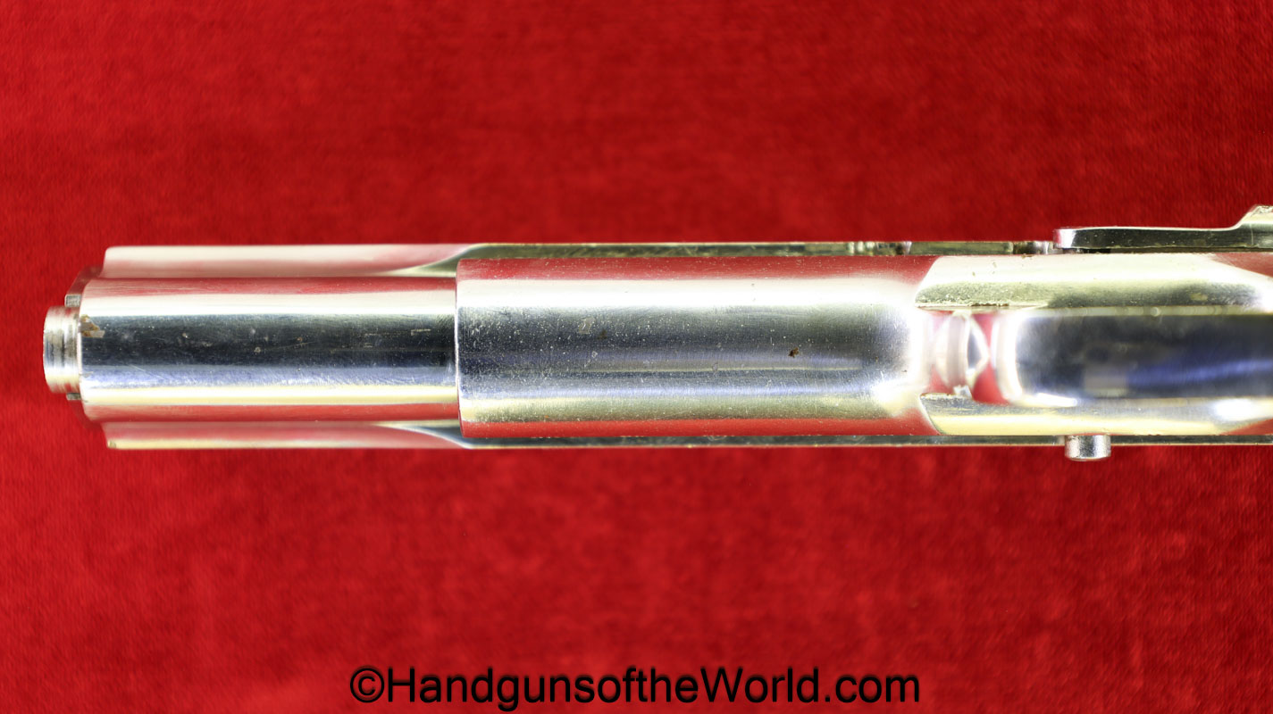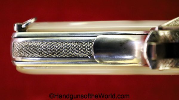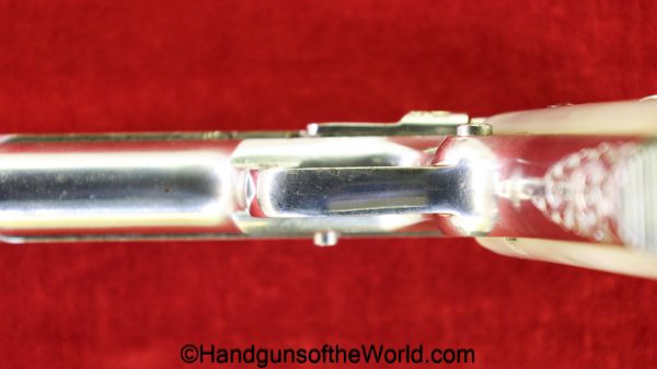 Llama VIII, 9mm Largo. Built in 1961 this is Spanish proof dated 1961. This has deep factory engraving and white pearlite grips with Llama medallions. This retains about 98% factory nickel and the bore is excellent. The front sight adjusted some, so as not to catch upon removal from a holster.