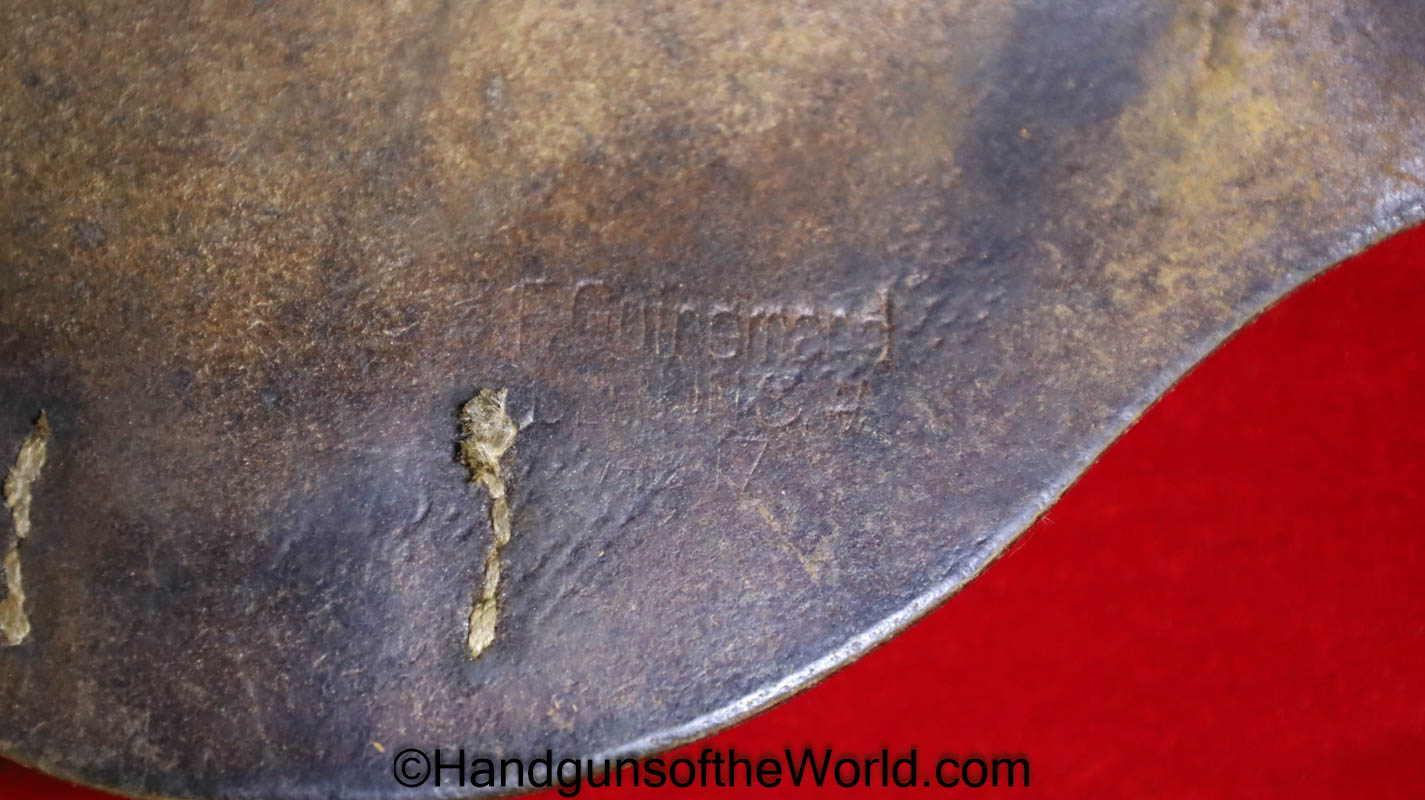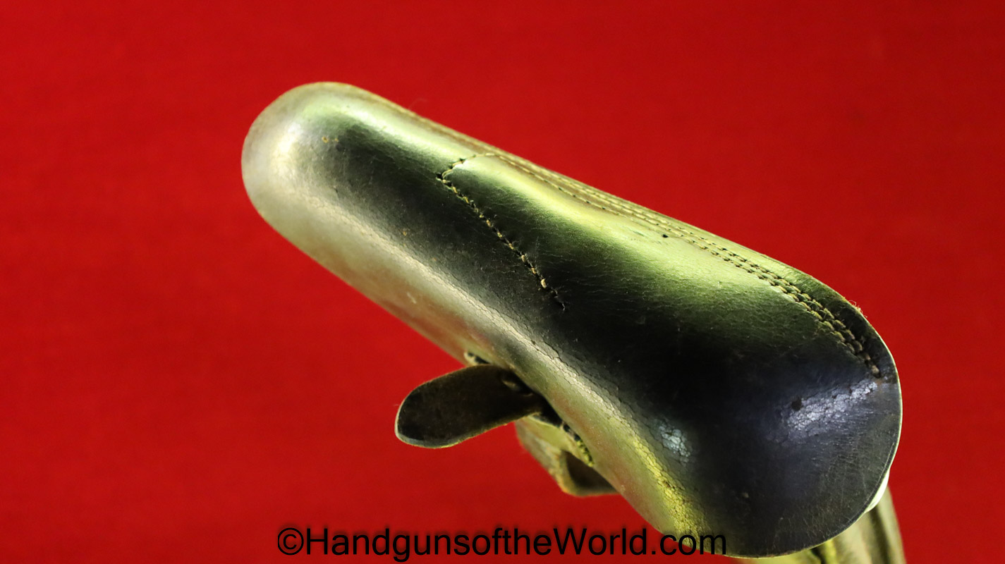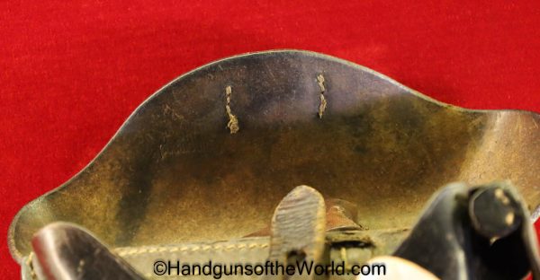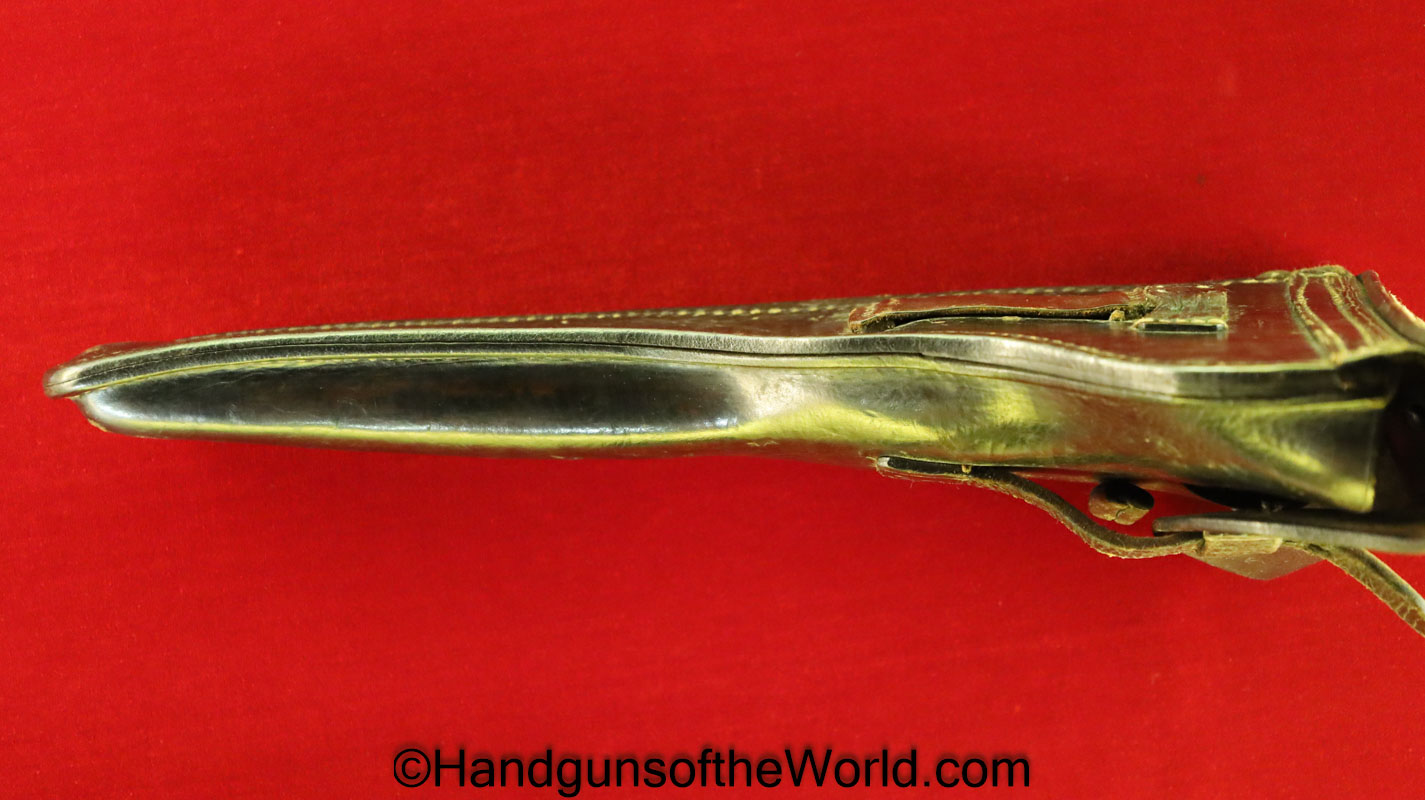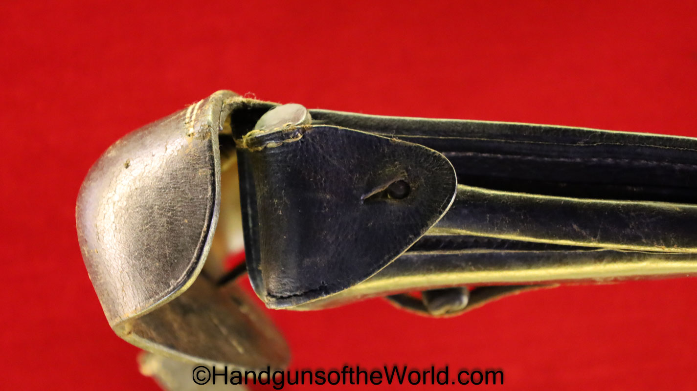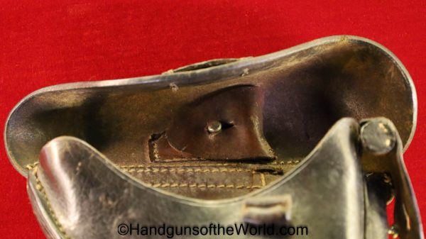 Original German Luger P.08 Artillery Pistol Holster. Black leather hard shell, maker marked and dated 1917 inside the lid. This has a nicely replaced tab keeper-the tab is enlarged some, and has been converted to belt usage.