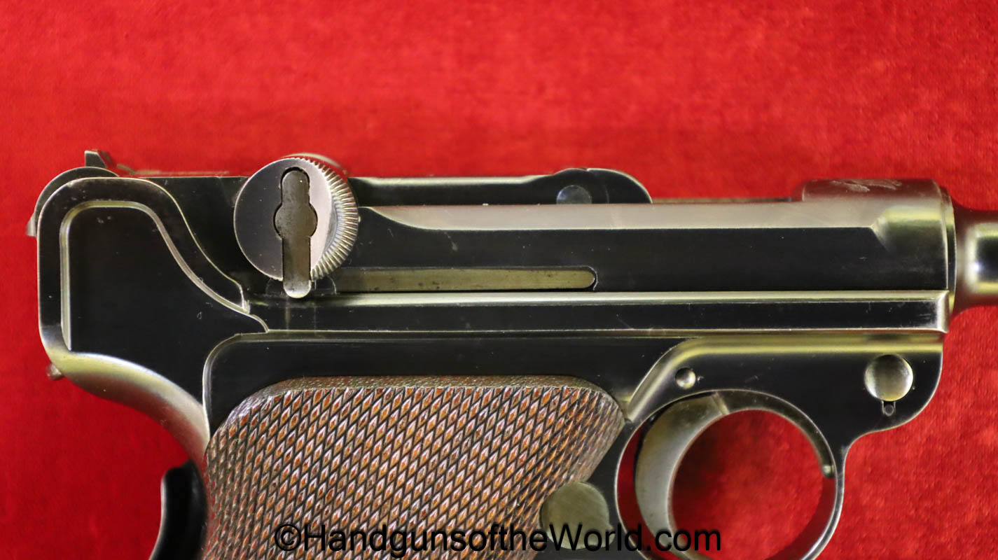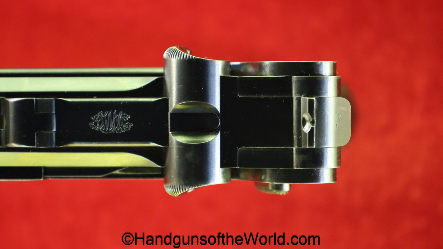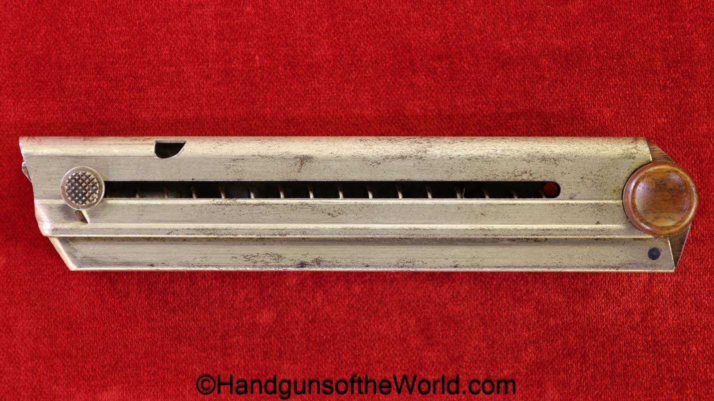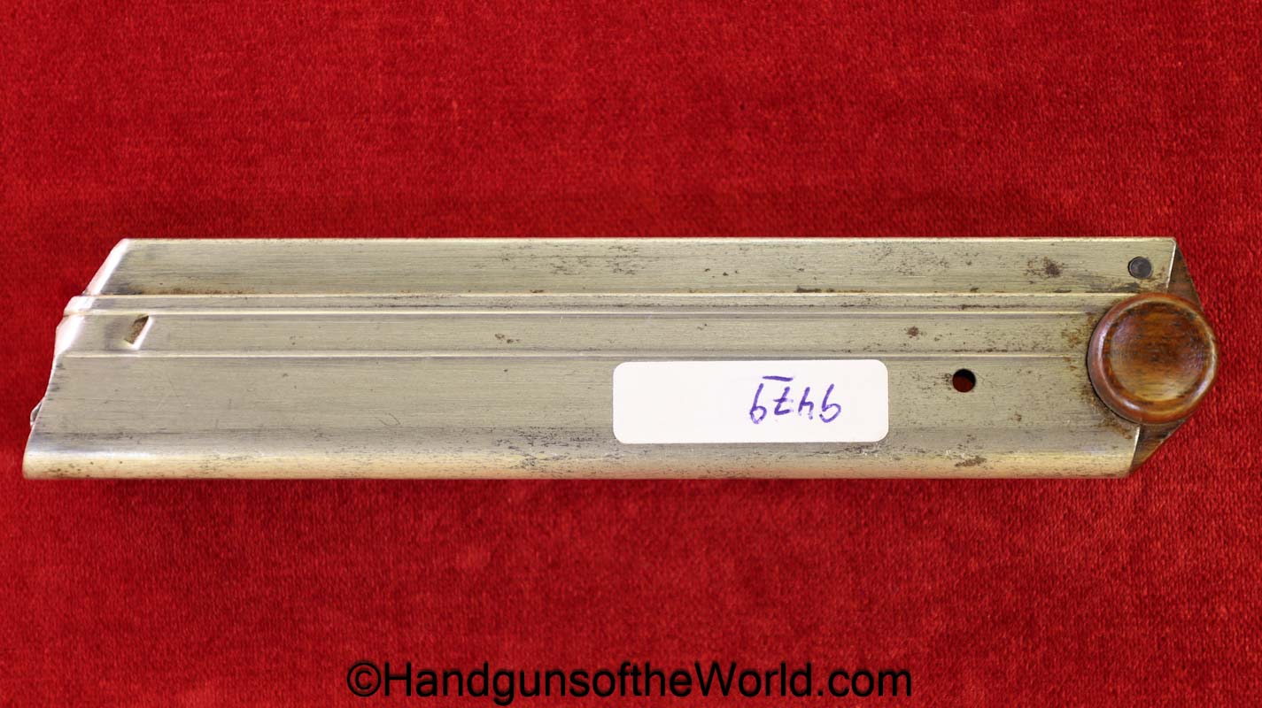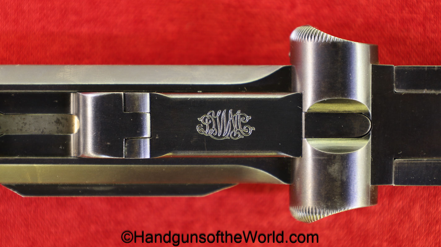 DWM 1900 America Eagle, 7.65mm Parabellum. This has the checkered walnut grips, and is Not German BUG proofed, but is marked Germany on the forward frame. This has all matching numbers, and No importer markings. The wooden base magazine is marked Germany on the bottom. The blue rates about 98% and the bore is Fair.