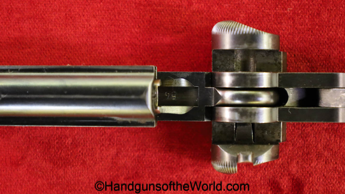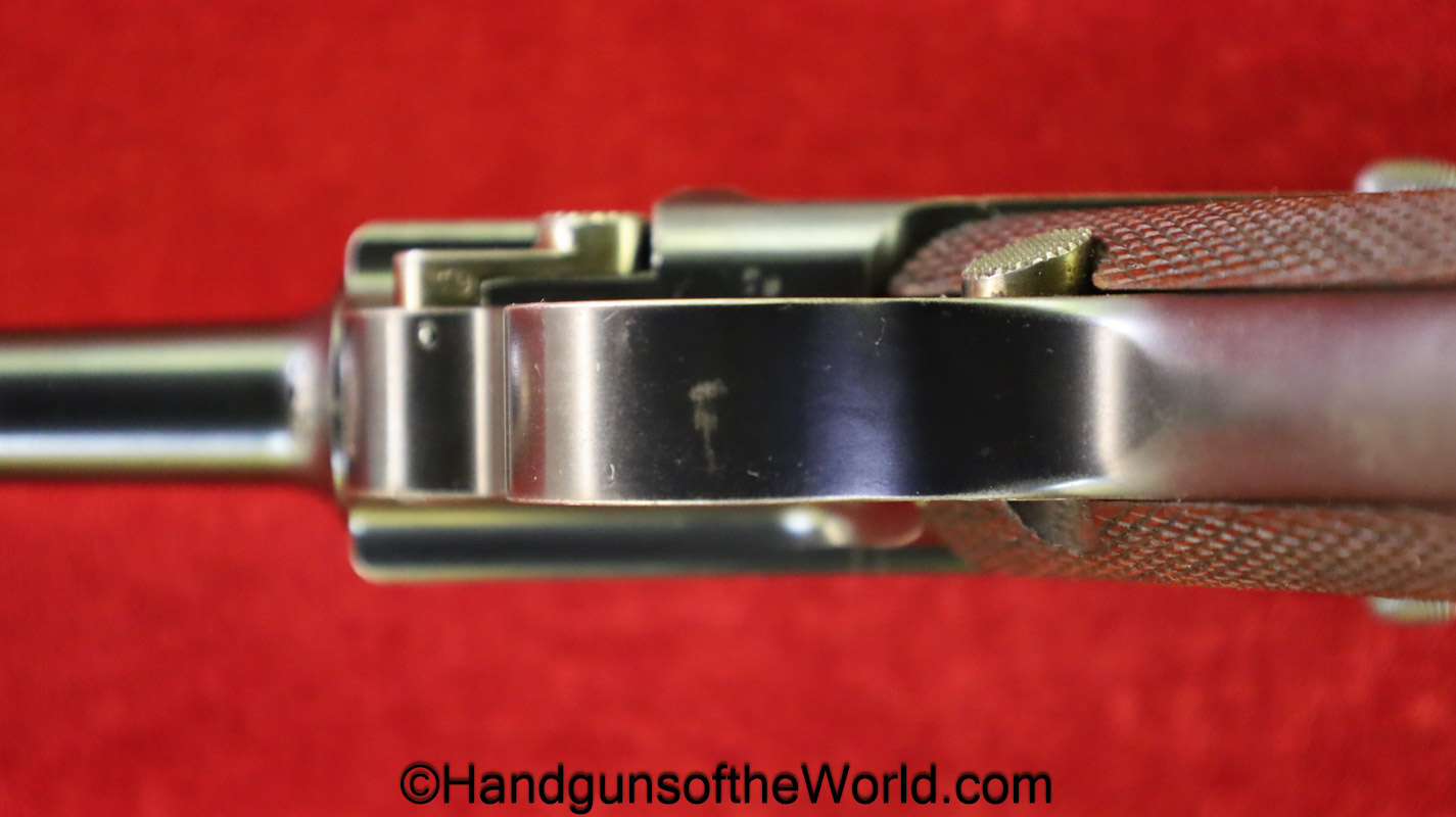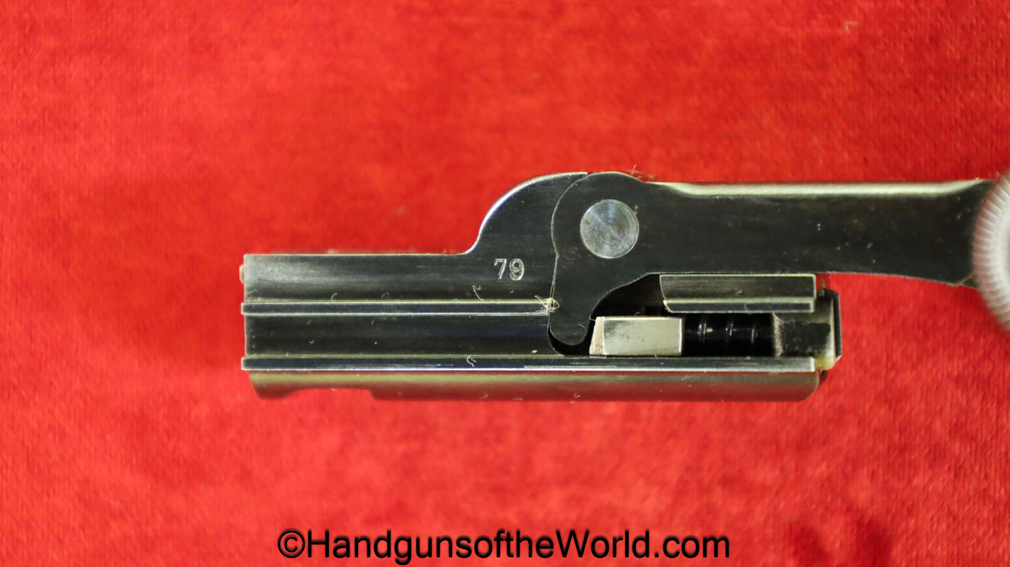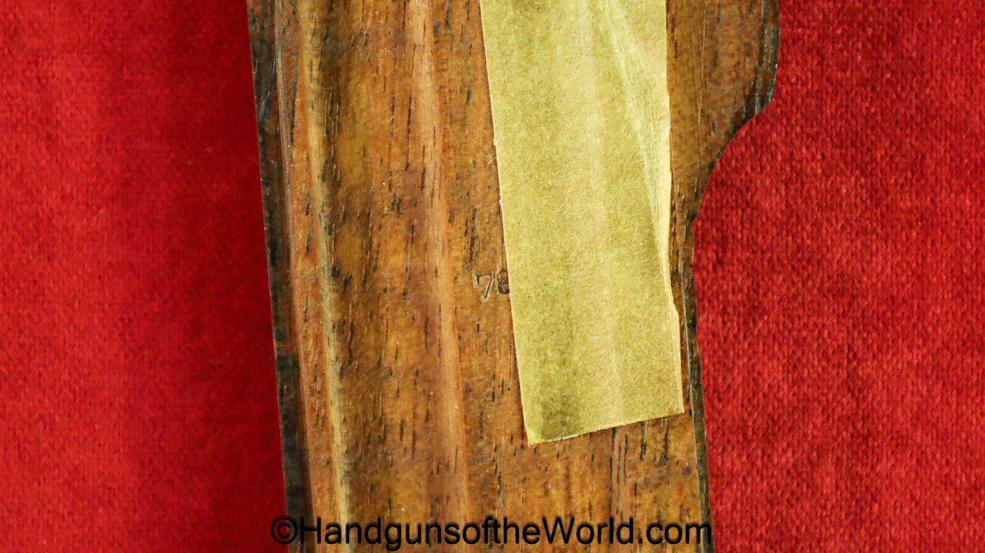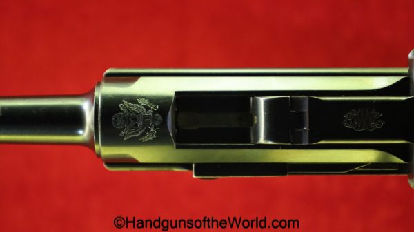 DWM 1900 America Eagle, 7.65mm Parabellum. This has the checkered walnut grips, and is Not German BUG proofed, but is marked Germany on the forward frame. This has all matching numbers, and No importer markings. The wooden base magazine is marked Germany on the bottom. The blue rates about 98% and the bore is Fair.